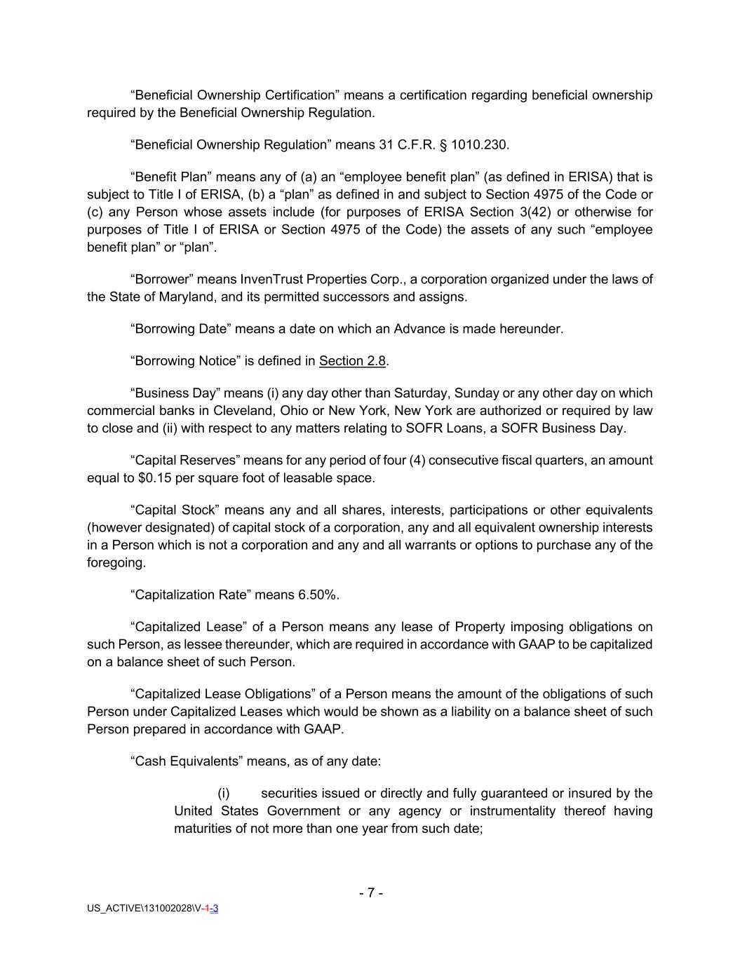 - 7 - US_ACTIVE\131002028\V-1-3 “Beneficial Ownership Certification” means a certification regarding beneficial ownership required by the Beneficial Ownership Regulation. “Beneficial Ownership Regulation” means 31 C.F.R. § 1010.230. “Benefit Plan” means any of (a) an “employee benefit plan” (as defined in ERISA) that is subject to Title I of ERISA, (b) a “plan” as defined in and subject to Section 4975 of the Code or (c) any Person whose assets include (for purposes of ERISA Section 3(42) or otherwise for purposes of Title I of ERISA or Section 4975 of the Code) the assets of any such “employee benefit plan” or “plan”. “Borrower” means InvenTrust Properties Corp., a corporation organized under the laws of the State of Maryland, and its permitted successors and assigns. “Borrowing Date” means a date on which an Advance is made hereunder. “Borrowing Notice” is defined in Section 2.8. “Business Day” means (i) any day other than Saturday, Sunday or any other day on which commercial banks in Cleveland, Ohio or New York, New York are authorized or required by law to close and (ii) with respect to any matters relating to SOFR Loans, a SOFR Business Day. “Capital Reserves” means for any period of four (4) consecutive fiscal quarters, an amount equal to $0.15 per square foot of leasable space. “Capital Stock” means any and all shares, interests, participations or other equivalents (however designated) of capital stock of a corporation, any and all equivalent ownership interests in a Person which is not a corporation and any and all warrants or options to purchase any of the foregoing. “Capitalization Rate” means 6.50%. “Capitalized Lease” of a Person means any lease of Property imposing obligations on such Person, as lessee thereunder, which are required in accordance with GAAP to be capitalized on a balance sheet of such Person. “Capitalized Lease Obligations” of a Person means the amount of the obligations of such Person under Capitalized Leases which would be shown as a liability on a balance sheet of such Person prepared in accordance with GAAP. “Cash Equivalents” means, as of any date: (i) securities issued or directly and fully guaranteed or insured by the United States Government or any agency or instrumentality thereof having maturities of not more than one year from such date;
