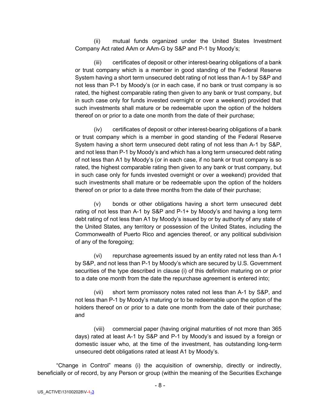 - 8 - US_ACTIVE\131002028\V-1-3 (ii) mutual funds organized under the United States Investment Company Act rated AAm or AAm-G by S&P and P-1 by Moody’s; (iii) certificates of deposit or other interest-bearing obligations of a bank or trust company which is a member in good standing of the Federal Reserve System having a short term unsecured debt rating of not less than A-1 by S&P and not less than P-1 by Moody’s (or in each case, if no bank or trust company is so rated, the highest comparable rating then given to any bank or trust company, but in such case only for funds invested overnight or over a weekend) provided that such investments shall mature or be redeemable upon the option of the holders thereof on or prior to a date one month from the date of their purchase; (iv) certificates of deposit or other interest-bearing obligations of a bank or trust company which is a member in good standing of the Federal Reserve System having a short term unsecured debt rating of not less than A-1 by S&P, and not less than P-1 by Moody’s and which has a long term unsecured debt rating of not less than A1 by Moody’s (or in each case, if no bank or trust company is so rated, the highest comparable rating then given to any bank or trust company, but in such case only for funds invested overnight or over a weekend) provided that such investments shall mature or be redeemable upon the option of the holders thereof on or prior to a date three months from the date of their purchase; (v) bonds or other obligations having a short term unsecured debt rating of not less than A-1 by S&P and P-1+ by Moody’s and having a long term debt rating of not less than A1 by Moody’s issued by or by authority of any state of the United States, any territory or possession of the United States, including the Commonwealth of Puerto Rico and agencies thereof, or any political subdivision of any of the foregoing; (vi) repurchase agreements issued by an entity rated not less than A-1 by S&P, and not less than P-1 by Moody’s which are secured by U.S. Government securities of the type described in clause (i) of this definition maturing on or prior to a date one month from the date the repurchase agreement is entered into; (vii) short term promissory notes rated not less than A-1 by S&P, and not less than P-1 by Moody’s maturing or to be redeemable upon the option of the holders thereof on or prior to a date one month from the date of their purchase; and (viii) commercial paper (having original maturities of not more than 365 days) rated at least A-1 by S&P and P-1 by Moody’s and issued by a foreign or domestic issuer who, at the time of the investment, has outstanding long-term unsecured debt obligations rated at least A1 by Moody’s. “Change in Control” means (i) the acquisition of ownership, directly or indirectly, beneficially or of record, by any Person or group (within the meaning of the Securities Exchange