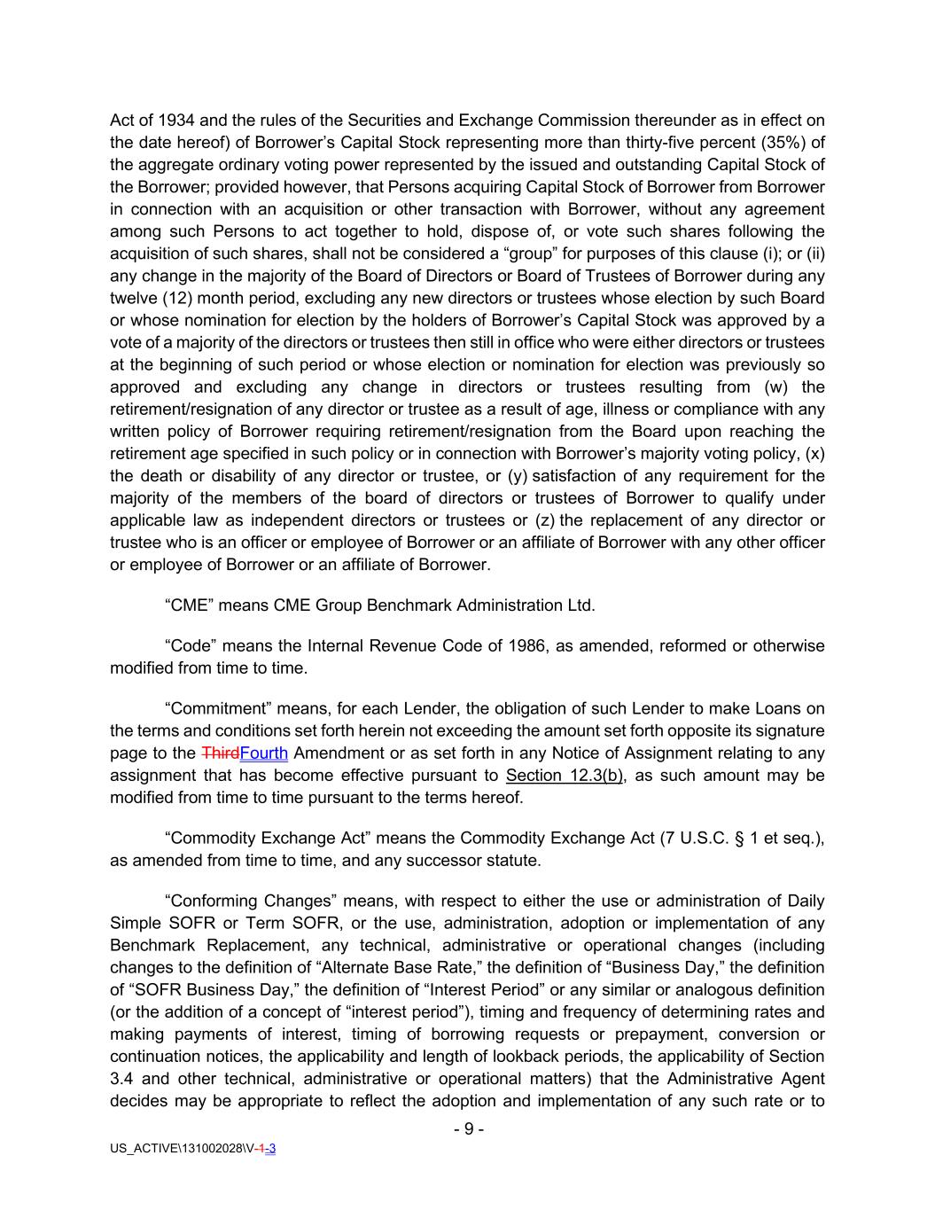- 9 - US_ACTIVE\131002028\V-1-3 Act of 1934 and the rules of the Securities and Exchange Commission thereunder as in effect on the date hereof) of Borrower’s Capital Stock representing more than thirty-five percent (35%) of the aggregate ordinary voting power represented by the issued and outstanding Capital Stock of the Borrower; provided however, that Persons acquiring Capital Stock of Borrower from Borrower in connection with an acquisition or other transaction with Borrower, without any agreement among such Persons to act together to hold, dispose of, or vote such shares following the acquisition of such shares, shall not be considered a “group” for purposes of this clause (i); or (ii) any change in the majority of the Board of Directors or Board of Trustees of Borrower during any twelve (12) month period, excluding any new directors or trustees whose election by such Board or whose nomination for election by the holders of Borrower’s Capital Stock was approved by a vote of a majority of the directors or trustees then still in office who were either directors or trustees at the beginning of such period or whose election or nomination for election was previously so approved and excluding any change in directors or trustees resulting from (w) the retirement/resignation of any director or trustee as a result of age, illness or compliance with any written policy of Borrower requiring retirement/resignation from the Board upon reaching the retirement age specified in such policy or in connection with Borrower’s majority voting policy, (x) the death or disability of any director or trustee, or (y) satisfaction of any requirement for the majority of the members of the board of directors or trustees of Borrower to qualify under applicable law as independent directors or trustees or (z) the replacement of any director or trustee who is an officer or employee of Borrower or an affiliate of Borrower with any other officer or employee of Borrower or an affiliate of Borrower. “CME” means CME Group Benchmark Administration Ltd. “Code” means the Internal Revenue Code of 1986, as amended, reformed or otherwise modified from time to time. “Commitment” means, for each Lender, the obligation of such Lender to make Loans on the terms and conditions set forth herein not exceeding the amount set forth opposite its signature page to the ThirdFourth Amendment or as set forth in any Notice of Assignment relating to any assignment that has become effective pursuant to Section 12.3(b), as such amount may be modified from time to time pursuant to the terms hereof. “Commodity Exchange Act” means the Commodity Exchange Act (7 U.S.C. § 1 et seq.), as amended from time to time, and any successor statute. “Conforming Changes” means, with respect to either the use or administration of Daily Simple SOFR or Term SOFR, or the use, administration, adoption or implementation of any Benchmark Replacement, any technical, administrative or operational changes (including changes to the definition of “Alternate Base Rate,” the definition of “Business Day,” the definition of “SOFR Business Day,” the definition of “Interest Period” or any similar or analogous definition (or the addition of a concept of “interest period”), timing and frequency of determining rates and making payments of interest, timing of borrowing requests or prepayment, conversion or continuation notices, the applicability and length of lookback periods, the applicability of Section 3.4 and other technical, administrative or operational matters) that the Administrative Agent decides may be appropriate to reflect the adoption and implementation of any such rate or to