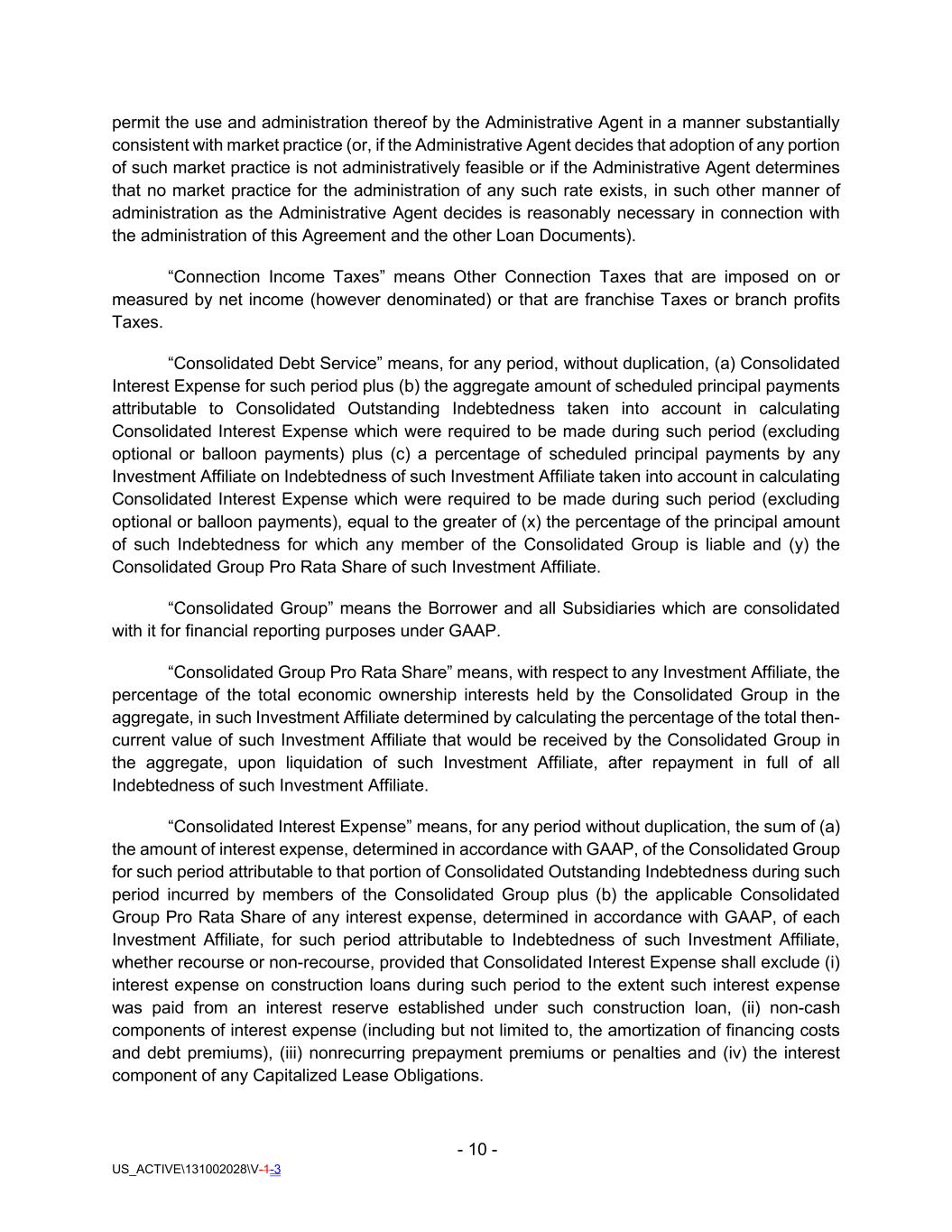 - 10 - US_ACTIVE\131002028\V-1-3 permit the use and administration thereof by the Administrative Agent in a manner substantially consistent with market practice (or, if the Administrative Agent decides that adoption of any portion of such market practice is not administratively feasible or if the Administrative Agent determines that no market practice for the administration of any such rate exists, in such other manner of administration as the Administrative Agent decides is reasonably necessary in connection with the administration of this Agreement and the other Loan Documents). “Connection Income Taxes” means Other Connection Taxes that are imposed on or measured by net income (however denominated) or that are franchise Taxes or branch profits Taxes. “Consolidated Debt Service” means, for any period, without duplication, (a) Consolidated Interest Expense for such period plus (b) the aggregate amount of scheduled principal payments attributable to Consolidated Outstanding Indebtedness taken into account in calculating Consolidated Interest Expense which were required to be made during such period (excluding optional or balloon payments) plus (c) a percentage of scheduled principal payments by any Investment Affiliate on Indebtedness of such Investment Affiliate taken into account in calculating Consolidated Interest Expense which were required to be made during such period (excluding optional or balloon payments), equal to the greater of (x) the percentage of the principal amount of such Indebtedness for which any member of the Consolidated Group is liable and (y) the Consolidated Group Pro Rata Share of such Investment Affiliate. “Consolidated Group” means the Borrower and all Subsidiaries which are consolidated with it for financial reporting purposes under GAAP. “Consolidated Group Pro Rata Share” means, with respect to any Investment Affiliate, the percentage of the total economic ownership interests held by the Consolidated Group in the aggregate, in such Investment Affiliate determined by calculating the percentage of the total then- current value of such Investment Affiliate that would be received by the Consolidated Group in the aggregate, upon liquidation of such Investment Affiliate, after repayment in full of all Indebtedness of such Investment Affiliate. “Consolidated Interest Expense” means, for any period without duplication, the sum of (a) the amount of interest expense, determined in accordance with GAAP, of the Consolidated Group for such period attributable to that portion of Consolidated Outstanding Indebtedness during such period incurred by members of the Consolidated Group plus (b) the applicable Consolidated Group Pro Rata Share of any interest expense, determined in accordance with GAAP, of each Investment Affiliate, for such period attributable to Indebtedness of such Investment Affiliate, whether recourse or non-recourse, provided that Consolidated Interest Expense shall exclude (i) interest expense on construction loans during such period to the extent such interest expense was paid from an interest reserve established under such construction loan, (ii) non-cash components of interest expense (including but not limited to, the amortization of financing costs and debt premiums), (iii) nonrecurring prepayment premiums or penalties and (iv) the interest component of any Capitalized Lease Obligations.