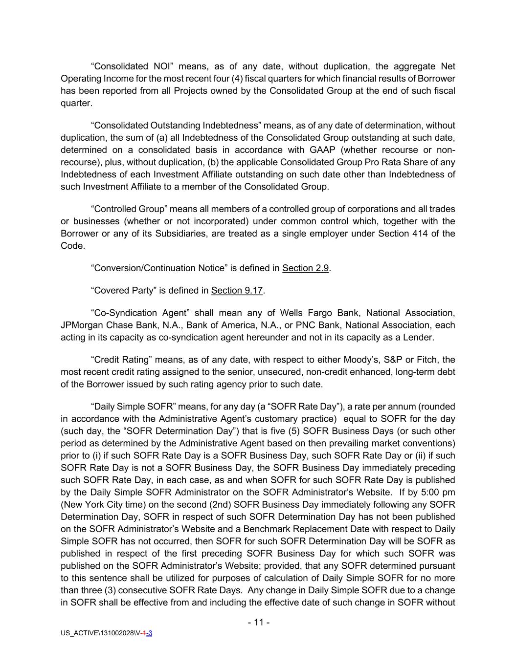 - 11 - US_ACTIVE\131002028\V-1-3 “Consolidated NOI” means, as of any date, without duplication, the aggregate Net Operating Income for the most recent four (4) fiscal quarters for which financial results of Borrower has been reported from all Projects owned by the Consolidated Group at the end of such fiscal quarter. “Consolidated Outstanding Indebtedness” means, as of any date of determination, without duplication, the sum of (a) all Indebtedness of the Consolidated Group outstanding at such date, determined on a consolidated basis in accordance with GAAP (whether recourse or non- recourse), plus, without duplication, (b) the applicable Consolidated Group Pro Rata Share of any Indebtedness of each Investment Affiliate outstanding on such date other than Indebtedness of such Investment Affiliate to a member of the Consolidated Group. “Controlled Group” means all members of a controlled group of corporations and all trades or businesses (whether or not incorporated) under common control which, together with the Borrower or any of its Subsidiaries, are treated as a single employer under Section 414 of the Code. “Conversion/Continuation Notice” is defined in Section 2.9. “Covered Party” is defined in Section 9.17. “Co-Syndication Agent” shall mean any of Wells Fargo Bank, National Association, JPMorgan Chase Bank, N.A., Bank of America, N.A., or PNC Bank, National Association, each acting in its capacity as co-syndication agent hereunder and not in its capacity as a Lender. “Credit Rating” means, as of any date, with respect to either Moody’s, S&P or Fitch, the most recent credit rating assigned to the senior, unsecured, non-credit enhanced, long-term debt of the Borrower issued by such rating agency prior to such date. “Daily Simple SOFR” means, for any day (a “SOFR Rate Day”), a rate per annum (rounded in accordance with the Administrative Agent’s customary practice) equal to SOFR for the day (such day, the “SOFR Determination Day”) that is five (5) SOFR Business Days (or such other period as determined by the Administrative Agent based on then prevailing market conventions) prior to (i) if such SOFR Rate Day is a SOFR Business Day, such SOFR Rate Day or (ii) if such SOFR Rate Day is not a SOFR Business Day, the SOFR Business Day immediately preceding such SOFR Rate Day, in each case, as and when SOFR for such SOFR Rate Day is published by the Daily Simple SOFR Administrator on the SOFR Administrator’s Website. If by 5:00 pm (New York City time) on the second (2nd) SOFR Business Day immediately following any SOFR Determination Day, SOFR in respect of such SOFR Determination Day has not been published on the SOFR Administrator’s Website and a Benchmark Replacement Date with respect to Daily Simple SOFR has not occurred, then SOFR for such SOFR Determination Day will be SOFR as published in respect of the first preceding SOFR Business Day for which such SOFR was published on the SOFR Administrator’s Website; provided, that any SOFR determined pursuant to this sentence shall be utilized for purposes of calculation of Daily Simple SOFR for no more than three (3) consecutive SOFR Rate Days. Any change in Daily Simple SOFR due to a change in SOFR shall be effective from and including the effective date of such change in SOFR without