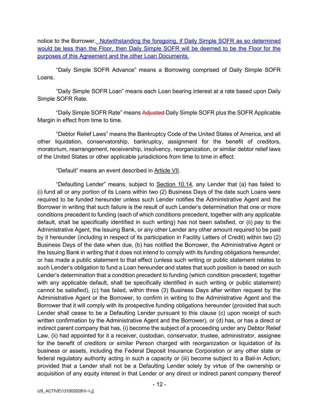 - 12 - US_ACTIVE\131002028\V-1-3 notice to the Borrower. Notwithstanding the foregoing, if Daily Simple SOFR as so determined would be less than the Floor, then Daily Simple SOFR will be deemed to be the Floor for the purposes of this Agreement and the other Loan Documents. “Daily Simple SOFR Advance” means a Borrowing comprised of Daily Simple SOFR Loans. “Daily Simple SOFR Loan” means each Loan bearing interest at a rate based upon Daily Simple SOFR Rate. “Daily Simple SOFR Rate” means Adjusted Daily Simple SOFR plus the SOFR Applicable Margin in effect from time to time. “Debtor Relief Laws” means the Bankruptcy Code of the United States of America, and all other liquidation, conservatorship, bankruptcy, assignment for the benefit of creditors, moratorium, rearrangement, receivership, insolvency, reorganization, or similar debtor relief laws of the United States or other applicable jurisdictions from time to time in effect. “Default” means an event described in Article VII. “Defaulting Lender” means, subject to Section 10.14, any Lender that (a) has failed to (i) fund all or any portion of its Loans within two (2) Business Days of the date such Loans were required to be funded hereunder unless such Lender notifies the Administrative Agent and the Borrower in writing that such failure is the result of such Lender’s determination that one or more conditions precedent to funding (each of which conditions precedent, together with any applicable default, shall be specifically identified in such writing) has not been satisfied, or (ii) pay to the Administrative Agent, the Issuing Bank, or any other Lender any other amount required to be paid by it hereunder (including in respect of its participation in Facility Letters of Credit) within two (2) Business Days of the date when due, (b) has notified the Borrower, the Administrative Agent or the Issuing Bank in writing that it does not intend to comply with its funding obligations hereunder, or has made a public statement to that effect (unless such writing or public statement relates to such Lender’s obligation to fund a Loan hereunder and states that such position is based on such Lender’s determination that a condition precedent to funding (which condition precedent, together with any applicable default, shall be specifically identified in such writing or public statement) cannot be satisfied), (c) has failed, within three (3) Business Days after written request by the Administrative Agent or the Borrower, to confirm in writing to the Administrative Agent and the Borrower that it will comply with its prospective funding obligations hereunder (provided that such Lender shall cease to be a Defaulting Lender pursuant to this clause (c) upon receipt of such written confirmation by the Administrative Agent and the Borrower), or (d) has, or has a direct or indirect parent company that has, (i) become the subject of a proceeding under any Debtor Relief Law, (ii) had appointed for it a receiver, custodian, conservator, trustee, administrator, assignee for the benefit of creditors or similar Person charged with reorganization or liquidation of its business or assets, including the Federal Deposit Insurance Corporation or any other state or federal regulatory authority acting in such a capacity or (iii) become subject to a Bail-in Action; provided that a Lender shall not be a Defaulting Lender solely by virtue of the ownership or acquisition of any equity interest in that Lender or any direct or indirect parent company thereof