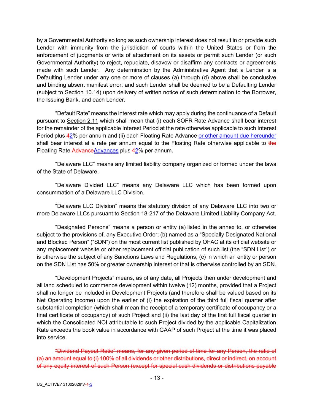 - 13 - US_ACTIVE\131002028\V-1-3 by a Governmental Authority so long as such ownership interest does not result in or provide such Lender with immunity from the jurisdiction of courts within the United States or from the enforcement of judgments or writs of attachment on its assets or permit such Lender (or such Governmental Authority) to reject, repudiate, disavow or disaffirm any contracts or agreements made with such Lender. Any determination by the Administrative Agent that a Lender is a Defaulting Lender under any one or more of clauses (a) through (d) above shall be conclusive and binding absent manifest error, and such Lender shall be deemed to be a Defaulting Lender (subject to Section 10.14) upon delivery of written notice of such determination to the Borrower, the Issuing Bank, and each Lender. “Default Rate” means the interest rate which may apply during the continuance of a Default pursuant to Section 2.11 which shall mean that (i) each SOFR Rate Advance shall bear interest for the remainder of the applicable Interest Period at the rate otherwise applicable to such Interest Period plus 42% per annum and (ii) each Floating Rate Advance or other amount due hereunder shall bear interest at a rate per annum equal to the Floating Rate otherwise applicable to the Floating Rate AdvanceAdvances plus 42% per annum. “Delaware LLC” means any limited liability company organized or formed under the laws of the State of Delaware. “Delaware Divided LLC” means any Delaware LLC which has been formed upon consummation of a Delaware LLC Division. “Delaware LLC Division” means the statutory division of any Delaware LLC into two or more Delaware LLCs pursuant to Section 18-217 of the Delaware Limited Liability Company Act. “Designated Persons” means a person or entity (a) listed in the annex to, or otherwise subject to the provisions of, any Executive Order; (b) named as a “Specially Designated National and Blocked Person” (“SDN”) on the most current list published by OFAC at its official website or any replacement website or other replacement official publication of such list (the “SDN List”) or is otherwise the subject of any Sanctions Laws and Regulations; (c) in which an entity or person on the SDN List has 50% or greater ownership interest or that is otherwise controlled by an SDN. “Development Projects” means, as of any date, all Projects then under development and all land scheduled to commence development within twelve (12) months, provided that a Project shall no longer be included in Development Projects (and therefore shall be valued based on its Net Operating Income) upon the earlier of (i) the expiration of the third full fiscal quarter after substantial completion (which shall mean the receipt of a temporary certificate of occupancy or a final certificate of occupancy) of such Project and (ii) the last day of the first full fiscal quarter in which the Consolidated NOI attributable to such Project divided by the applicable Capitalization Rate exceeds the book value in accordance with GAAP of such Project at the time it was placed into service. “Dividend Payout Ratio” means, for any given period of time for any Person, the ratio of (a) an amount equal to (i) 100% of all dividends or other distributions, direct or indirect, on account of any equity interest of such Person (except for special cash dividends or distributions payable