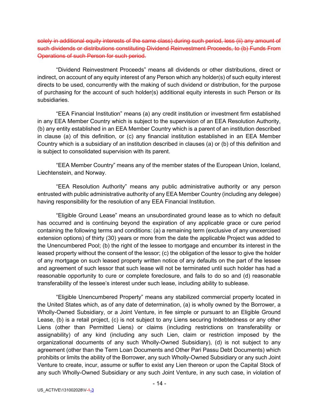 - 14 - US_ACTIVE\131002028\V-1-3 solely in additional equity interests of the same class) during such period, less (ii) any amount of such dividends or distributions constituting Dividend Reinvestment Proceeds, to (b) Funds From Operations of such Person for such period. “Dividend Reinvestment Proceeds” means all dividends or other distributions, direct or indirect, on account of any equity interest of any Person which any holder(s) of such equity interest directs to be used, concurrently with the making of such dividend or distribution, for the purpose of purchasing for the account of such holder(s) additional equity interests in such Person or its subsidiaries. “EEA Financial Institution” means (a) any credit institution or investment firm established in any EEA Member Country which is subject to the supervision of an EEA Resolution Authority, (b) any entity established in an EEA Member Country which is a parent of an institution described in clause (a) of this definition, or (c) any financial institution established in an EEA Member Country which is a subsidiary of an institution described in clauses (a) or (b) of this definition and is subject to consolidated supervision with its parent. “EEA Member Country” means any of the member states of the European Union, Iceland, Liechtenstein, and Norway. “EEA Resolution Authority” means any public administrative authority or any person entrusted with public administrative authority of any EEA Member Country (including any delegee) having responsibility for the resolution of any EEA Financial Institution. “Eligible Ground Lease” means an unsubordinated ground lease as to which no default has occurred and is continuing beyond the expiration of any applicable grace or cure period containing the following terms and conditions: (a) a remaining term (exclusive of any unexercised extension options) of thirty (30) years or more from the date the applicable Project was added to the Unencumbered Pool; (b) the right of the lessee to mortgage and encumber its interest in the leased property without the consent of the lessor; (c) the obligation of the lessor to give the holder of any mortgage on such leased property written notice of any defaults on the part of the lessee and agreement of such lessor that such lease will not be terminated until such holder has had a reasonable opportunity to cure or complete foreclosure, and fails to do so and (d) reasonable transferability of the lessee’s interest under such lease, including ability to sublease. “Eligible Unencumbered Property” means any stabilized commercial property located in the United States which, as of any date of determination, (a) is wholly owned by the Borrower, a Wholly-Owned Subsidiary, or a Joint Venture, in fee simple or pursuant to an Eligible Ground Lease, (b) is a retail project, (c) is not subject to any Liens securing Indebtedness or any other Liens (other than Permitted Liens) or claims (including restrictions on transferability or assignability) of any kind (including any such Lien, claim or restriction imposed by the organizational documents of any such Wholly-Owned Subsidiary), (d) is not subject to any agreement (other than the Term Loan Documents and Other Pari Passu Debt Documents) which prohibits or limits the ability of the Borrower, any such Wholly-Owned Subsidiary or any such Joint Venture to create, incur, assume or suffer to exist any Lien thereon or upon the Capital Stock of any such Wholly-Owned Subsidiary or any such Joint Venture, in any such case, in violation of