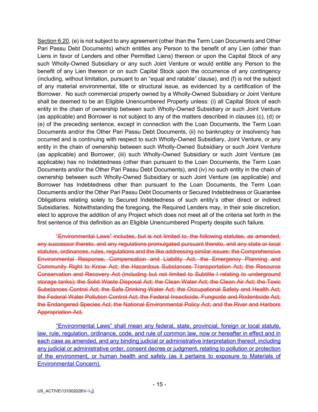 - 15 - US_ACTIVE\131002028\V-1-3 Section 6.20, (e) is not subject to any agreement (other than the Term Loan Documents and Other Pari Passu Debt Documents) which entitles any Person to the benefit of any Lien (other than Liens in favor of Lenders and other Permitted Liens) thereon or upon the Capital Stock of any such Wholly-Owned Subsidiary or any such Joint Venture or would entitle any Person to the benefit of any Lien thereon or on such Capital Stock upon the occurrence of any contingency (including, without limitation, pursuant to an “equal and ratable” clause), and (f) is not the subject of any material environmental, title or structural issue, as evidenced by a certification of the Borrower. No such commercial property owned by a Wholly-Owned Subsidiary or Joint Venture shall be deemed to be an Eligible Unencumbered Property unless: (i) all Capital Stock of each entity in the chain of ownership between such Wholly-Owned Subsidiary or such Joint Venture (as applicable) and Borrower is not subject to any of the matters described in clauses (c), (d) or (e) of the preceding sentence, except in connection with the Loan Documents, the Term Loan Documents and/or the Other Pari Passu Debt Documents, (ii) no bankruptcy or insolvency has occurred and is continuing with respect to such Wholly-Owned Subsidiary, Joint Venture, or any entity in the chain of ownership between such Wholly-Owned Subsidiary or such Joint Venture (as applicable) and Borrower, (iii) such Wholly-Owned Subsidiary or such Joint Venture (as applicable) has no Indebtedness (other than pursuant to the Loan Documents, the Term Loan Documents and/or the Other Pari Passu Debt Documents), and (iv) no such entity in the chain of ownership between such Wholly-Owned Subsidiary or such Joint Venture (as applicable) and Borrower has Indebtedness other than pursuant to the Loan Documents, the Term Loan Documents and/or the Other Pari Passu Debt Documents or Secured Indebtedness or Guarantee Obligations relating solely to Secured Indebtedness of such entity’s other direct or indirect Subsidiaries. Notwithstanding the foregoing, the Required Lenders may, in their sole discretion, elect to approve the addition of any Project which does not meet all of the criteria set forth in the first sentence of this definition as an Eligible Unencumbered Property despite such failure. “Environmental Laws” includes, but is not limited to, the following statutes, as amended, any successor thereto, and any regulations promulgated pursuant thereto, and any state or local statutes, ordinances, rules, regulations and the like addressing similar issues: the Comprehensive Environmental Response, Compensation and Liability Act; the Emergency Planning and Community Right to Know Act; the Hazardous Substances Transportation Act; the Resource Conservation and Recovery Act (including but not limited to Subtitle I relating to underground storage tanks); the Solid Waste Disposal Act; the Clean Water Act; the Clean Air Act; the Toxic Substances Control Act; the Safe Drinking Water Act; the Occupational Safety and Health Act; the Federal Water Pollution Control Act; the Federal Insecticide, Fungicide and Rodenticide Act; the Endangered Species Act; the National Environmental Policy Act; and the River and Harbors Appropriation Act. “Environmental Laws” shall mean any federal, state, provincial, foreign or local statute, law, rule, regulation, ordinance, code, and rule of common law, now or hereafter in effect and in each case as amended, and any binding judicial or administrative interpretation thereof, including any judicial or administrative order, consent decree or judgment, relating to pollution or protection of the environment, or human health and safety (as it pertains to exposure to Materials of Environmental Concern).
