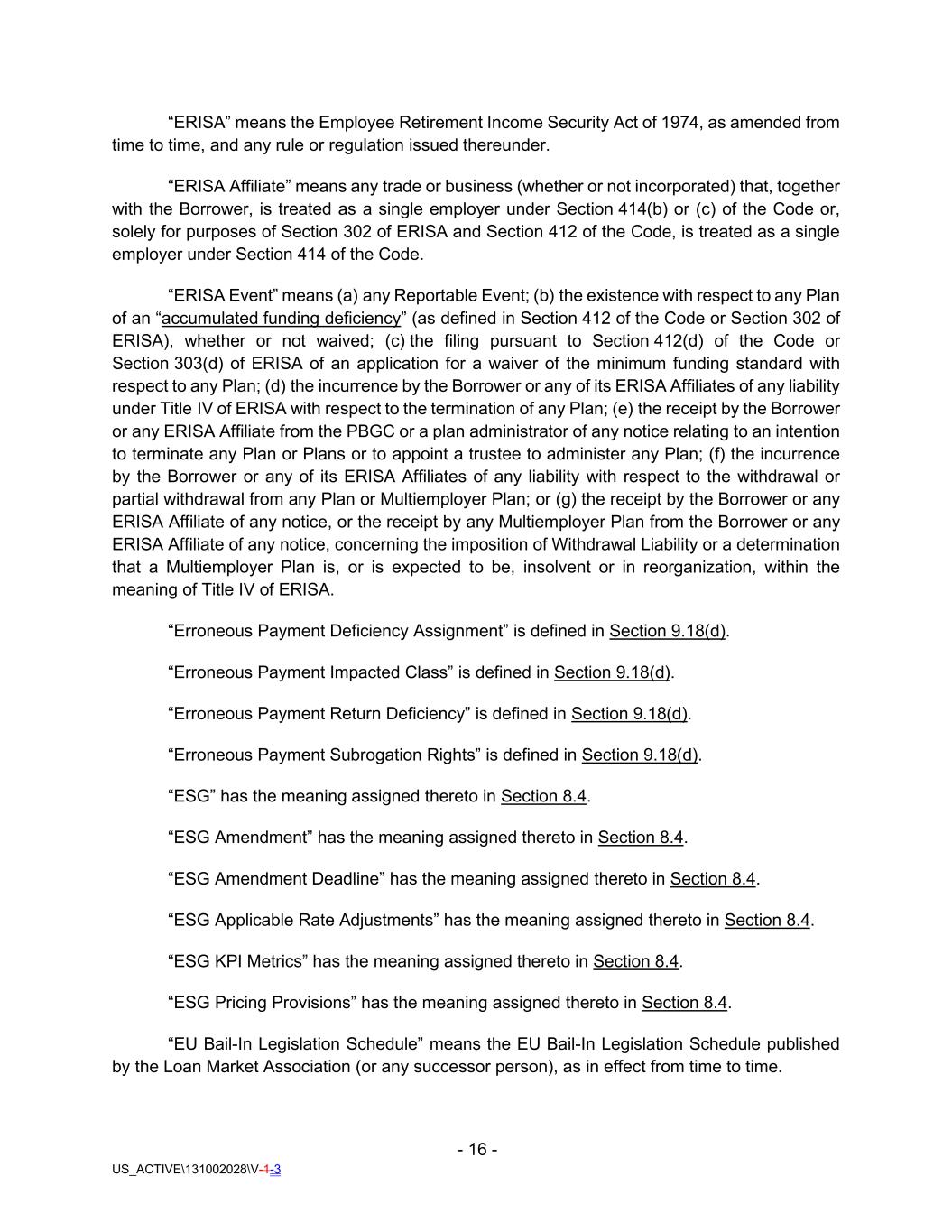 - 16 - US_ACTIVE\131002028\V-1-3 “ERISA” means the Employee Retirement Income Security Act of 1974, as amended from time to time, and any rule or regulation issued thereunder. “ERISA Affiliate” means any trade or business (whether or not incorporated) that, together with the Borrower, is treated as a single employer under Section 414(b) or (c) of the Code or, solely for purposes of Section 302 of ERISA and Section 412 of the Code, is treated as a single employer under Section 414 of the Code. “ERISA Event” means (a) any Reportable Event; (b) the existence with respect to any Plan of an “accumulated funding deficiency” (as defined in Section 412 of the Code or Section 302 of ERISA), whether or not waived; (c) the filing pursuant to Section 412(d) of the Code or Section 303(d) of ERISA of an application for a waiver of the minimum funding standard with respect to any Plan; (d) the incurrence by the Borrower or any of its ERISA Affiliates of any liability under Title IV of ERISA with respect to the termination of any Plan; (e) the receipt by the Borrower or any ERISA Affiliate from the PBGC or a plan administrator of any notice relating to an intention to terminate any Plan or Plans or to appoint a trustee to administer any Plan; (f) the incurrence by the Borrower or any of its ERISA Affiliates of any liability with respect to the withdrawal or partial withdrawal from any Plan or Multiemployer Plan; or (g) the receipt by the Borrower or any ERISA Affiliate of any notice, or the receipt by any Multiemployer Plan from the Borrower or any ERISA Affiliate of any notice, concerning the imposition of Withdrawal Liability or a determination that a Multiemployer Plan is, or is expected to be, insolvent or in reorganization, within the meaning of Title IV of ERISA. “Erroneous Payment Deficiency Assignment” is defined in Section 9.18(d). “Erroneous Payment Impacted Class” is defined in Section 9.18(d). “Erroneous Payment Return Deficiency” is defined in Section 9.18(d). “Erroneous Payment Subrogation Rights” is defined in Section 9.18(d). “ESG” has the meaning assigned thereto in Section 8.4. “ESG Amendment” has the meaning assigned thereto in Section 8.4. “ESG Amendment Deadline” has the meaning assigned thereto in Section 8.4. “ESG Applicable Rate Adjustments” has the meaning assigned thereto in Section 8.4. “ESG KPI Metrics” has the meaning assigned thereto in Section 8.4. “ESG Pricing Provisions” has the meaning assigned thereto in Section 8.4. “EU Bail-In Legislation Schedule” means the EU Bail-In Legislation Schedule published by the Loan Market Association (or any successor person), as in effect from time to time.