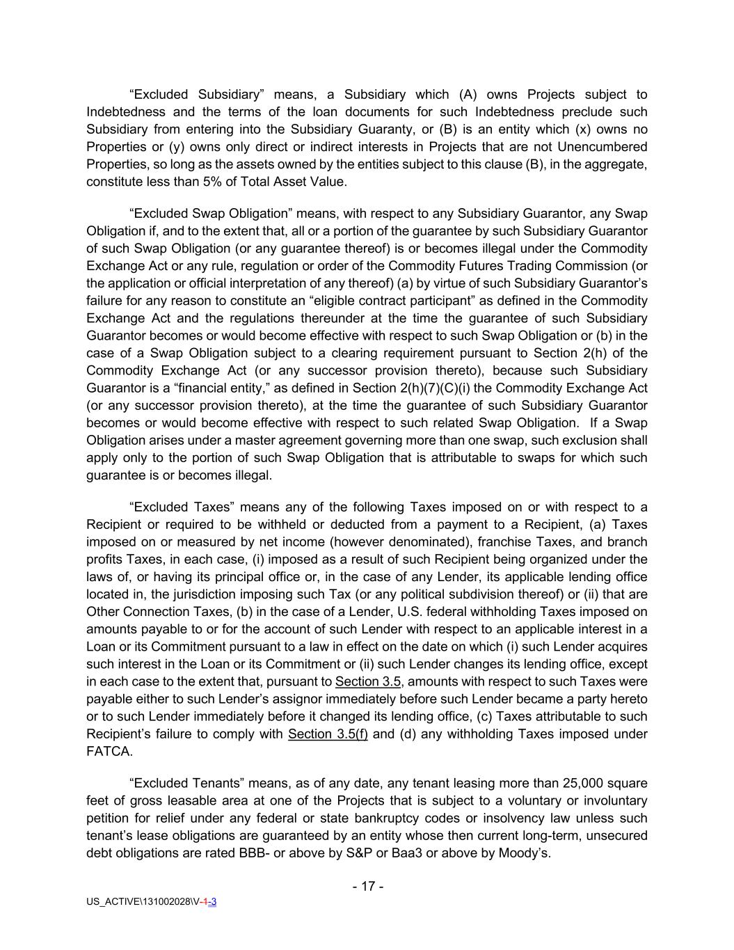 - 17 - US_ACTIVE\131002028\V-1-3 “Excluded Subsidiary” means, a Subsidiary which (A) owns Projects subject to Indebtedness and the terms of the loan documents for such Indebtedness preclude such Subsidiary from entering into the Subsidiary Guaranty, or (B) is an entity which (x) owns no Properties or (y) owns only direct or indirect interests in Projects that are not Unencumbered Properties, so long as the assets owned by the entities subject to this clause (B), in the aggregate, constitute less than 5% of Total Asset Value. “Excluded Swap Obligation” means, with respect to any Subsidiary Guarantor, any Swap Obligation if, and to the extent that, all or a portion of the guarantee by such Subsidiary Guarantor of such Swap Obligation (or any guarantee thereof) is or becomes illegal under the Commodity Exchange Act or any rule, regulation or order of the Commodity Futures Trading Commission (or the application or official interpretation of any thereof) (a) by virtue of such Subsidiary Guarantor’s failure for any reason to constitute an “eligible contract participant” as defined in the Commodity Exchange Act and the regulations thereunder at the time the guarantee of such Subsidiary Guarantor becomes or would become effective with respect to such Swap Obligation or (b) in the case of a Swap Obligation subject to a clearing requirement pursuant to Section 2(h) of the Commodity Exchange Act (or any successor provision thereto), because such Subsidiary Guarantor is a “financial entity,” as defined in Section 2(h)(7)(C)(i) the Commodity Exchange Act (or any successor provision thereto), at the time the guarantee of such Subsidiary Guarantor becomes or would become effective with respect to such related Swap Obligation. If a Swap Obligation arises under a master agreement governing more than one swap, such exclusion shall apply only to the portion of such Swap Obligation that is attributable to swaps for which such guarantee is or becomes illegal. “Excluded Taxes” means any of the following Taxes imposed on or with respect to a Recipient or required to be withheld or deducted from a payment to a Recipient, (a) Taxes imposed on or measured by net income (however denominated), franchise Taxes, and branch profits Taxes, in each case, (i) imposed as a result of such Recipient being organized under the laws of, or having its principal office or, in the case of any Lender, its applicable lending office located in, the jurisdiction imposing such Tax (or any political subdivision thereof) or (ii) that are Other Connection Taxes, (b) in the case of a Lender, U.S. federal withholding Taxes imposed on amounts payable to or for the account of such Lender with respect to an applicable interest in a Loan or its Commitment pursuant to a law in effect on the date on which (i) such Lender acquires such interest in the Loan or its Commitment or (ii) such Lender changes its lending office, except in each case to the extent that, pursuant to Section 3.5, amounts with respect to such Taxes were payable either to such Lender’s assignor immediately before such Lender became a party hereto or to such Lender immediately before it changed its lending office, (c) Taxes attributable to such Recipient’s failure to comply with Section 3.5(f) and (d) any withholding Taxes imposed under FATCA. “Excluded Tenants” means, as of any date, any tenant leasing more than 25,000 square feet of gross leasable area at one of the Projects that is subject to a voluntary or involuntary petition for relief under any federal or state bankruptcy codes or insolvency law unless such tenant’s lease obligations are guaranteed by an entity whose then current long-term, unsecured debt obligations are rated BBB- or above by S&P or Baa3 or above by Moody’s.