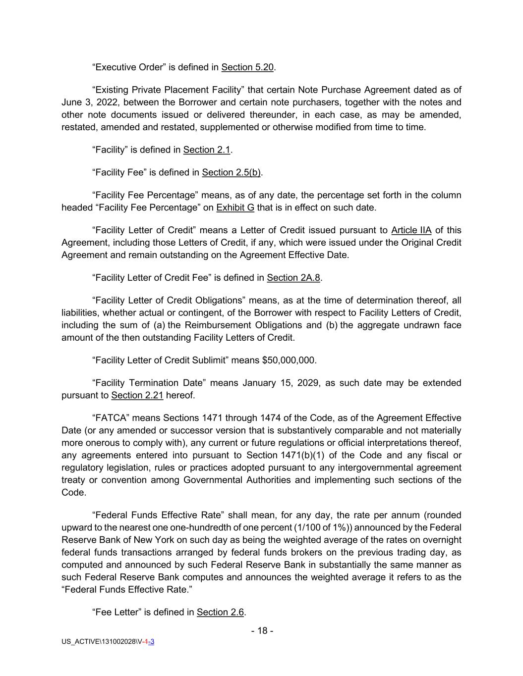 - 18 - US_ACTIVE\131002028\V-1-3 “Executive Order” is defined in Section 5.20. “Existing Private Placement Facility” that certain Note Purchase Agreement dated as of June 3, 2022, between the Borrower and certain note purchasers, together with the notes and other note documents issued or delivered thereunder, in each case, as may be amended, restated, amended and restated, supplemented or otherwise modified from time to time. “Facility” is defined in Section 2.1. “Facility Fee” is defined in Section 2.5(b). “Facility Fee Percentage” means, as of any date, the percentage set forth in the column headed “Facility Fee Percentage” on Exhibit G that is in effect on such date. “Facility Letter of Credit” means a Letter of Credit issued pursuant to Article IIA of this Agreement, including those Letters of Credit, if any, which were issued under the Original Credit Agreement and remain outstanding on the Agreement Effective Date. “Facility Letter of Credit Fee” is defined in Section 2A.8. “Facility Letter of Credit Obligations” means, as at the time of determination thereof, all liabilities, whether actual or contingent, of the Borrower with respect to Facility Letters of Credit, including the sum of (a) the Reimbursement Obligations and (b) the aggregate undrawn face amount of the then outstanding Facility Letters of Credit. “Facility Letter of Credit Sublimit” means $50,000,000. “Facility Termination Date” means January 15, 2029, as such date may be extended pursuant to Section 2.21 hereof. “FATCA” means Sections 1471 through 1474 of the Code, as of the Agreement Effective Date (or any amended or successor version that is substantively comparable and not materially more onerous to comply with), any current or future regulations or official interpretations thereof, any agreements entered into pursuant to Section 1471(b)(1) of the Code and any fiscal or regulatory legislation, rules or practices adopted pursuant to any intergovernmental agreement treaty or convention among Governmental Authorities and implementing such sections of the Code. “Federal Funds Effective Rate” shall mean, for any day, the rate per annum (rounded upward to the nearest one one-hundredth of one percent (1/100 of 1%)) announced by the Federal Reserve Bank of New York on such day as being the weighted average of the rates on overnight federal funds transactions arranged by federal funds brokers on the previous trading day, as computed and announced by such Federal Reserve Bank in substantially the same manner as such Federal Reserve Bank computes and announces the weighted average it refers to as the “Federal Funds Effective Rate.” “Fee Letter” is defined in Section 2.6.