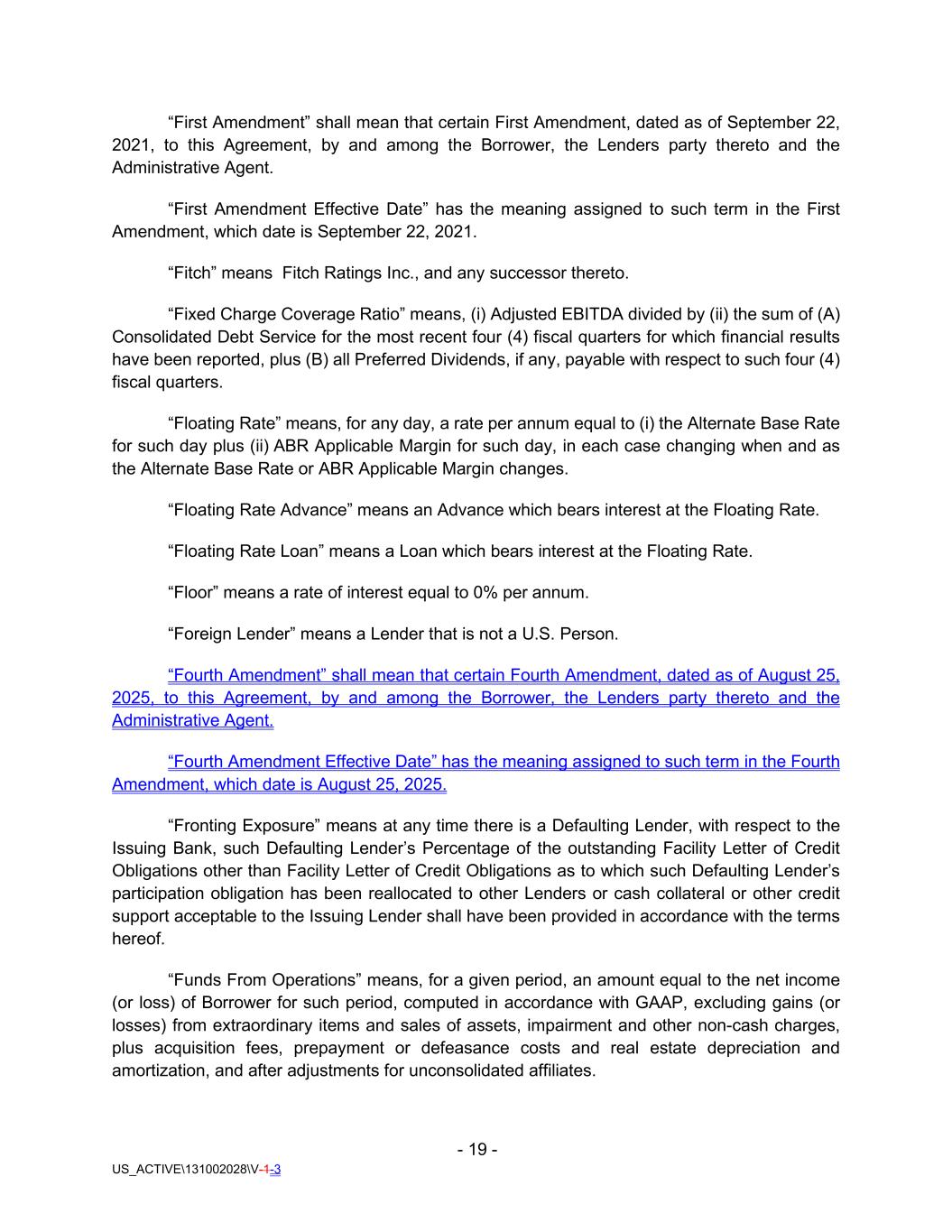 - 19 - US_ACTIVE\131002028\V-1-3 “First Amendment” shall mean that certain First Amendment, dated as of September 22, 2021, to this Agreement, by and among the Borrower, the Lenders party thereto and the Administrative Agent. “First Amendment Effective Date” has the meaning assigned to such term in the First Amendment, which date is September 22, 2021. “Fitch” means Fitch Ratings Inc., and any successor thereto. “Fixed Charge Coverage Ratio” means, (i) Adjusted EBITDA divided by (ii) the sum of (A) Consolidated Debt Service for the most recent four (4) fiscal quarters for which financial results have been reported, plus (B) all Preferred Dividends, if any, payable with respect to such four (4) fiscal quarters. “Floating Rate” means, for any day, a rate per annum equal to (i) the Alternate Base Rate for such day plus (ii) ABR Applicable Margin for such day, in each case changing when and as the Alternate Base Rate or ABR Applicable Margin changes. “Floating Rate Advance” means an Advance which bears interest at the Floating Rate. “Floating Rate Loan” means a Loan which bears interest at the Floating Rate. “Floor” means a rate of interest equal to 0% per annum. “Foreign Lender” means a Lender that is not a U.S. Person. “Fourth Amendment” shall mean that certain Fourth Amendment, dated as of August 25, 2025, to this Agreement, by and among the Borrower, the Lenders party thereto and the Administrative Agent. “Fourth Amendment Effective Date” has the meaning assigned to such term in the Fourth Amendment, which date is August 25, 2025. “Fronting Exposure” means at any time there is a Defaulting Lender, with respect to the Issuing Bank, such Defaulting Lender’s Percentage of the outstanding Facility Letter of Credit Obligations other than Facility Letter of Credit Obligations as to which such Defaulting Lender’s participation obligation has been reallocated to other Lenders or cash collateral or other credit support acceptable to the Issuing Lender shall have been provided in accordance with the terms hereof. “Funds From Operations” means, for a given period, an amount equal to the net income (or loss) of Borrower for such period, computed in accordance with GAAP, excluding gains (or losses) from extraordinary items and sales of assets, impairment and other non-cash charges, plus acquisition fees, prepayment or defeasance costs and real estate depreciation and amortization, and after adjustments for unconsolidated affiliates.