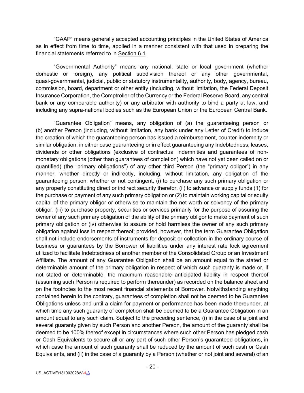 - 20 - US_ACTIVE\131002028\V-1-3 “GAAP” means generally accepted accounting principles in the United States of America as in effect from time to time, applied in a manner consistent with that used in preparing the financial statements referred to in Section 6.1. “Governmental Authority” means any national, state or local government (whether domestic or foreign), any political subdivision thereof or any other governmental, quasi-governmental, judicial, public or statutory instrumentality, authority, body, agency, bureau, commission, board, department or other entity (including, without limitation, the Federal Deposit Insurance Corporation, the Comptroller of the Currency or the Federal Reserve Board, any central bank or any comparable authority) or any arbitrator with authority to bind a party at law, and including any supra-national bodies such as the European Union or the European Central Bank. “Guarantee Obligation” means, any obligation of (a) the guaranteeing person or (b) another Person (including, without limitation, any bank under any Letter of Credit) to induce the creation of which the guaranteeing person has issued a reimbursement, counter-indemnity or similar obligation, in either case guaranteeing or in effect guaranteeing any Indebtedness, leases, dividends or other obligations (exclusive of contractual indemnities and guarantees of non- monetary obligations (other than guarantees of completion) which have not yet been called on or quantified) (the “primary obligations”) of any other third Person (the “primary obligor”) in any manner, whether directly or indirectly, including, without limitation, any obligation of the guaranteeing person, whether or not contingent, (i) to purchase any such primary obligation or any property constituting direct or indirect security therefor, (ii) to advance or supply funds (1) for the purchase or payment of any such primary obligation or (2) to maintain working capital or equity capital of the primary obligor or otherwise to maintain the net worth or solvency of the primary obligor, (iii) to purchase property, securities or services primarily for the purpose of assuring the owner of any such primary obligation of the ability of the primary obligor to make payment of such primary obligation or (iv) otherwise to assure or hold harmless the owner of any such primary obligation against loss in respect thereof; provided, however, that the term Guarantee Obligation shall not include endorsements of instruments for deposit or collection in the ordinary course of business or guarantees by the Borrower of liabilities under any interest rate lock agreement utilized to facilitate Indebtedness of another member of the Consolidated Group or an Investment Affiliate. The amount of any Guarantee Obligation shall be an amount equal to the stated or determinable amount of the primary obligation in respect of which such guaranty is made or, if not stated or determinable, the maximum reasonable anticipated liability in respect thereof (assuming such Person is required to perform thereunder) as recorded on the balance sheet and on the footnotes to the most recent financial statements of Borrower. Notwithstanding anything contained herein to the contrary, guarantees of completion shall not be deemed to be Guarantee Obligations unless and until a claim for payment or performance has been made thereunder, at which time any such guaranty of completion shall be deemed to be a Guarantee Obligation in an amount equal to any such claim. Subject to the preceding sentence, (i) in the case of a joint and several guaranty given by such Person and another Person, the amount of the guaranty shall be deemed to be 100% thereof except in circumstances where such other Person has pledged cash or Cash Equivalents to secure all or any part of such other Person’s guaranteed obligations, in which case the amount of such guaranty shall be reduced by the amount of such cash or Cash Equivalents, and (ii) in the case of a guaranty by a Person (whether or not joint and several) of an