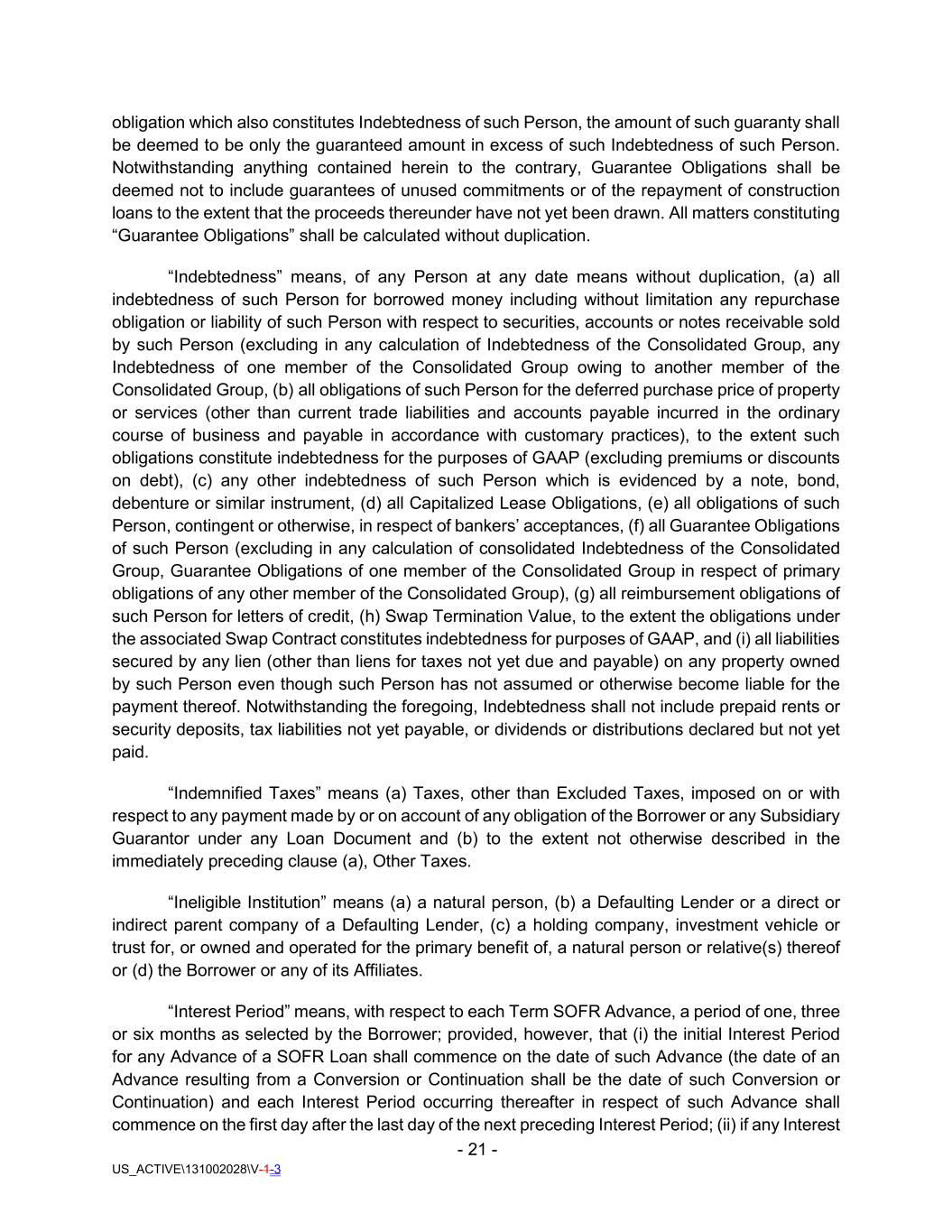 - 21 - US_ACTIVE\131002028\V-1-3 obligation which also constitutes Indebtedness of such Person, the amount of such guaranty shall be deemed to be only the guaranteed amount in excess of such Indebtedness of such Person. Notwithstanding anything contained herein to the contrary, Guarantee Obligations shall be deemed not to include guarantees of unused commitments or of the repayment of construction loans to the extent that the proceeds thereunder have not yet been drawn. All matters constituting “Guarantee Obligations” shall be calculated without duplication. “Indebtedness” means, of any Person at any date means without duplication, (a) all indebtedness of such Person for borrowed money including without limitation any repurchase obligation or liability of such Person with respect to securities, accounts or notes receivable sold by such Person (excluding in any calculation of Indebtedness of the Consolidated Group, any Indebtedness of one member of the Consolidated Group owing to another member of the Consolidated Group, (b) all obligations of such Person for the deferred purchase price of property or services (other than current trade liabilities and accounts payable incurred in the ordinary course of business and payable in accordance with customary practices), to the extent such obligations constitute indebtedness for the purposes of GAAP (excluding premiums or discounts on debt), (c) any other indebtedness of such Person which is evidenced by a note, bond, debenture or similar instrument, (d) all Capitalized Lease Obligations, (e) all obligations of such Person, contingent or otherwise, in respect of bankers’ acceptances, (f) all Guarantee Obligations of such Person (excluding in any calculation of consolidated Indebtedness of the Consolidated Group, Guarantee Obligations of one member of the Consolidated Group in respect of primary obligations of any other member of the Consolidated Group), (g) all reimbursement obligations of such Person for letters of credit, (h) Swap Termination Value, to the extent the obligations under the associated Swap Contract constitutes indebtedness for purposes of GAAP, and (i) all liabilities secured by any lien (other than liens for taxes not yet due and payable) on any property owned by such Person even though such Person has not assumed or otherwise become liable for the payment thereof. Notwithstanding the foregoing, Indebtedness shall not include prepaid rents or security deposits, tax liabilities not yet payable, or dividends or distributions declared but not yet paid. “Indemnified Taxes” means (a) Taxes, other than Excluded Taxes, imposed on or with respect to any payment made by or on account of any obligation of the Borrower or any Subsidiary Guarantor under any Loan Document and (b) to the extent not otherwise described in the immediately preceding clause (a), Other Taxes. “Ineligible Institution” means (a) a natural person, (b) a Defaulting Lender or a direct or indirect parent company of a Defaulting Lender, (c) a holding company, investment vehicle or trust for, or owned and operated for the primary benefit of, a natural person or relative(s) thereof or (d) the Borrower or any of its Affiliates. “Interest Period” means, with respect to each Term SOFR Advance, a period of one, three or six months as selected by the Borrower; provided, however, that (i) the initial Interest Period for any Advance of a SOFR Loan shall commence on the date of such Advance (the date of an Advance resulting from a Conversion or Continuation shall be the date of such Conversion or Continuation) and each Interest Period occurring thereafter in respect of such Advance shall commence on the first day after the last day of the next preceding Interest Period; (ii) if any Interest