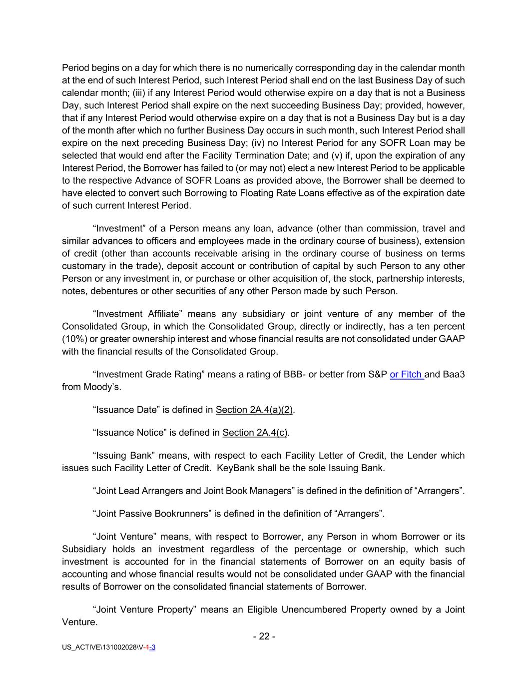 - 22 - US_ACTIVE\131002028\V-1-3 Period begins on a day for which there is no numerically corresponding day in the calendar month at the end of such Interest Period, such Interest Period shall end on the last Business Day of such calendar month; (iii) if any Interest Period would otherwise expire on a day that is not a Business Day, such Interest Period shall expire on the next succeeding Business Day; provided, however, that if any Interest Period would otherwise expire on a day that is not a Business Day but is a day of the month after which no further Business Day occurs in such month, such Interest Period shall expire on the next preceding Business Day; (iv) no Interest Period for any SOFR Loan may be selected that would end after the Facility Termination Date; and (v) if, upon the expiration of any Interest Period, the Borrower has failed to (or may not) elect a new Interest Period to be applicable to the respective Advance of SOFR Loans as provided above, the Borrower shall be deemed to have elected to convert such Borrowing to Floating Rate Loans effective as of the expiration date of such current Interest Period. “Investment” of a Person means any loan, advance (other than commission, travel and similar advances to officers and employees made in the ordinary course of business), extension of credit (other than accounts receivable arising in the ordinary course of business on terms customary in the trade), deposit account or contribution of capital by such Person to any other Person or any investment in, or purchase or other acquisition of, the stock, partnership interests, notes, debentures or other securities of any other Person made by such Person. “Investment Affiliate” means any subsidiary or joint venture of any member of the Consolidated Group, in which the Consolidated Group, directly or indirectly, has a ten percent (10%) or greater ownership interest and whose financial results are not consolidated under GAAP with the financial results of the Consolidated Group. “Investment Grade Rating” means a rating of BBB- or better from S&P or Fitch and Baa3 from Moody’s. “Issuance Date” is defined in Section 2A.4(a)(2). “Issuance Notice” is defined in Section 2A.4(c). “Issuing Bank” means, with respect to each Facility Letter of Credit, the Lender which issues such Facility Letter of Credit. KeyBank shall be the sole Issuing Bank. “Joint Lead Arrangers and Joint Book Managers” is defined in the definition of “Arrangers”. “Joint Passive Bookrunners” is defined in the definition of “Arrangers”. “Joint Venture” means, with respect to Borrower, any Person in whom Borrower or its Subsidiary holds an investment regardless of the percentage or ownership, which such investment is accounted for in the financial statements of Borrower on an equity basis of accounting and whose financial results would not be consolidated under GAAP with the financial results of Borrower on the consolidated financial statements of Borrower. “Joint Venture Property” means an Eligible Unencumbered Property owned by a Joint Venture.