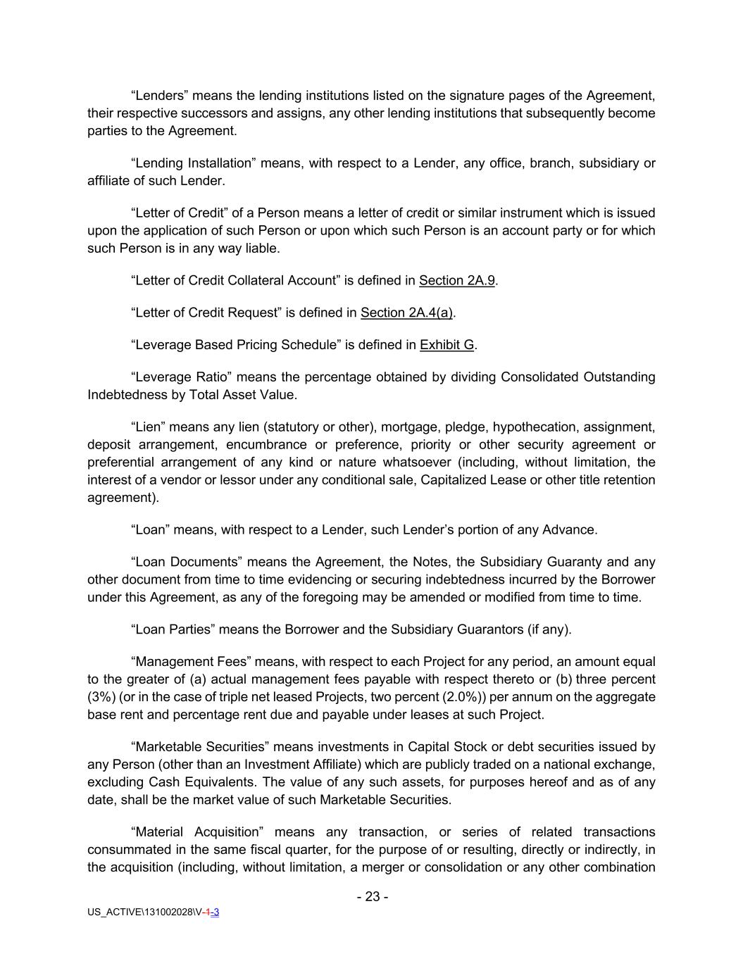 - 23 - US_ACTIVE\131002028\V-1-3 “Lenders” means the lending institutions listed on the signature pages of the Agreement, their respective successors and assigns, any other lending institutions that subsequently become parties to the Agreement. “Lending Installation” means, with respect to a Lender, any office, branch, subsidiary or affiliate of such Lender. “Letter of Credit” of a Person means a letter of credit or similar instrument which is issued upon the application of such Person or upon which such Person is an account party or for which such Person is in any way liable. “Letter of Credit Collateral Account” is defined in Section 2A.9. “Letter of Credit Request” is defined in Section 2A.4(a). “Leverage Based Pricing Schedule” is defined in Exhibit G. “Leverage Ratio” means the percentage obtained by dividing Consolidated Outstanding Indebtedness by Total Asset Value. “Lien” means any lien (statutory or other), mortgage, pledge, hypothecation, assignment, deposit arrangement, encumbrance or preference, priority or other security agreement or preferential arrangement of any kind or nature whatsoever (including, without limitation, the interest of a vendor or lessor under any conditional sale, Capitalized Lease or other title retention agreement). “Loan” means, with respect to a Lender, such Lender’s portion of any Advance. “Loan Documents” means the Agreement, the Notes, the Subsidiary Guaranty and any other document from time to time evidencing or securing indebtedness incurred by the Borrower under this Agreement, as any of the foregoing may be amended or modified from time to time. “Loan Parties” means the Borrower and the Subsidiary Guarantors (if any). “Management Fees” means, with respect to each Project for any period, an amount equal to the greater of (a) actual management fees payable with respect thereto or (b) three percent (3%) (or in the case of triple net leased Projects, two percent (2.0%)) per annum on the aggregate base rent and percentage rent due and payable under leases at such Project. “Marketable Securities” means investments in Capital Stock or debt securities issued by any Person (other than an Investment Affiliate) which are publicly traded on a national exchange, excluding Cash Equivalents. The value of any such assets, for purposes hereof and as of any date, shall be the market value of such Marketable Securities. “Material Acquisition” means any transaction, or series of related transactions consummated in the same fiscal quarter, for the purpose of or resulting, directly or indirectly, in the acquisition (including, without limitation, a merger or consolidation or any other combination