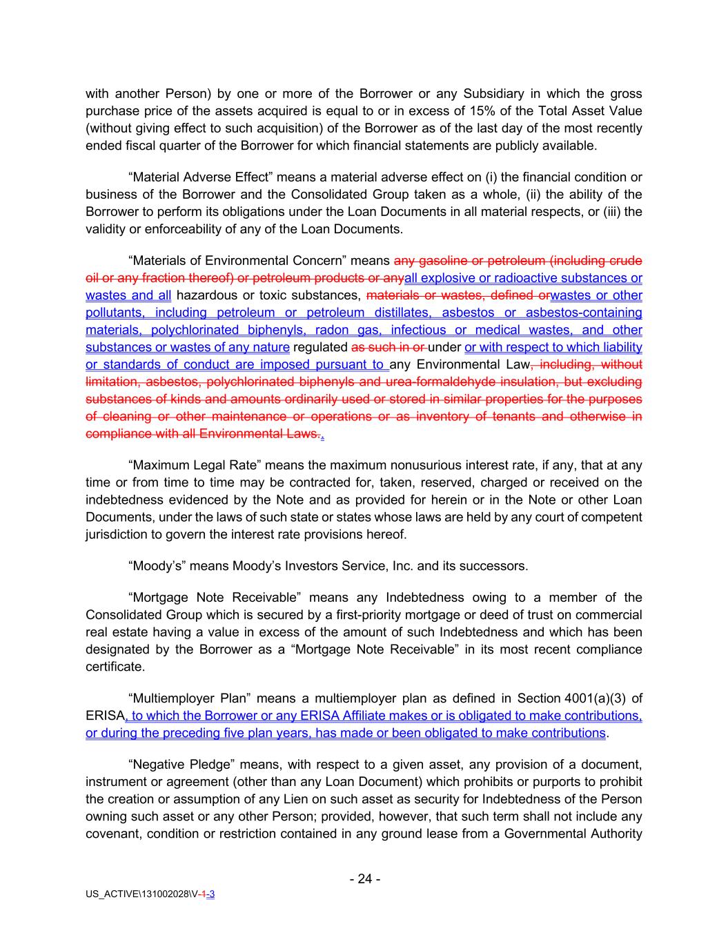 - 24 - US_ACTIVE\131002028\V-1-3 with another Person) by one or more of the Borrower or any Subsidiary in which the gross purchase price of the assets acquired is equal to or in excess of 15% of the Total Asset Value (without giving effect to such acquisition) of the Borrower as of the last day of the most recently ended fiscal quarter of the Borrower for which financial statements are publicly available. “Material Adverse Effect” means a material adverse effect on (i) the financial condition or business of the Borrower and the Consolidated Group taken as a whole, (ii) the ability of the Borrower to perform its obligations under the Loan Documents in all material respects, or (iii) the validity or enforceability of any of the Loan Documents. “Materials of Environmental Concern” means any gasoline or petroleum (including crude oil or any fraction thereof) or petroleum products or anyall explosive or radioactive substances or wastes and all hazardous or toxic substances, materials or wastes, defined orwastes or other pollutants, including petroleum or petroleum distillates, asbestos or asbestos-containing materials, polychlorinated biphenyls, radon gas, infectious or medical wastes, and other substances or wastes of any nature regulated as such in or under or with respect to which liability or standards of conduct are imposed pursuant to any Environmental Law, including, without limitation, asbestos, polychlorinated biphenyls and urea-formaldehyde insulation, but excluding substances of kinds and amounts ordinarily used or stored in similar properties for the purposes of cleaning or other maintenance or operations or as inventory of tenants and otherwise in compliance with all Environmental Laws.. “Maximum Legal Rate” means the maximum nonusurious interest rate, if any, that at any time or from time to time may be contracted for, taken, reserved, charged or received on the indebtedness evidenced by the Note and as provided for herein or in the Note or other Loan Documents, under the laws of such state or states whose laws are held by any court of competent jurisdiction to govern the interest rate provisions hereof. “Moody’s” means Moody’s Investors Service, Inc. and its successors. “Mortgage Note Receivable” means any Indebtedness owing to a member of the Consolidated Group which is secured by a first-priority mortgage or deed of trust on commercial real estate having a value in excess of the amount of such Indebtedness and which has been designated by the Borrower as a “Mortgage Note Receivable” in its most recent compliance certificate. “Multiemployer Plan” means a multiemployer plan as defined in Section 4001(a)(3) of ERISA, to which the Borrower or any ERISA Affiliate makes or is obligated to make contributions, or during the preceding five plan years, has made or been obligated to make contributions. “Negative Pledge” means, with respect to a given asset, any provision of a document, instrument or agreement (other than any Loan Document) which prohibits or purports to prohibit the creation or assumption of any Lien on such asset as security for Indebtedness of the Person owning such asset or any other Person; provided, however, that such term shall not include any covenant, condition or restriction contained in any ground lease from a Governmental Authority