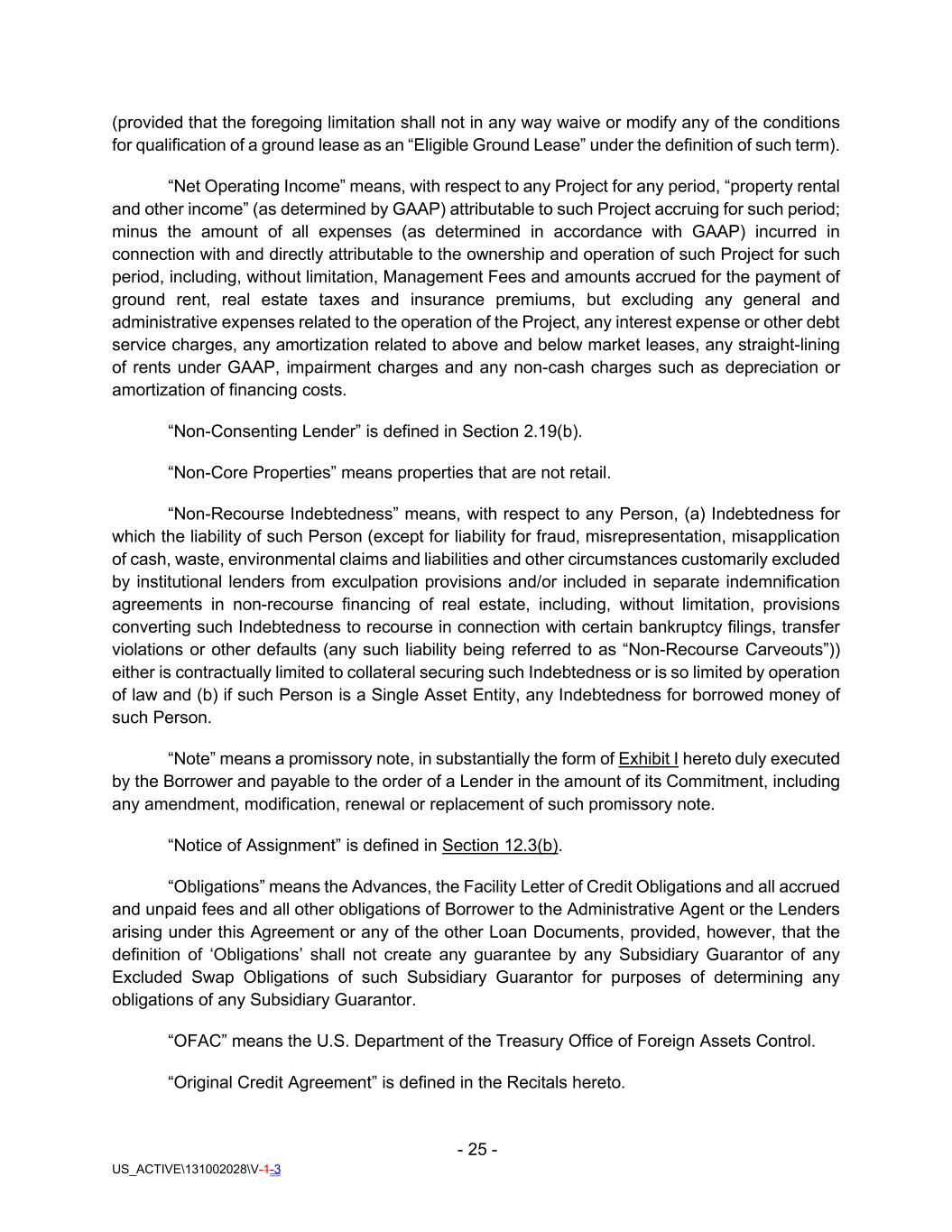 - 25 - US_ACTIVE\131002028\V-1-3 (provided that the foregoing limitation shall not in any way waive or modify any of the conditions for qualification of a ground lease as an “Eligible Ground Lease” under the definition of such term). “Net Operating Income” means, with respect to any Project for any period, “property rental and other income” (as determined by GAAP) attributable to such Project accruing for such period; minus the amount of all expenses (as determined in accordance with GAAP) incurred in connection with and directly attributable to the ownership and operation of such Project for such period, including, without limitation, Management Fees and amounts accrued for the payment of ground rent, real estate taxes and insurance premiums, but excluding any general and administrative expenses related to the operation of the Project, any interest expense or other debt service charges, any amortization related to above and below market leases, any straight-lining of rents under GAAP, impairment charges and any non-cash charges such as depreciation or amortization of financing costs. “Non-Consenting Lender” is defined in Section 2.19(b). “Non-Core Properties” means properties that are not retail. “Non-Recourse Indebtedness” means, with respect to any Person, (a) Indebtedness for which the liability of such Person (except for liability for fraud, misrepresentation, misapplication of cash, waste, environmental claims and liabilities and other circumstances customarily excluded by institutional lenders from exculpation provisions and/or included in separate indemnification agreements in non-recourse financing of real estate, including, without limitation, provisions converting such Indebtedness to recourse in connection with certain bankruptcy filings, transfer violations or other defaults (any such liability being referred to as “Non-Recourse Carveouts”)) either is contractually limited to collateral securing such Indebtedness or is so limited by operation of law and (b) if such Person is a Single Asset Entity, any Indebtedness for borrowed money of such Person. “Note” means a promissory note, in substantially the form of Exhibit I hereto duly executed by the Borrower and payable to the order of a Lender in the amount of its Commitment, including any amendment, modification, renewal or replacement of such promissory note. “Notice of Assignment” is defined in Section 12.3(b). “Obligations” means the Advances, the Facility Letter of Credit Obligations and all accrued and unpaid fees and all other obligations of Borrower to the Administrative Agent or the Lenders arising under this Agreement or any of the other Loan Documents, provided, however, that the definition of ‘Obligations’ shall not create any guarantee by any Subsidiary Guarantor of any Excluded Swap Obligations of such Subsidiary Guarantor for purposes of determining any obligations of any Subsidiary Guarantor. “OFAC” means the U.S. Department of the Treasury Office of Foreign Assets Control. “Original Credit Agreement” is defined in the Recitals hereto.