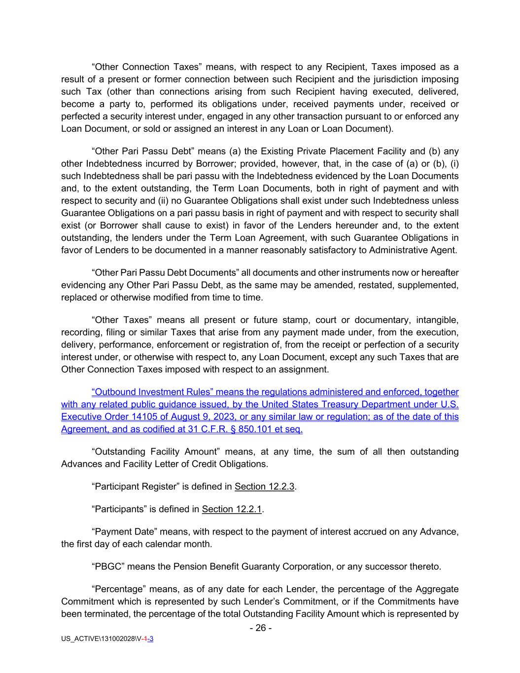 - 26 - US_ACTIVE\131002028\V-1-3 “Other Connection Taxes” means, with respect to any Recipient, Taxes imposed as a result of a present or former connection between such Recipient and the jurisdiction imposing such Tax (other than connections arising from such Recipient having executed, delivered, become a party to, performed its obligations under, received payments under, received or perfected a security interest under, engaged in any other transaction pursuant to or enforced any Loan Document, or sold or assigned an interest in any Loan or Loan Document). “Other Pari Passu Debt” means (a) the Existing Private Placement Facility and (b) any other Indebtedness incurred by Borrower; provided, however, that, in the case of (a) or (b), (i) such Indebtedness shall be pari passu with the Indebtedness evidenced by the Loan Documents and, to the extent outstanding, the Term Loan Documents, both in right of payment and with respect to security and (ii) no Guarantee Obligations shall exist under such Indebtedness unless Guarantee Obligations on a pari passu basis in right of payment and with respect to security shall exist (or Borrower shall cause to exist) in favor of the Lenders hereunder and, to the extent outstanding, the lenders under the Term Loan Agreement, with such Guarantee Obligations in favor of Lenders to be documented in a manner reasonably satisfactory to Administrative Agent. “Other Pari Passu Debt Documents” all documents and other instruments now or hereafter evidencing any Other Pari Passu Debt, as the same may be amended, restated, supplemented, replaced or otherwise modified from time to time. “Other Taxes” means all present or future stamp, court or documentary, intangible, recording, filing or similar Taxes that arise from any payment made under, from the execution, delivery, performance, enforcement or registration of, from the receipt or perfection of a security interest under, or otherwise with respect to, any Loan Document, except any such Taxes that are Other Connection Taxes imposed with respect to an assignment. “Outbound Investment Rules” means the regulations administered and enforced, together with any related public guidance issued, by the United States Treasury Department under U.S. Executive Order 14105 of August 9, 2023, or any similar law or regulation; as of the date of this Agreement, and as codified at 31 C.F.R. § 850.101 et seq. “Outstanding Facility Amount” means, at any time, the sum of all then outstanding Advances and Facility Letter of Credit Obligations. “Participant Register” is defined in Section 12.2.3. “Participants” is defined in Section 12.2.1. “Payment Date” means, with respect to the payment of interest accrued on any Advance, the first day of each calendar month. “PBGC” means the Pension Benefit Guaranty Corporation, or any successor thereto. “Percentage” means, as of any date for each Lender, the percentage of the Aggregate Commitment which is represented by such Lender’s Commitment, or if the Commitments have been terminated, the percentage of the total Outstanding Facility Amount which is represented by