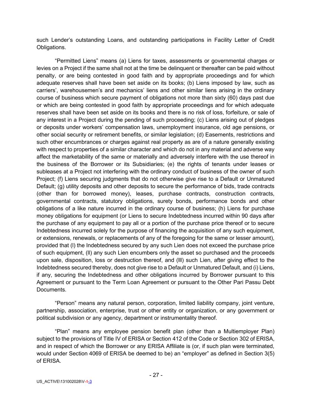- 27 - US_ACTIVE\131002028\V-1-3 such Lender’s outstanding Loans, and outstanding participations in Facility Letter of Credit Obligations. “Permitted Liens” means (a) Liens for taxes, assessments or governmental charges or levies on a Project if the same shall not at the time be delinquent or thereafter can be paid without penalty, or are being contested in good faith and by appropriate proceedings and for which adequate reserves shall have been set aside on its books; (b) Liens imposed by law, such as carriers’, warehousemen’s and mechanics’ liens and other similar liens arising in the ordinary course of business which secure payment of obligations not more than sixty (60) days past due or which are being contested in good faith by appropriate proceedings and for which adequate reserves shall have been set aside on its books and there is no risk of loss, forfeiture, or sale of any interest in a Project during the pending of such proceeding; (c) Liens arising out of pledges or deposits under workers’ compensation laws, unemployment insurance, old age pensions, or other social security or retirement benefits, or similar legislation; (d) Easements, restrictions and such other encumbrances or charges against real property as are of a nature generally existing with respect to properties of a similar character and which do not in any material and adverse way affect the marketability of the same or materially and adversely interfere with the use thereof in the business of the Borrower or its Subsidiaries; (e) the rights of tenants under leases or subleases at a Project not interfering with the ordinary conduct of business of the owner of such Project; (f) Liens securing judgments that do not otherwise give rise to a Default or Unmatured Default; (g) utility deposits and other deposits to secure the performance of bids, trade contracts (other than for borrowed money), leases, purchase contracts, construction contracts, governmental contracts, statutory obligations, surety bonds, performance bonds and other obligations of a like nature incurred in the ordinary course of business; (h) Liens for purchase money obligations for equipment (or Liens to secure Indebtedness incurred within 90 days after the purchase of any equipment to pay all or a portion of the purchase price thereof or to secure Indebtedness incurred solely for the purpose of financing the acquisition of any such equipment, or extensions, renewals, or replacements of any of the foregoing for the same or lesser amount), provided that (l) the Indebtedness secured by any such Lien does not exceed the purchase price of such equipment, (ll) any such Lien encumbers only the asset so purchased and the proceeds upon sale, disposition, loss or destruction thereof, and (lll) such Lien, after giving effect to the Indebtedness secured thereby, does not give rise to a Default or Unmatured Default, and (i) Liens, if any, securing the Indebtedness and other obligations incurred by Borrower pursuant to this Agreement or pursuant to the Term Loan Agreement or pursuant to the Other Pari Passu Debt Documents. “Person” means any natural person, corporation, limited liability company, joint venture, partnership, association, enterprise, trust or other entity or organization, or any government or political subdivision or any agency, department or instrumentality thereof. “Plan” means any employee pension benefit plan (other than a Multiemployer Plan) subject to the provisions of Title IV of ERISA or Section 412 of the Code or Section 302 of ERISA, and in respect of which the Borrower or any ERISA Affiliate is (or, if such plan were terminated, would under Section 4069 of ERISA be deemed to be) an “employer” as defined in Section 3(5) of ERISA.