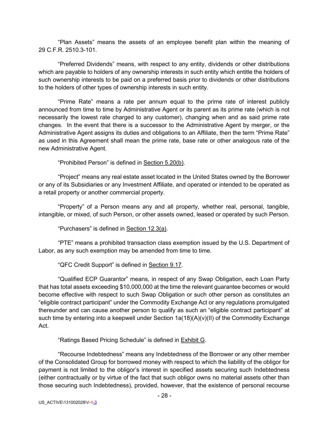 - 28 - US_ACTIVE\131002028\V-1-3 “Plan Assets” means the assets of an employee benefit plan within the meaning of 29 C.F.R. 2510.3-101. “Preferred Dividends” means, with respect to any entity, dividends or other distributions which are payable to holders of any ownership interests in such entity which entitle the holders of such ownership interests to be paid on a preferred basis prior to dividends or other distributions to the holders of other types of ownership interests in such entity. “Prime Rate” means a rate per annum equal to the prime rate of interest publicly announced from time to time by Administrative Agent or its parent as its prime rate (which is not necessarily the lowest rate charged to any customer), changing when and as said prime rate changes. In the event that there is a successor to the Administrative Agent by merger, or the Administrative Agent assigns its duties and obligations to an Affiliate, then the term “Prime Rate” as used in this Agreement shall mean the prime rate, base rate or other analogous rate of the new Administrative Agent. “Prohibited Person” is defined in Section 5.20(b). “Project” means any real estate asset located in the United States owned by the Borrower or any of its Subsidiaries or any Investment Affiliate, and operated or intended to be operated as a retail property or another commercial property. “Property” of a Person means any and all property, whether real, personal, tangible, intangible, or mixed, of such Person, or other assets owned, leased or operated by such Person. “Purchasers” is defined in Section 12.3(a). “PTE” means a prohibited transaction class exemption issued by the U.S. Department of Labor, as any such exemption may be amended from time to time. “QFC Credit Support” is defined in Section 9.17. “Qualified ECP Guarantor” means, in respect of any Swap Obligation, each Loan Party that has total assets exceeding $10,000,000 at the time the relevant guarantee becomes or would become effective with respect to such Swap Obligation or such other person as constitutes an “eligible contract participant” under the Commodity Exchange Act or any regulations promulgated thereunder and can cause another person to qualify as such an “eligible contract participant” at such time by entering into a keepwell under Section 1a(18)(A)(v)(II) of the Commodity Exchange Act. “Ratings Based Pricing Schedule” is defined in Exhibit G. “Recourse Indebtedness” means any Indebtedness of the Borrower or any other member of the Consolidated Group for borrowed money with respect to which the liability of the obligor for payment is not limited to the obligor’s interest in specified assets securing such Indebtedness (either contractually or by virtue of the fact that such obligor owns no material assets other than those securing such Indebtedness), provided, however, that the existence of personal recourse