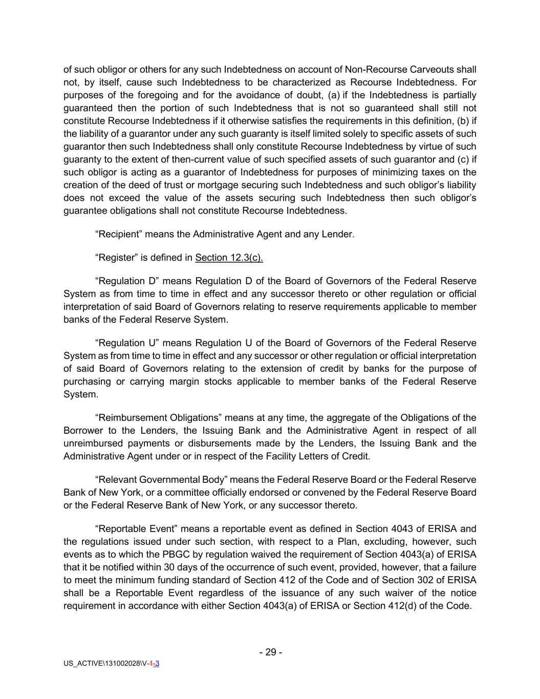- 29 - US_ACTIVE\131002028\V-1-3 of such obligor or others for any such Indebtedness on account of Non-Recourse Carveouts shall not, by itself, cause such Indebtedness to be characterized as Recourse Indebtedness. For purposes of the foregoing and for the avoidance of doubt, (a) if the Indebtedness is partially guaranteed then the portion of such Indebtedness that is not so guaranteed shall still not constitute Recourse Indebtedness if it otherwise satisfies the requirements in this definition, (b) if the liability of a guarantor under any such guaranty is itself limited solely to specific assets of such guarantor then such Indebtedness shall only constitute Recourse Indebtedness by virtue of such guaranty to the extent of then-current value of such specified assets of such guarantor and (c) if such obligor is acting as a guarantor of Indebtedness for purposes of minimizing taxes on the creation of the deed of trust or mortgage securing such Indebtedness and such obligor’s liability does not exceed the value of the assets securing such Indebtedness then such obligor’s guarantee obligations shall not constitute Recourse Indebtedness. “Recipient” means the Administrative Agent and any Lender. “Register” is defined in Section 12.3(c). “Regulation D” means Regulation D of the Board of Governors of the Federal Reserve System as from time to time in effect and any successor thereto or other regulation or official interpretation of said Board of Governors relating to reserve requirements applicable to member banks of the Federal Reserve System. “Regulation U” means Regulation U of the Board of Governors of the Federal Reserve System as from time to time in effect and any successor or other regulation or official interpretation of said Board of Governors relating to the extension of credit by banks for the purpose of purchasing or carrying margin stocks applicable to member banks of the Federal Reserve System. “Reimbursement Obligations” means at any time, the aggregate of the Obligations of the Borrower to the Lenders, the Issuing Bank and the Administrative Agent in respect of all unreimbursed payments or disbursements made by the Lenders, the Issuing Bank and the Administrative Agent under or in respect of the Facility Letters of Credit. “Relevant Governmental Body” means the Federal Reserve Board or the Federal Reserve Bank of New York, or a committee officially endorsed or convened by the Federal Reserve Board or the Federal Reserve Bank of New York, or any successor thereto. “Reportable Event” means a reportable event as defined in Section 4043 of ERISA and the regulations issued under such section, with respect to a Plan, excluding, however, such events as to which the PBGC by regulation waived the requirement of Section 4043(a) of ERISA that it be notified within 30 days of the occurrence of such event, provided, however, that a failure to meet the minimum funding standard of Section 412 of the Code and of Section 302 of ERISA shall be a Reportable Event regardless of the issuance of any such waiver of the notice requirement in accordance with either Section 4043(a) of ERISA or Section 412(d) of the Code.