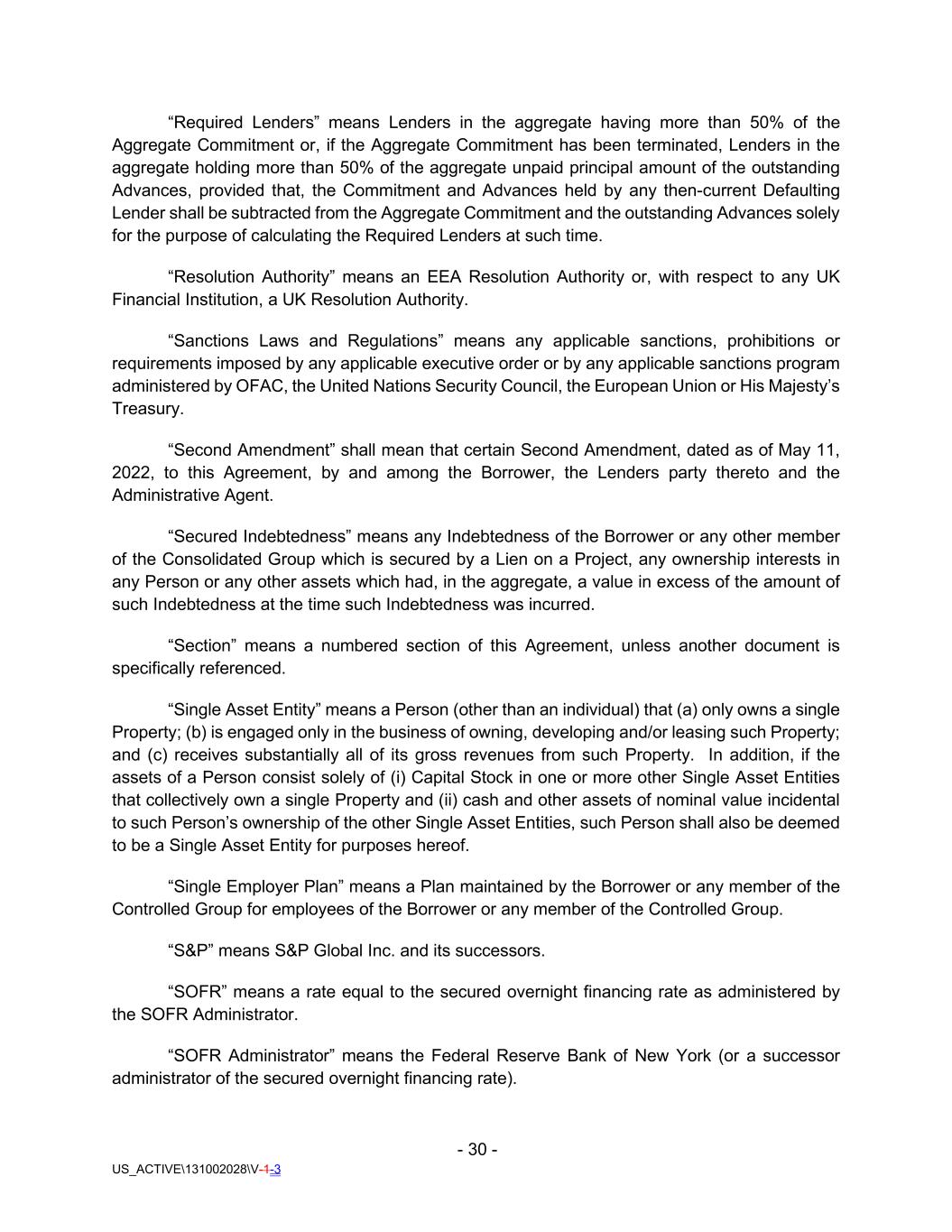 - 30 - US_ACTIVE\131002028\V-1-3 “Required Lenders” means Lenders in the aggregate having more than 50% of the Aggregate Commitment or, if the Aggregate Commitment has been terminated, Lenders in the aggregate holding more than 50% of the aggregate unpaid principal amount of the outstanding Advances, provided that, the Commitment and Advances held by any then-current Defaulting Lender shall be subtracted from the Aggregate Commitment and the outstanding Advances solely for the purpose of calculating the Required Lenders at such time. “Resolution Authority” means an EEA Resolution Authority or, with respect to any UK Financial Institution, a UK Resolution Authority. “Sanctions Laws and Regulations” means any applicable sanctions, prohibitions or requirements imposed by any applicable executive order or by any applicable sanctions program administered by OFAC, the United Nations Security Council, the European Union or His Majesty’s Treasury. “Second Amendment” shall mean that certain Second Amendment, dated as of May 11, 2022, to this Agreement, by and among the Borrower, the Lenders party thereto and the Administrative Agent. “Secured Indebtedness” means any Indebtedness of the Borrower or any other member of the Consolidated Group which is secured by a Lien on a Project, any ownership interests in any Person or any other assets which had, in the aggregate, a value in excess of the amount of such Indebtedness at the time such Indebtedness was incurred. “Section” means a numbered section of this Agreement, unless another document is specifically referenced. “Single Asset Entity” means a Person (other than an individual) that (a) only owns a single Property; (b) is engaged only in the business of owning, developing and/or leasing such Property; and (c) receives substantially all of its gross revenues from such Property. In addition, if the assets of a Person consist solely of (i) Capital Stock in one or more other Single Asset Entities that collectively own a single Property and (ii) cash and other assets of nominal value incidental to such Person’s ownership of the other Single Asset Entities, such Person shall also be deemed to be a Single Asset Entity for purposes hereof. “Single Employer Plan” means a Plan maintained by the Borrower or any member of the Controlled Group for employees of the Borrower or any member of the Controlled Group. “S&P” means S&P Global Inc. and its successors. “SOFR” means a rate equal to the secured overnight financing rate as administered by the SOFR Administrator. “SOFR Administrator” means the Federal Reserve Bank of New York (or a successor administrator of the secured overnight financing rate).