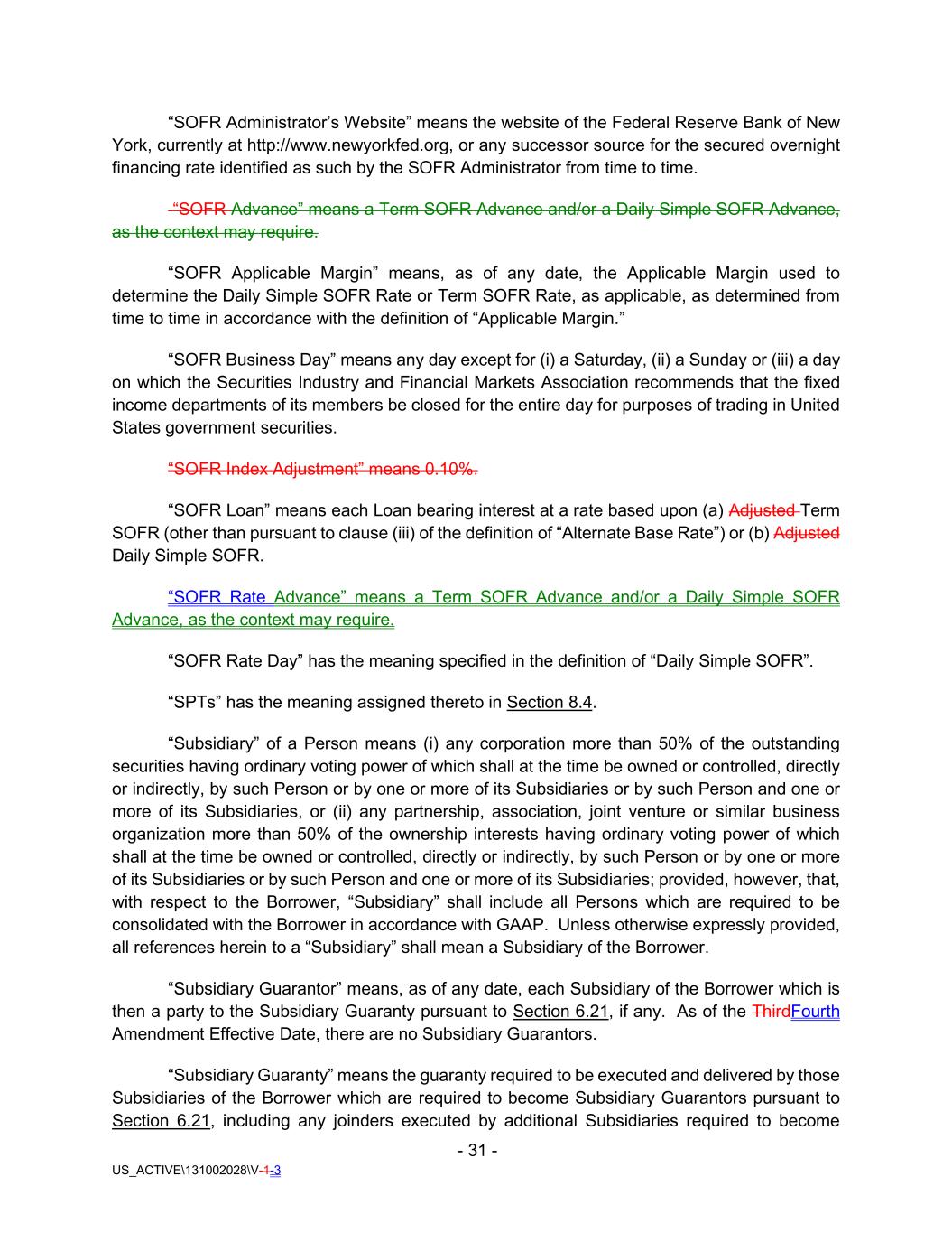 - 31 - US_ACTIVE\131002028\V-1-3 “SOFR Administrator’s Website” means the website of the Federal Reserve Bank of New York, currently at http://www.newyorkfed.org, or any successor source for the secured overnight financing rate identified as such by the SOFR Administrator from time to time. “SOFR Advance” means a Term SOFR Advance and/or a Daily Simple SOFR Advance, as the context may require. “SOFR Applicable Margin” means, as of any date, the Applicable Margin used to determine the Daily Simple SOFR Rate or Term SOFR Rate, as applicable, as determined from time to time in accordance with the definition of “Applicable Margin.” “SOFR Business Day” means any day except for (i) a Saturday, (ii) a Sunday or (iii) a day on which the Securities Industry and Financial Markets Association recommends that the fixed income departments of its members be closed for the entire day for purposes of trading in United States government securities. “SOFR Index Adjustment” means 0.10%. “SOFR Loan” means each Loan bearing interest at a rate based upon (a) Adjusted Term SOFR (other than pursuant to clause (iii) of the definition of “Alternate Base Rate”) or (b) Adjusted Daily Simple SOFR. “SOFR Rate Advance” means a Term SOFR Advance and/or a Daily Simple SOFR Advance, as the context may require. “SOFR Rate Day” has the meaning specified in the definition of “Daily Simple SOFR”. “SPTs” has the meaning assigned thereto in Section 8.4. “Subsidiary” of a Person means (i) any corporation more than 50% of the outstanding securities having ordinary voting power of which shall at the time be owned or controlled, directly or indirectly, by such Person or by one or more of its Subsidiaries or by such Person and one or more of its Subsidiaries, or (ii) any partnership, association, joint venture or similar business organization more than 50% of the ownership interests having ordinary voting power of which shall at the time be owned or controlled, directly or indirectly, by such Person or by one or more of its Subsidiaries or by such Person and one or more of its Subsidiaries; provided, however, that, with respect to the Borrower, “Subsidiary” shall include all Persons which are required to be consolidated with the Borrower in accordance with GAAP. Unless otherwise expressly provided, all references herein to a “Subsidiary” shall mean a Subsidiary of the Borrower. “Subsidiary Guarantor” means, as of any date, each Subsidiary of the Borrower which is then a party to the Subsidiary Guaranty pursuant to Section 6.21, if any. As of the ThirdFourth Amendment Effective Date, there are no Subsidiary Guarantors. “Subsidiary Guaranty” means the guaranty required to be executed and delivered by those Subsidiaries of the Borrower which are required to become Subsidiary Guarantors pursuant to Section 6.21, including any joinders executed by additional Subsidiaries required to become