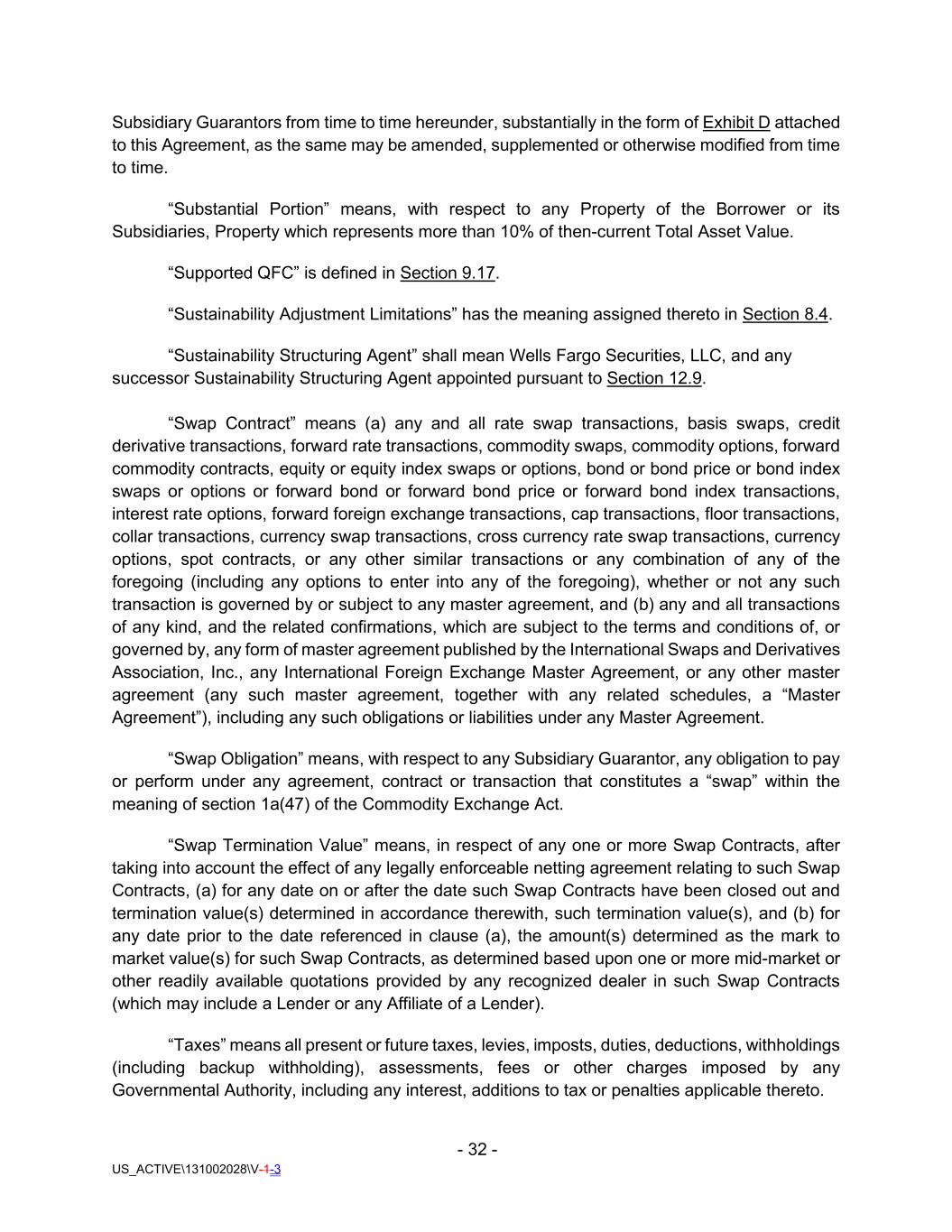 - 32 - US_ACTIVE\131002028\V-1-3 Subsidiary Guarantors from time to time hereunder, substantially in the form of Exhibit D attached to this Agreement, as the same may be amended, supplemented or otherwise modified from time to time. “Substantial Portion” means, with respect to any Property of the Borrower or its Subsidiaries, Property which represents more than 10% of then-current Total Asset Value. “Supported QFC” is defined in Section 9.17. “Sustainability Adjustment Limitations” has the meaning assigned thereto in Section 8.4. “Sustainability Structuring Agent” shall mean Wells Fargo Securities, LLC, and any successor Sustainability Structuring Agent appointed pursuant to Section 12.9. “Swap Contract” means (a) any and all rate swap transactions, basis swaps, credit derivative transactions, forward rate transactions, commodity swaps, commodity options, forward commodity contracts, equity or equity index swaps or options, bond or bond price or bond index swaps or options or forward bond or forward bond price or forward bond index transactions, interest rate options, forward foreign exchange transactions, cap transactions, floor transactions, collar transactions, currency swap transactions, cross currency rate swap transactions, currency options, spot contracts, or any other similar transactions or any combination of any of the foregoing (including any options to enter into any of the foregoing), whether or not any such transaction is governed by or subject to any master agreement, and (b) any and all transactions of any kind, and the related confirmations, which are subject to the terms and conditions of, or governed by, any form of master agreement published by the International Swaps and Derivatives Association, Inc., any International Foreign Exchange Master Agreement, or any other master agreement (any such master agreement, together with any related schedules, a “Master Agreement”), including any such obligations or liabilities under any Master Agreement. “Swap Obligation” means, with respect to any Subsidiary Guarantor, any obligation to pay or perform under any agreement, contract or transaction that constitutes a “swap” within the meaning of section 1a(47) of the Commodity Exchange Act. “Swap Termination Value” means, in respect of any one or more Swap Contracts, after taking into account the effect of any legally enforceable netting agreement relating to such Swap Contracts, (a) for any date on or after the date such Swap Contracts have been closed out and termination value(s) determined in accordance therewith, such termination value(s), and (b) for any date prior to the date referenced in clause (a), the amount(s) determined as the mark to market value(s) for such Swap Contracts, as determined based upon one or more mid-market or other readily available quotations provided by any recognized dealer in such Swap Contracts (which may include a Lender or any Affiliate of a Lender). “Taxes” means all present or future taxes, levies, imposts, duties, deductions, withholdings (including backup withholding), assessments, fees or other charges imposed by any Governmental Authority, including any interest, additions to tax or penalties applicable thereto.