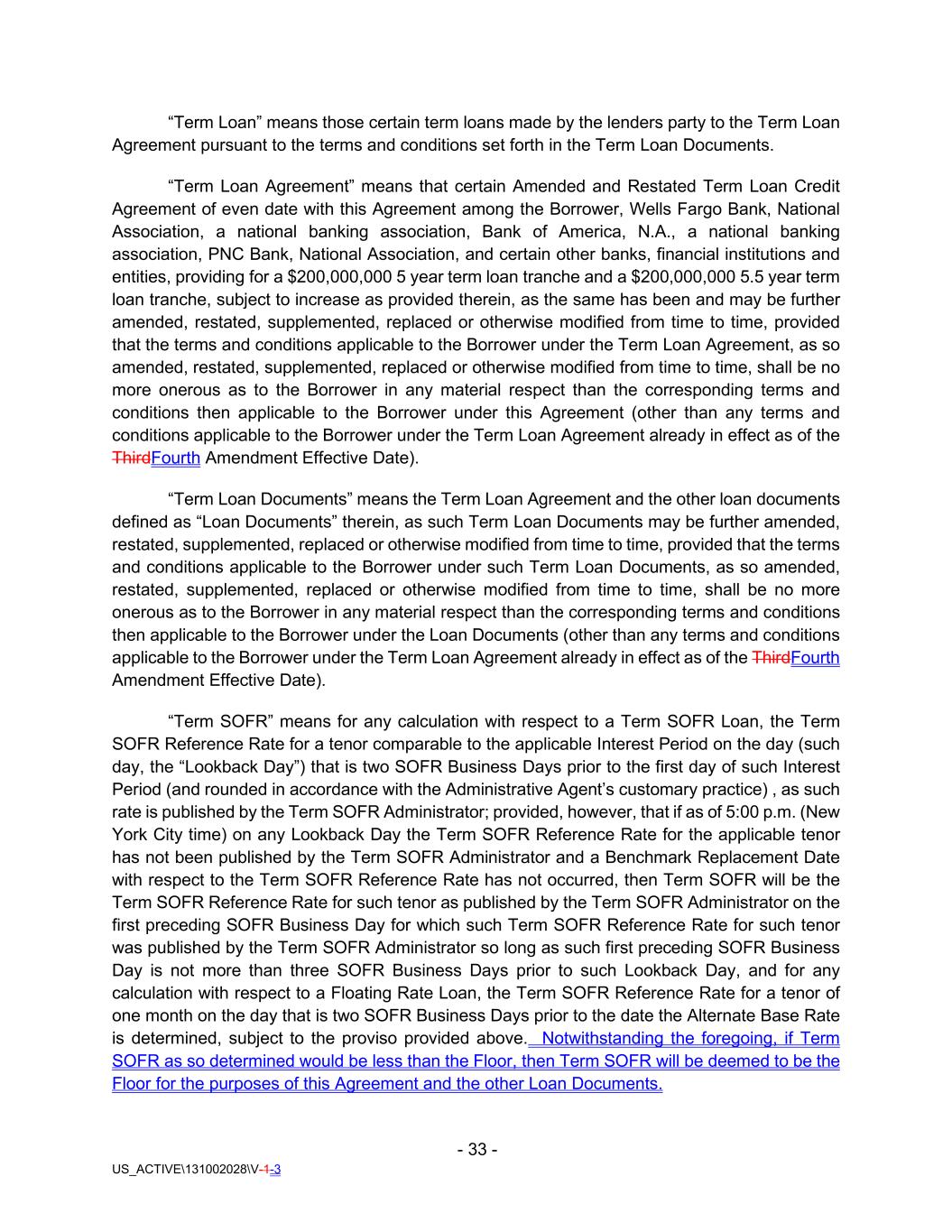- 33 - US_ACTIVE\131002028\V-1-3 “Term Loan” means those certain term loans made by the lenders party to the Term Loan Agreement pursuant to the terms and conditions set forth in the Term Loan Documents. “Term Loan Agreement” means that certain Amended and Restated Term Loan Credit Agreement of even date with this Agreement among the Borrower, Wells Fargo Bank, National Association, a national banking association, Bank of America, N.A., a national banking association, PNC Bank, National Association, and certain other banks, financial institutions and entities, providing for a $200,000,000 5 year term loan tranche and a $200,000,000 5.5 year term loan tranche, subject to increase as provided therein, as the same has been and may be further amended, restated, supplemented, replaced or otherwise modified from time to time, provided that the terms and conditions applicable to the Borrower under the Term Loan Agreement, as so amended, restated, supplemented, replaced or otherwise modified from time to time, shall be no more onerous as to the Borrower in any material respect than the corresponding terms and conditions then applicable to the Borrower under this Agreement (other than any terms and conditions applicable to the Borrower under the Term Loan Agreement already in effect as of the ThirdFourth Amendment Effective Date). “Term Loan Documents” means the Term Loan Agreement and the other loan documents defined as “Loan Documents” therein, as such Term Loan Documents may be further amended, restated, supplemented, replaced or otherwise modified from time to time, provided that the terms and conditions applicable to the Borrower under such Term Loan Documents, as so amended, restated, supplemented, replaced or otherwise modified from time to time, shall be no more onerous as to the Borrower in any material respect than the corresponding terms and conditions then applicable to the Borrower under the Loan Documents (other than any terms and conditions applicable to the Borrower under the Term Loan Agreement already in effect as of the ThirdFourth Amendment Effective Date). “Term SOFR” means for any calculation with respect to a Term SOFR Loan, the Term SOFR Reference Rate for a tenor comparable to the applicable Interest Period on the day (such day, the “Lookback Day”) that is two SOFR Business Days prior to the first day of such Interest Period (and rounded in accordance with the Administrative Agent’s customary practice) , as such rate is published by the Term SOFR Administrator; provided, however, that if as of 5:00 p.m. (New York City time) on any Lookback Day the Term SOFR Reference Rate for the applicable tenor has not been published by the Term SOFR Administrator and a Benchmark Replacement Date with respect to the Term SOFR Reference Rate has not occurred, then Term SOFR will be the Term SOFR Reference Rate for such tenor as published by the Term SOFR Administrator on the first preceding SOFR Business Day for which such Term SOFR Reference Rate for such tenor was published by the Term SOFR Administrator so long as such first preceding SOFR Business Day is not more than three SOFR Business Days prior to such Lookback Day, and for any calculation with respect to a Floating Rate Loan, the Term SOFR Reference Rate for a tenor of one month on the day that is two SOFR Business Days prior to the date the Alternate Base Rate is determined, subject to the proviso provided above. Notwithstanding the foregoing, if Term SOFR as so determined would be less than the Floor, then Term SOFR will be deemed to be the Floor for the purposes of this Agreement and the other Loan Documents.