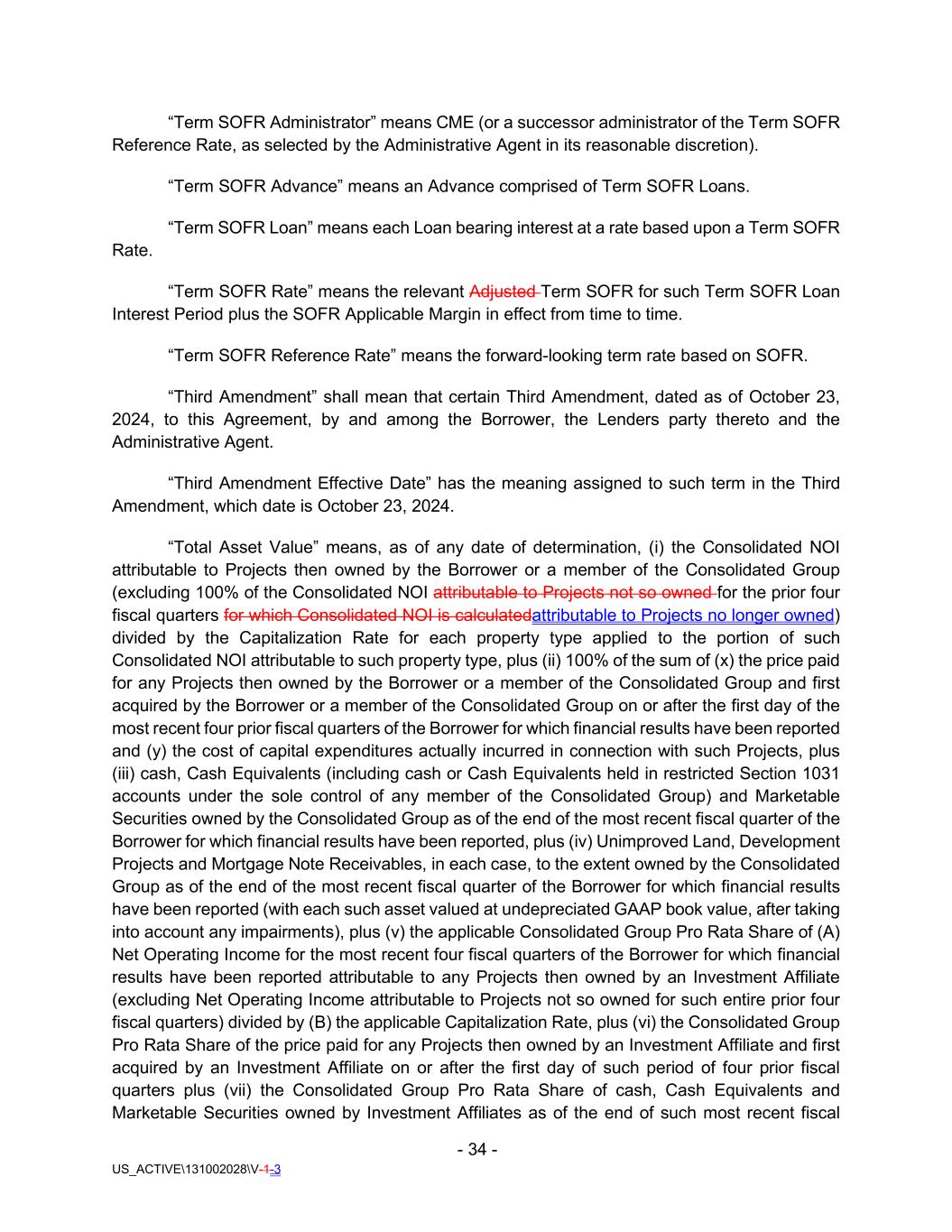 - 34 - US_ACTIVE\131002028\V-1-3 “Term SOFR Administrator” means CME (or a successor administrator of the Term SOFR Reference Rate, as selected by the Administrative Agent in its reasonable discretion). “Term SOFR Advance” means an Advance comprised of Term SOFR Loans. “Term SOFR Loan” means each Loan bearing interest at a rate based upon a Term SOFR Rate. “Term SOFR Rate” means the relevant Adjusted Term SOFR for such Term SOFR Loan Interest Period plus the SOFR Applicable Margin in effect from time to time. “Term SOFR Reference Rate” means the forward-looking term rate based on SOFR. “Third Amendment” shall mean that certain Third Amendment, dated as of October 23, 2024, to this Agreement, by and among the Borrower, the Lenders party thereto and the Administrative Agent. “Third Amendment Effective Date” has the meaning assigned to such term in the Third Amendment, which date is October 23, 2024. “Total Asset Value” means, as of any date of determination, (i) the Consolidated NOI attributable to Projects then owned by the Borrower or a member of the Consolidated Group (excluding 100% of the Consolidated NOI attributable to Projects not so owned for the prior four fiscal quarters for which Consolidated NOI is calculatedattributable to Projects no longer owned) divided by the Capitalization Rate for each property type applied to the portion of such Consolidated NOI attributable to such property type, plus (ii) 100% of the sum of (x) the price paid for any Projects then owned by the Borrower or a member of the Consolidated Group and first acquired by the Borrower or a member of the Consolidated Group on or after the first day of the most recent four prior fiscal quarters of the Borrower for which financial results have been reported and (y) the cost of capital expenditures actually incurred in connection with such Projects, plus (iii) cash, Cash Equivalents (including cash or Cash Equivalents held in restricted Section 1031 accounts under the sole control of any member of the Consolidated Group) and Marketable Securities owned by the Consolidated Group as of the end of the most recent fiscal quarter of the Borrower for which financial results have been reported, plus (iv) Unimproved Land, Development Projects and Mortgage Note Receivables, in each case, to the extent owned by the Consolidated Group as of the end of the most recent fiscal quarter of the Borrower for which financial results have been reported (with each such asset valued at undepreciated GAAP book value, after taking into account any impairments), plus (v) the applicable Consolidated Group Pro Rata Share of (A) Net Operating Income for the most recent four fiscal quarters of the Borrower for which financial results have been reported attributable to any Projects then owned by an Investment Affiliate (excluding Net Operating Income attributable to Projects not so owned for such entire prior four fiscal quarters) divided by (B) the applicable Capitalization Rate, plus (vi) the Consolidated Group Pro Rata Share of the price paid for any Projects then owned by an Investment Affiliate and first acquired by an Investment Affiliate on or after the first day of such period of four prior fiscal quarters plus (vii) the Consolidated Group Pro Rata Share of cash, Cash Equivalents and Marketable Securities owned by Investment Affiliates as of the end of such most recent fiscal