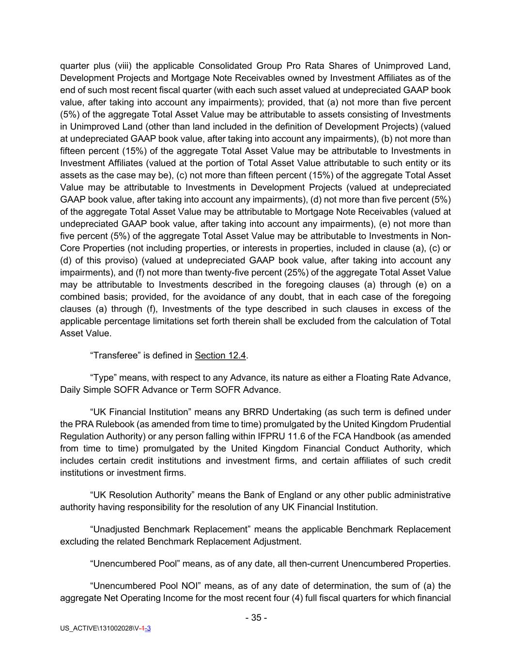 - 35 - US_ACTIVE\131002028\V-1-3 quarter plus (viii) the applicable Consolidated Group Pro Rata Shares of Unimproved Land, Development Projects and Mortgage Note Receivables owned by Investment Affiliates as of the end of such most recent fiscal quarter (with each such asset valued at undepreciated GAAP book value, after taking into account any impairments); provided, that (a) not more than five percent (5%) of the aggregate Total Asset Value may be attributable to assets consisting of Investments in Unimproved Land (other than land included in the definition of Development Projects) (valued at undepreciated GAAP book value, after taking into account any impairments), (b) not more than fifteen percent (15%) of the aggregate Total Asset Value may be attributable to Investments in Investment Affiliates (valued at the portion of Total Asset Value attributable to such entity or its assets as the case may be), (c) not more than fifteen percent (15%) of the aggregate Total Asset Value may be attributable to Investments in Development Projects (valued at undepreciated GAAP book value, after taking into account any impairments), (d) not more than five percent (5%) of the aggregate Total Asset Value may be attributable to Mortgage Note Receivables (valued at undepreciated GAAP book value, after taking into account any impairments), (e) not more than five percent (5%) of the aggregate Total Asset Value may be attributable to Investments in Non- Core Properties (not including properties, or interests in properties, included in clause (a), (c) or (d) of this proviso) (valued at undepreciated GAAP book value, after taking into account any impairments), and (f) not more than twenty-five percent (25%) of the aggregate Total Asset Value may be attributable to Investments described in the foregoing clauses (a) through (e) on a combined basis; provided, for the avoidance of any doubt, that in each case of the foregoing clauses (a) through (f), Investments of the type described in such clauses in excess of the applicable percentage limitations set forth therein shall be excluded from the calculation of Total Asset Value. “Transferee” is defined in Section 12.4. “Type” means, with respect to any Advance, its nature as either a Floating Rate Advance, Daily Simple SOFR Advance or Term SOFR Advance. “UK Financial Institution” means any BRRD Undertaking (as such term is defined under the PRA Rulebook (as amended from time to time) promulgated by the United Kingdom Prudential Regulation Authority) or any person falling within IFPRU 11.6 of the FCA Handbook (as amended from time to time) promulgated by the United Kingdom Financial Conduct Authority, which includes certain credit institutions and investment firms, and certain affiliates of such credit institutions or investment firms. “UK Resolution Authority” means the Bank of England or any other public administrative authority having responsibility for the resolution of any UK Financial Institution. “Unadjusted Benchmark Replacement” means the applicable Benchmark Replacement excluding the related Benchmark Replacement Adjustment. “Unencumbered Pool” means, as of any date, all then-current Unencumbered Properties. “Unencumbered Pool NOI” means, as of any date of determination, the sum of (a) the aggregate Net Operating Income for the most recent four (4) full fiscal quarters for which financial