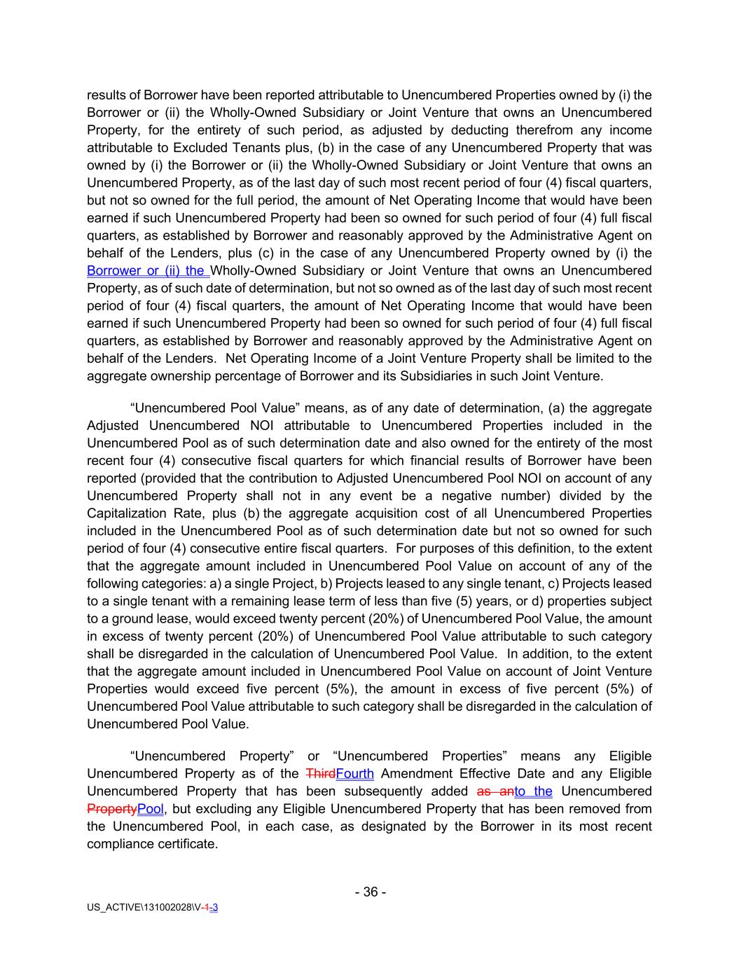 - 36 - US_ACTIVE\131002028\V-1-3 results of Borrower have been reported attributable to Unencumbered Properties owned by (i) the Borrower or (ii) the Wholly-Owned Subsidiary or Joint Venture that owns an Unencumbered Property, for the entirety of such period, as adjusted by deducting therefrom any income attributable to Excluded Tenants plus, (b) in the case of any Unencumbered Property that was owned by (i) the Borrower or (ii) the Wholly-Owned Subsidiary or Joint Venture that owns an Unencumbered Property, as of the last day of such most recent period of four (4) fiscal quarters, but not so owned for the full period, the amount of Net Operating Income that would have been earned if such Unencumbered Property had been so owned for such period of four (4) full fiscal quarters, as established by Borrower and reasonably approved by the Administrative Agent on behalf of the Lenders, plus (c) in the case of any Unencumbered Property owned by (i) the Borrower or (ii) the Wholly-Owned Subsidiary or Joint Venture that owns an Unencumbered Property, as of such date of determination, but not so owned as of the last day of such most recent period of four (4) fiscal quarters, the amount of Net Operating Income that would have been earned if such Unencumbered Property had been so owned for such period of four (4) full fiscal quarters, as established by Borrower and reasonably approved by the Administrative Agent on behalf of the Lenders. Net Operating Income of a Joint Venture Property shall be limited to the aggregate ownership percentage of Borrower and its Subsidiaries in such Joint Venture. “Unencumbered Pool Value” means, as of any date of determination, (a) the aggregate Adjusted Unencumbered NOI attributable to Unencumbered Properties included in the Unencumbered Pool as of such determination date and also owned for the entirety of the most recent four (4) consecutive fiscal quarters for which financial results of Borrower have been reported (provided that the contribution to Adjusted Unencumbered Pool NOI on account of any Unencumbered Property shall not in any event be a negative number) divided by the Capitalization Rate, plus (b) the aggregate acquisition cost of all Unencumbered Properties included in the Unencumbered Pool as of such determination date but not so owned for such period of four (4) consecutive entire fiscal quarters. For purposes of this definition, to the extent that the aggregate amount included in Unencumbered Pool Value on account of any of the following categories: a) a single Project, b) Projects leased to any single tenant, c) Projects leased to a single tenant with a remaining lease term of less than five (5) years, or d) properties subject to a ground lease, would exceed twenty percent (20%) of Unencumbered Pool Value, the amount in excess of twenty percent (20%) of Unencumbered Pool Value attributable to such category shall be disregarded in the calculation of Unencumbered Pool Value. In addition, to the extent that the aggregate amount included in Unencumbered Pool Value on account of Joint Venture Properties would exceed five percent (5%), the amount in excess of five percent (5%) of Unencumbered Pool Value attributable to such category shall be disregarded in the calculation of Unencumbered Pool Value. “Unencumbered Property” or “Unencumbered Properties” means any Eligible Unencumbered Property as of the ThirdFourth Amendment Effective Date and any Eligible Unencumbered Property that has been subsequently added as anto the Unencumbered PropertyPool, but excluding any Eligible Unencumbered Property that has been removed from the Unencumbered Pool, in each case, as designated by the Borrower in its most recent compliance certificate.