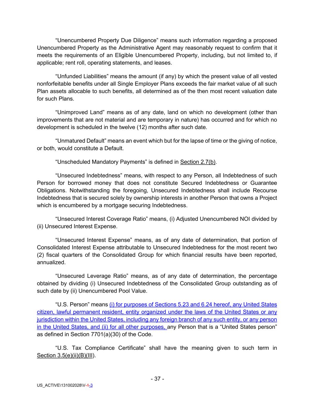 - 37 - US_ACTIVE\131002028\V-1-3 “Unencumbered Property Due Diligence” means such information regarding a proposed Unencumbered Property as the Administrative Agent may reasonably request to confirm that it meets the requirements of an Eligible Unencumbered Property, including, but not limited to, if applicable; rent roll, operating statements, and leases. “Unfunded Liabilities” means the amount (if any) by which the present value of all vested nonforfeitable benefits under all Single Employer Plans exceeds the fair market value of all such Plan assets allocable to such benefits, all determined as of the then most recent valuation date for such Plans. “Unimproved Land” means as of any date, land on which no development (other than improvements that are not material and are temporary in nature) has occurred and for which no development is scheduled in the twelve (12) months after such date. “Unmatured Default” means an event which but for the lapse of time or the giving of notice, or both, would constitute a Default. “Unscheduled Mandatory Payments” is defined in Section 2.7(b). “Unsecured Indebtedness” means, with respect to any Person, all Indebtedness of such Person for borrowed money that does not constitute Secured Indebtedness or Guarantee Obligations. Notwithstanding the foregoing, Unsecured Indebtedness shall include Recourse Indebtedness that is secured solely by ownership interests in another Person that owns a Project which is encumbered by a mortgage securing Indebtedness. “Unsecured Interest Coverage Ratio” means, (i) Adjusted Unencumbered NOI divided by (ii) Unsecured Interest Expense. “Unsecured Interest Expense” means, as of any date of determination, that portion of Consolidated Interest Expense attributable to Unsecured Indebtedness for the most recent two (2) fiscal quarters of the Consolidated Group for which financial results have been reported, annualized. “Unsecured Leverage Ratio” means, as of any date of determination, the percentage obtained by dividing (i) Unsecured Indebtedness of the Consolidated Group outstanding as of such date by (ii) Unencumbered Pool Value. “U.S. Person” means (i) for purposes of Sections 5.23 and 6.24 hereof, any United States citizen, lawful permanent resident, entity organized under the laws of the United States or any jurisdiction within the United States, including any foreign branch of any such entity, or any person in the United States, and (ii) for all other purposes, any Person that is a “United States person” as defined in Section 7701(a)(30) of the Code. “U.S. Tax Compliance Certificate” shall have the meaning given to such term in Section 3.5(e)(ii)(B)(III).