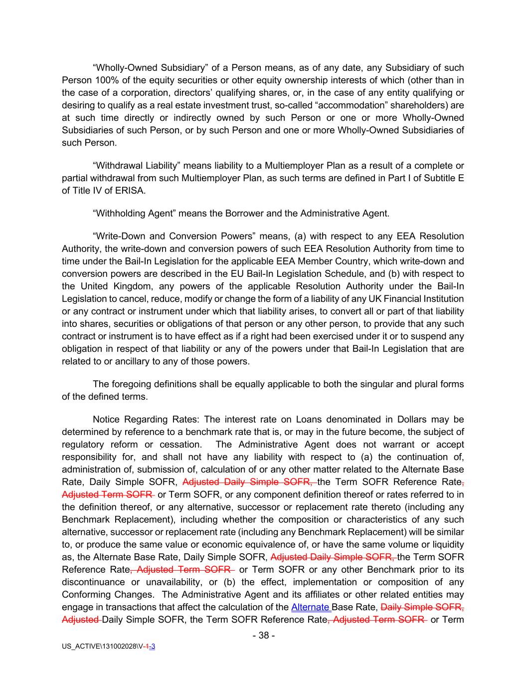- 38 - US_ACTIVE\131002028\V-1-3 “Wholly-Owned Subsidiary” of a Person means, as of any date, any Subsidiary of such Person 100% of the equity securities or other equity ownership interests of which (other than in the case of a corporation, directors’ qualifying shares, or, in the case of any entity qualifying or desiring to qualify as a real estate investment trust, so-called “accommodation” shareholders) are at such time directly or indirectly owned by such Person or one or more Wholly-Owned Subsidiaries of such Person, or by such Person and one or more Wholly-Owned Subsidiaries of such Person. “Withdrawal Liability” means liability to a Multiemployer Plan as a result of a complete or partial withdrawal from such Multiemployer Plan, as such terms are defined in Part I of Subtitle E of Title IV of ERISA. “Withholding Agent” means the Borrower and the Administrative Agent. “Write-Down and Conversion Powers” means, (a) with respect to any EEA Resolution Authority, the write-down and conversion powers of such EEA Resolution Authority from time to time under the Bail-In Legislation for the applicable EEA Member Country, which write-down and conversion powers are described in the EU Bail-In Legislation Schedule, and (b) with respect to the United Kingdom, any powers of the applicable Resolution Authority under the Bail-In Legislation to cancel, reduce, modify or change the form of a liability of any UK Financial Institution or any contract or instrument under which that liability arises, to convert all or part of that liability into shares, securities or obligations of that person or any other person, to provide that any such contract or instrument is to have effect as if a right had been exercised under it or to suspend any obligation in respect of that liability or any of the powers under that Bail-In Legislation that are related to or ancillary to any of those powers. The foregoing definitions shall be equally applicable to both the singular and plural forms of the defined terms. Notice Regarding Rates: The interest rate on Loans denominated in Dollars may be determined by reference to a benchmark rate that is, or may in the future become, the subject of regulatory reform or cessation. The Administrative Agent does not warrant or accept responsibility for, and shall not have any liability with respect to (a) the continuation of, administration of, submission of, calculation of or any other matter related to the Alternate Base Rate, Daily Simple SOFR, Adjusted Daily Simple SOFR, the Term SOFR Reference Rate, Adjusted Term SOFR or Term SOFR, or any component definition thereof or rates referred to in the definition thereof, or any alternative, successor or replacement rate thereto (including any Benchmark Replacement), including whether the composition or characteristics of any such alternative, successor or replacement rate (including any Benchmark Replacement) will be similar to, or produce the same value or economic equivalence of, or have the same volume or liquidity as, the Alternate Base Rate, Daily Simple SOFR, Adjusted Daily Simple SOFR, the Term SOFR Reference Rate, Adjusted Term SOFR or Term SOFR or any other Benchmark prior to its discontinuance or unavailability, or (b) the effect, implementation or composition of any Conforming Changes. The Administrative Agent and its affiliates or other related entities may engage in transactions that affect the calculation of the Alternate Base Rate, Daily Simple SOFR, Adjusted Daily Simple SOFR, the Term SOFR Reference Rate, Adjusted Term SOFR or Term