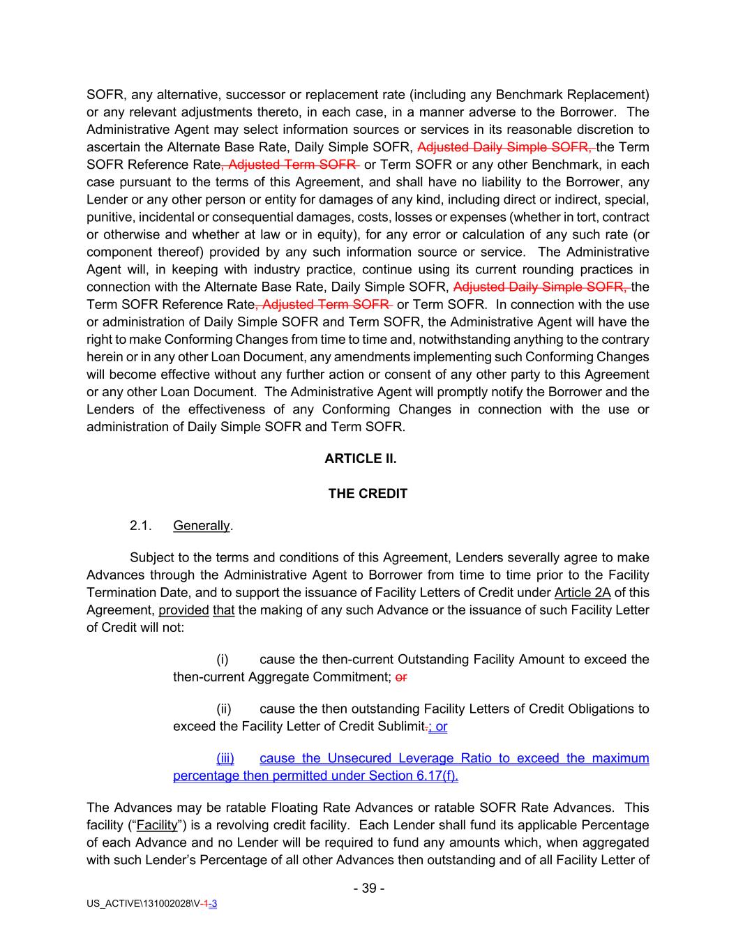 - 39 - US_ACTIVE\131002028\V-1-3 SOFR, any alternative, successor or replacement rate (including any Benchmark Replacement) or any relevant adjustments thereto, in each case, in a manner adverse to the Borrower. The Administrative Agent may select information sources or services in its reasonable discretion to ascertain the Alternate Base Rate, Daily Simple SOFR, Adjusted Daily Simple SOFR, the Term SOFR Reference Rate, Adjusted Term SOFR or Term SOFR or any other Benchmark, in each case pursuant to the terms of this Agreement, and shall have no liability to the Borrower, any Lender or any other person or entity for damages of any kind, including direct or indirect, special, punitive, incidental or consequential damages, costs, losses or expenses (whether in tort, contract or otherwise and whether at law or in equity), for any error or calculation of any such rate (or component thereof) provided by any such information source or service. The Administrative Agent will, in keeping with industry practice, continue using its current rounding practices in connection with the Alternate Base Rate, Daily Simple SOFR, Adjusted Daily Simple SOFR, the Term SOFR Reference Rate, Adjusted Term SOFR or Term SOFR. In connection with the use or administration of Daily Simple SOFR and Term SOFR, the Administrative Agent will have the right to make Conforming Changes from time to time and, notwithstanding anything to the contrary herein or in any other Loan Document, any amendments implementing such Conforming Changes will become effective without any further action or consent of any other party to this Agreement or any other Loan Document. The Administrative Agent will promptly notify the Borrower and the Lenders of the effectiveness of any Conforming Changes in connection with the use or administration of Daily Simple SOFR and Term SOFR. ARTICLE II. THE CREDIT 2.1. Generally. Subject to the terms and conditions of this Agreement, Lenders severally agree to make Advances through the Administrative Agent to Borrower from time to time prior to the Facility Termination Date, and to support the issuance of Facility Letters of Credit under Article 2A of this Agreement, provided that the making of any such Advance or the issuance of such Facility Letter of Credit will not: (i) cause the then-current Outstanding Facility Amount to exceed the then-current Aggregate Commitment; or (ii) cause the then outstanding Facility Letters of Credit Obligations to exceed the Facility Letter of Credit Sublimit.; or (iii) cause the Unsecured Leverage Ratio to exceed the maximum percentage then permitted under Section 6.17(f). The Advances may be ratable Floating Rate Advances or ratable SOFR Rate Advances. This facility (“Facility”) is a revolving credit facility. Each Lender shall fund its applicable Percentage of each Advance and no Lender will be required to fund any amounts which, when aggregated with such Lender’s Percentage of all other Advances then outstanding and of all Facility Letter of