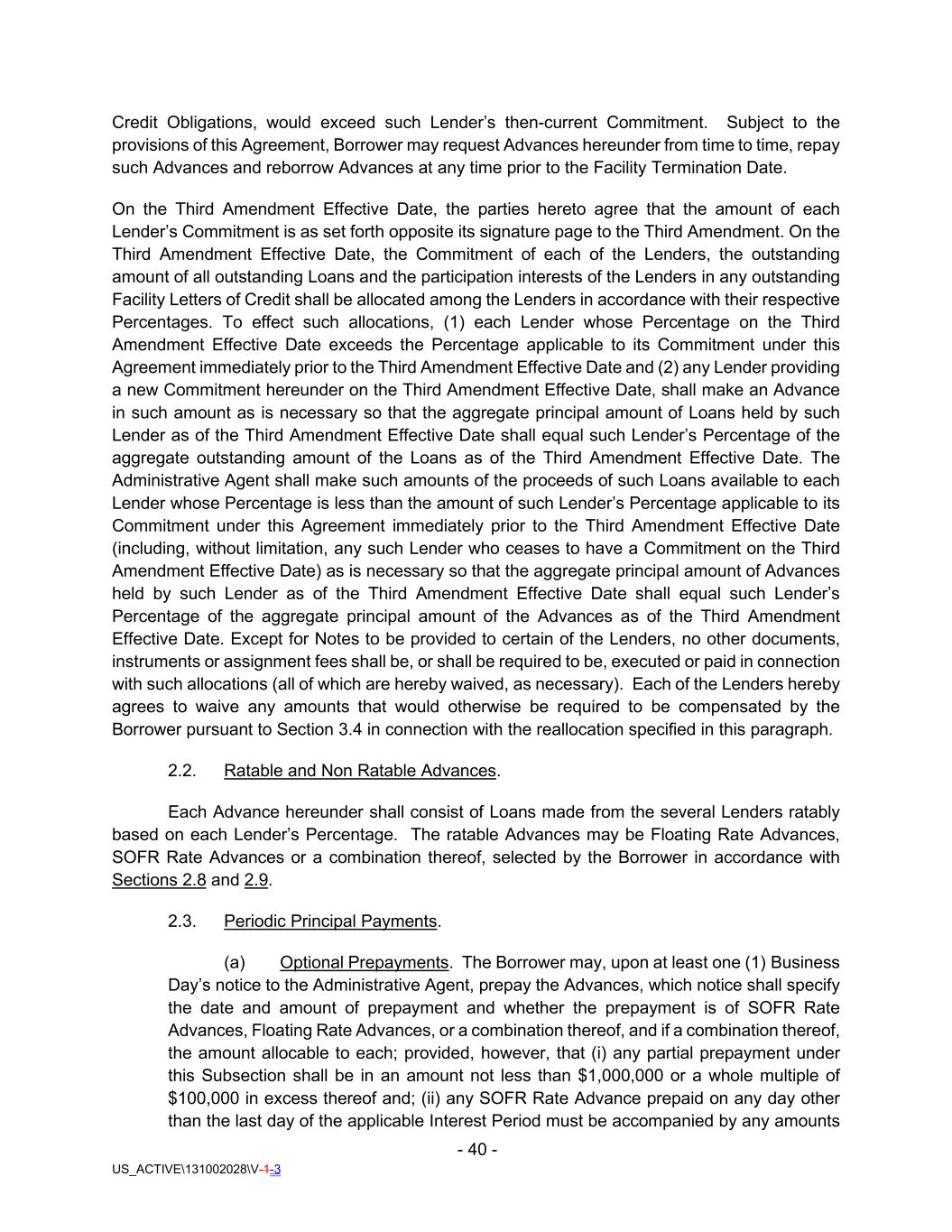 - 40 - US_ACTIVE\131002028\V-1-3 Credit Obligations, would exceed such Lender’s then-current Commitment. Subject to the provisions of this Agreement, Borrower may request Advances hereunder from time to time, repay such Advances and reborrow Advances at any time prior to the Facility Termination Date. On the Third Amendment Effective Date, the parties hereto agree that the amount of each Lender’s Commitment is as set forth opposite its signature page to the Third Amendment. On the Third Amendment Effective Date, the Commitment of each of the Lenders, the outstanding amount of all outstanding Loans and the participation interests of the Lenders in any outstanding Facility Letters of Credit shall be allocated among the Lenders in accordance with their respective Percentages. To effect such allocations, (1) each Lender whose Percentage on the Third Amendment Effective Date exceeds the Percentage applicable to its Commitment under this Agreement immediately prior to the Third Amendment Effective Date and (2) any Lender providing a new Commitment hereunder on the Third Amendment Effective Date, shall make an Advance in such amount as is necessary so that the aggregate principal amount of Loans held by such Lender as of the Third Amendment Effective Date shall equal such Lender’s Percentage of the aggregate outstanding amount of the Loans as of the Third Amendment Effective Date. The Administrative Agent shall make such amounts of the proceeds of such Loans available to each Lender whose Percentage is less than the amount of such Lender’s Percentage applicable to its Commitment under this Agreement immediately prior to the Third Amendment Effective Date (including, without limitation, any such Lender who ceases to have a Commitment on the Third Amendment Effective Date) as is necessary so that the aggregate principal amount of Advances held by such Lender as of the Third Amendment Effective Date shall equal such Lender’s Percentage of the aggregate principal amount of the Advances as of the Third Amendment Effective Date. Except for Notes to be provided to certain of the Lenders, no other documents, instruments or assignment fees shall be, or shall be required to be, executed or paid in connection with such allocations (all of which are hereby waived, as necessary). Each of the Lenders hereby agrees to waive any amounts that would otherwise be required to be compensated by the Borrower pursuant to Section 3.4 in connection with the reallocation specified in this paragraph. 2.2. Ratable and Non Ratable Advances. Each Advance hereunder shall consist of Loans made from the several Lenders ratably based on each Lender’s Percentage. The ratable Advances may be Floating Rate Advances, SOFR Rate Advances or a combination thereof, selected by the Borrower in accordance with Sections 2.8 and 2.9. 2.3. Periodic Principal Payments. (a) Optional Prepayments. The Borrower may, upon at least one (1) Business Day’s notice to the Administrative Agent, prepay the Advances, which notice shall specify the date and amount of prepayment and whether the prepayment is of SOFR Rate Advances, Floating Rate Advances, or a combination thereof, and if a combination thereof, the amount allocable to each; provided, however, that (i) any partial prepayment under this Subsection shall be in an amount not less than $1,000,000 or a whole multiple of $100,000 in excess thereof and; (ii) any SOFR Rate Advance prepaid on any day other than the last day of the applicable Interest Period must be accompanied by any amounts