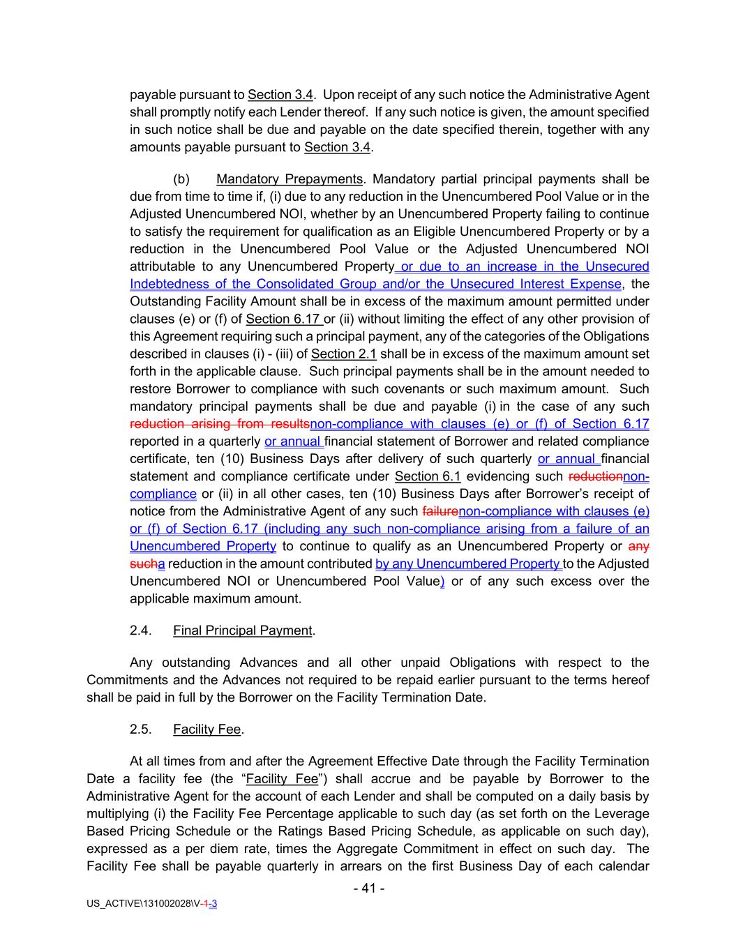 - 41 - US_ACTIVE\131002028\V-1-3 payable pursuant to Section 3.4. Upon receipt of any such notice the Administrative Agent shall promptly notify each Lender thereof. If any such notice is given, the amount specified in such notice shall be due and payable on the date specified therein, together with any amounts payable pursuant to Section 3.4. (b) Mandatory Prepayments. Mandatory partial principal payments shall be due from time to time if, (i) due to any reduction in the Unencumbered Pool Value or in the Adjusted Unencumbered NOI, whether by an Unencumbered Property failing to continue to satisfy the requirement for qualification as an Eligible Unencumbered Property or by a reduction in the Unencumbered Pool Value or the Adjusted Unencumbered NOI attributable to any Unencumbered Property or due to an increase in the Unsecured Indebtedness of the Consolidated Group and/or the Unsecured Interest Expense, the Outstanding Facility Amount shall be in excess of the maximum amount permitted under clauses (e) or (f) of Section 6.17 or (ii) without limiting the effect of any other provision of this Agreement requiring such a principal payment, any of the categories of the Obligations described in clauses (i) - (iii) of Section 2.1 shall be in excess of the maximum amount set forth in the applicable clause. Such principal payments shall be in the amount needed to restore Borrower to compliance with such covenants or such maximum amount. Such mandatory principal payments shall be due and payable (i) in the case of any such reduction arising from resultsnon-compliance with clauses (e) or (f) of Section 6.17 reported in a quarterly or annual financial statement of Borrower and related compliance certificate, ten (10) Business Days after delivery of such quarterly or annual financial statement and compliance certificate under Section 6.1 evidencing such reductionnon- compliance or (ii) in all other cases, ten (10) Business Days after Borrower’s receipt of notice from the Administrative Agent of any such failurenon-compliance with clauses (e) or (f) of Section 6.17 (including any such non-compliance arising from a failure of an Unencumbered Property to continue to qualify as an Unencumbered Property or any sucha reduction in the amount contributed by any Unencumbered Property to the Adjusted Unencumbered NOI or Unencumbered Pool Value) or of any such excess over the applicable maximum amount. 2.4. Final Principal Payment. Any outstanding Advances and all other unpaid Obligations with respect to the Commitments and the Advances not required to be repaid earlier pursuant to the terms hereof shall be paid in full by the Borrower on the Facility Termination Date. 2.5. Facility Fee. At all times from and after the Agreement Effective Date through the Facility Termination Date a facility fee (the “Facility Fee”) shall accrue and be payable by Borrower to the Administrative Agent for the account of each Lender and shall be computed on a daily basis by multiplying (i) the Facility Fee Percentage applicable to such day (as set forth on the Leverage Based Pricing Schedule or the Ratings Based Pricing Schedule, as applicable on such day), expressed as a per diem rate, times the Aggregate Commitment in effect on such day. The Facility Fee shall be payable quarterly in arrears on the first Business Day of each calendar