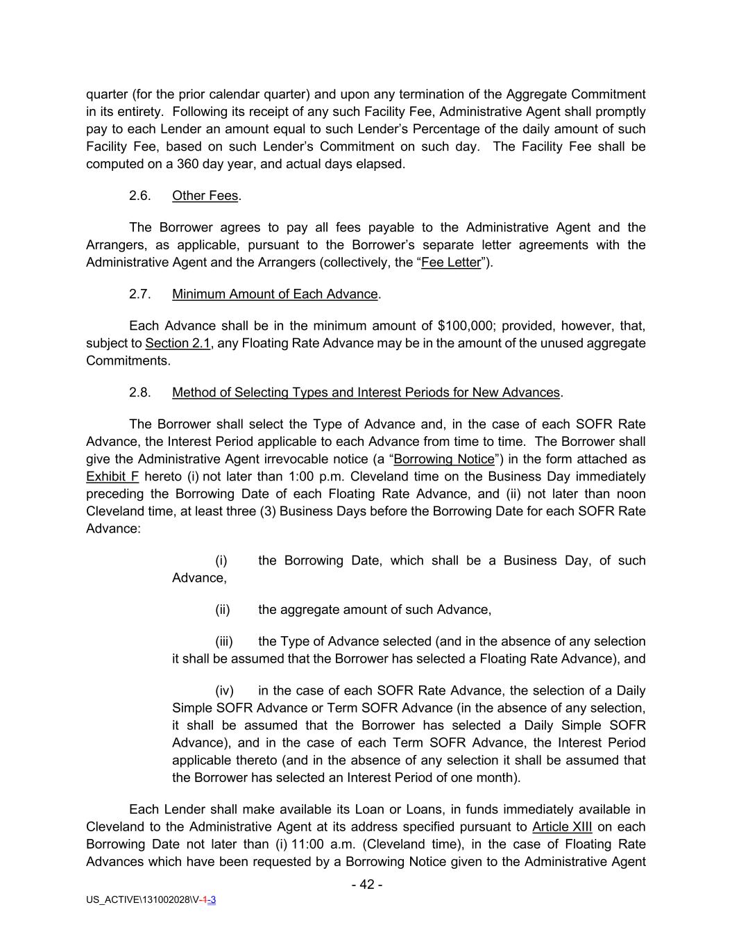 - 42 - US_ACTIVE\131002028\V-1-3 quarter (for the prior calendar quarter) and upon any termination of the Aggregate Commitment in its entirety. Following its receipt of any such Facility Fee, Administrative Agent shall promptly pay to each Lender an amount equal to such Lender’s Percentage of the daily amount of such Facility Fee, based on such Lender’s Commitment on such day. The Facility Fee shall be computed on a 360 day year, and actual days elapsed. 2.6. Other Fees. The Borrower agrees to pay all fees payable to the Administrative Agent and the Arrangers, as applicable, pursuant to the Borrower’s separate letter agreements with the Administrative Agent and the Arrangers (collectively, the “Fee Letter”). 2.7. Minimum Amount of Each Advance. Each Advance shall be in the minimum amount of $100,000; provided, however, that, subject to Section 2.1, any Floating Rate Advance may be in the amount of the unused aggregate Commitments. 2.8. Method of Selecting Types and Interest Periods for New Advances. The Borrower shall select the Type of Advance and, in the case of each SOFR Rate Advance, the Interest Period applicable to each Advance from time to time. The Borrower shall give the Administrative Agent irrevocable notice (a “Borrowing Notice”) in the form attached as Exhibit F hereto (i) not later than 1:00 p.m. Cleveland time on the Business Day immediately preceding the Borrowing Date of each Floating Rate Advance, and (ii) not later than noon Cleveland time, at least three (3) Business Days before the Borrowing Date for each SOFR Rate Advance: (i) the Borrowing Date, which shall be a Business Day, of such Advance, (ii) the aggregate amount of such Advance, (iii) the Type of Advance selected (and in the absence of any selection it shall be assumed that the Borrower has selected a Floating Rate Advance), and (iv) in the case of each SOFR Rate Advance, the selection of a Daily Simple SOFR Advance or Term SOFR Advance (in the absence of any selection, it shall be assumed that the Borrower has selected a Daily Simple SOFR Advance), and in the case of each Term SOFR Advance, the Interest Period applicable thereto (and in the absence of any selection it shall be assumed that the Borrower has selected an Interest Period of one month). Each Lender shall make available its Loan or Loans, in funds immediately available in Cleveland to the Administrative Agent at its address specified pursuant to Article XIII on each Borrowing Date not later than (i) 11:00 a.m. (Cleveland time), in the case of Floating Rate Advances which have been requested by a Borrowing Notice given to the Administrative Agent