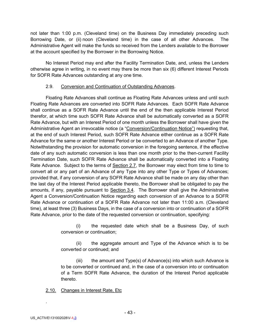 - 43 - US_ACTIVE\131002028\V-1-3 not later than 1:00 p.m. (Cleveland time) on the Business Day immediately preceding such Borrowing Date, or (ii) noon (Cleveland time) in the case of all other Advances. The Administrative Agent will make the funds so received from the Lenders available to the Borrower at the account specified by the Borrower in the Borrowing Notice. No Interest Period may end after the Facility Termination Date, and, unless the Lenders otherwise agree in writing, in no event may there be more than six (6) different Interest Periods for SOFR Rate Advances outstanding at any one time. 2.9. Conversion and Continuation of Outstanding Advances. Floating Rate Advances shall continue as Floating Rate Advances unless and until such Floating Rate Advances are converted into SOFR Rate Advances. Each SOFR Rate Advance shall continue as a SOFR Rate Advance until the end of the then applicable Interest Period therefor, at which time such SOFR Rate Advance shall be automatically converted as a SOFR Rate Advance, but with an Interest Period of one month unless the Borrower shall have given the Administrative Agent an irrevocable notice (a “Conversion/Continuation Notice”) requesting that, at the end of such Interest Period, such SOFR Rate Advance either continue as a SOFR Rate Advance for the same or another Interest Period or be converted to an Advance of another Type. Notwithstanding the provision for automatic conversion in the foregoing sentence, if the effective date of any such automatic conversion is less than one month prior to the then-current Facility Termination Date, such SOFR Rate Advance shall be automatically converted into a Floating Rate Advance. Subject to the terms of Section 2.7, the Borrower may elect from time to time to convert all or any part of an Advance of any Type into any other Type or Types of Advances; provided that, if any conversion of any SOFR Rate Advance shall be made on any day other than the last day of the Interest Period applicable thereto, the Borrower shall be obligated to pay the amounts, if any, payable pursuant to Section 3.4. The Borrower shall give the Administrative Agent a Conversion/Continuation Notice regarding each conversion of an Advance to a SOFR Rate Advance or continuation of a SOFR Rate Advance not later than 11:00 a.m. (Cleveland time), at least three (3) Business Days, in the case of a conversion into or continuation of a SOFR Rate Advance, prior to the date of the requested conversion or continuation, specifying: (i) the requested date which shall be a Business Day, of such conversion or continuation; (ii) the aggregate amount and Type of the Advance which is to be converted or continued; and (iii) the amount and Type(s) of Advance(s) into which such Advance is to be converted or continued and, in the case of a conversion into or continuation of a Term SOFR Rate Advance, the duration of the Interest Period applicable thereto. 2.10. Changes in Interest Rate, Etc .
