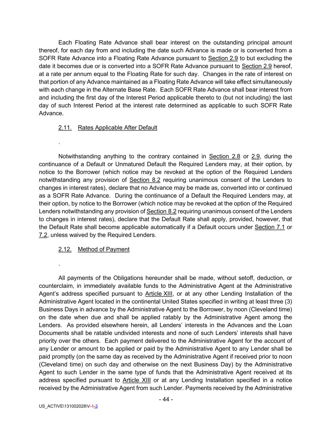 - 44 - US_ACTIVE\131002028\V-1-3 Each Floating Rate Advance shall bear interest on the outstanding principal amount thereof, for each day from and including the date such Advance is made or is converted from a SOFR Rate Advance into a Floating Rate Advance pursuant to Section 2.9 to but excluding the date it becomes due or is converted into a SOFR Rate Advance pursuant to Section 2.9 hereof, at a rate per annum equal to the Floating Rate for such day. Changes in the rate of interest on that portion of any Advance maintained as a Floating Rate Advance will take effect simultaneously with each change in the Alternate Base Rate. Each SOFR Rate Advance shall bear interest from and including the first day of the Interest Period applicable thereto to (but not including) the last day of such Interest Period at the interest rate determined as applicable to such SOFR Rate Advance. 2.11. Rates Applicable After Default . Notwithstanding anything to the contrary contained in Section 2.8 or 2.9, during the continuance of a Default or Unmatured Default the Required Lenders may, at their option, by notice to the Borrower (which notice may be revoked at the option of the Required Lenders notwithstanding any provision of Section 8.2 requiring unanimous consent of the Lenders to changes in interest rates), declare that no Advance may be made as, converted into or continued as a SOFR Rate Advance. During the continuance of a Default the Required Lenders may, at their option, by notice to the Borrower (which notice may be revoked at the option of the Required Lenders notwithstanding any provision of Section 8.2 requiring unanimous consent of the Lenders to changes in interest rates), declare that the Default Rate shall apply, provided, however, that the Default Rate shall become applicable automatically if a Default occurs under Section 7.1 or 7.2, unless waived by the Required Lenders. 2.12. Method of Payment . All payments of the Obligations hereunder shall be made, without setoff, deduction, or counterclaim, in immediately available funds to the Administrative Agent at the Administrative Agent’s address specified pursuant to Article XIII, or at any other Lending Installation of the Administrative Agent located in the continental United States specified in writing at least three (3) Business Days in advance by the Administrative Agent to the Borrower, by noon (Cleveland time) on the date when due and shall be applied ratably by the Administrative Agent among the Lenders. As provided elsewhere herein, all Lenders’ interests in the Advances and the Loan Documents shall be ratable undivided interests and none of such Lenders’ interests shall have priority over the others. Each payment delivered to the Administrative Agent for the account of any Lender or amount to be applied or paid by the Administrative Agent to any Lender shall be paid promptly (on the same day as received by the Administrative Agent if received prior to noon (Cleveland time) on such day and otherwise on the next Business Day) by the Administrative Agent to such Lender in the same type of funds that the Administrative Agent received at its address specified pursuant to Article XIII or at any Lending Installation specified in a notice received by the Administrative Agent from such Lender. Payments received by the Administrative