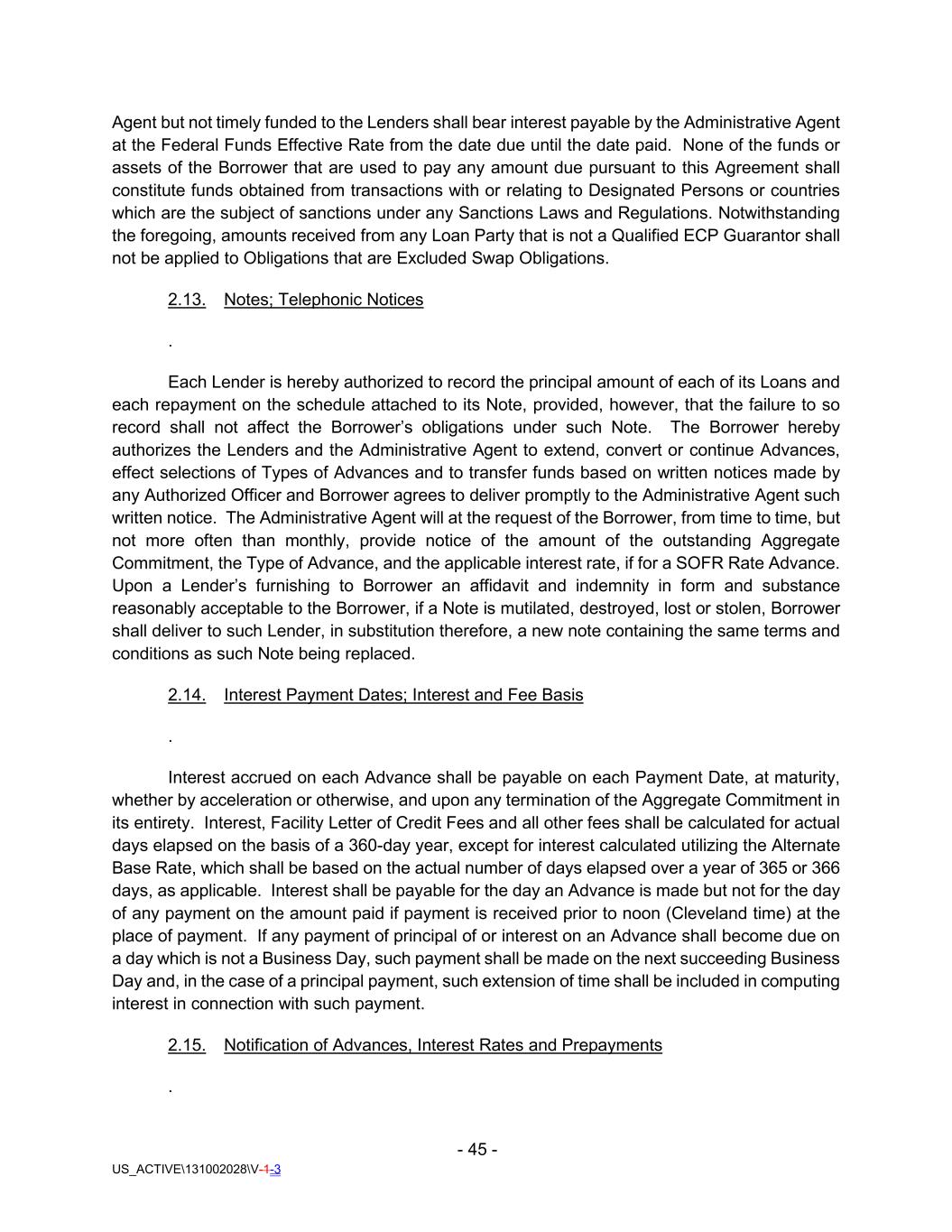 - 45 - US_ACTIVE\131002028\V-1-3 Agent but not timely funded to the Lenders shall bear interest payable by the Administrative Agent at the Federal Funds Effective Rate from the date due until the date paid. None of the funds or assets of the Borrower that are used to pay any amount due pursuant to this Agreement shall constitute funds obtained from transactions with or relating to Designated Persons or countries which are the subject of sanctions under any Sanctions Laws and Regulations. Notwithstanding the foregoing, amounts received from any Loan Party that is not a Qualified ECP Guarantor shall not be applied to Obligations that are Excluded Swap Obligations. 2.13. Notes; Telephonic Notices . Each Lender is hereby authorized to record the principal amount of each of its Loans and each repayment on the schedule attached to its Note, provided, however, that the failure to so record shall not affect the Borrower’s obligations under such Note. The Borrower hereby authorizes the Lenders and the Administrative Agent to extend, convert or continue Advances, effect selections of Types of Advances and to transfer funds based on written notices made by any Authorized Officer and Borrower agrees to deliver promptly to the Administrative Agent such written notice. The Administrative Agent will at the request of the Borrower, from time to time, but not more often than monthly, provide notice of the amount of the outstanding Aggregate Commitment, the Type of Advance, and the applicable interest rate, if for a SOFR Rate Advance. Upon a Lender’s furnishing to Borrower an affidavit and indemnity in form and substance reasonably acceptable to the Borrower, if a Note is mutilated, destroyed, lost or stolen, Borrower shall deliver to such Lender, in substitution therefore, a new note containing the same terms and conditions as such Note being replaced. 2.14. Interest Payment Dates; Interest and Fee Basis . Interest accrued on each Advance shall be payable on each Payment Date, at maturity, whether by acceleration or otherwise, and upon any termination of the Aggregate Commitment in its entirety. Interest, Facility Letter of Credit Fees and all other fees shall be calculated for actual days elapsed on the basis of a 360-day year, except for interest calculated utilizing the Alternate Base Rate, which shall be based on the actual number of days elapsed over a year of 365 or 366 days, as applicable. Interest shall be payable for the day an Advance is made but not for the day of any payment on the amount paid if payment is received prior to noon (Cleveland time) at the place of payment. If any payment of principal of or interest on an Advance shall become due on a day which is not a Business Day, such payment shall be made on the next succeeding Business Day and, in the case of a principal payment, such extension of time shall be included in computing interest in connection with such payment. 2.15. Notification of Advances, Interest Rates and Prepayments .