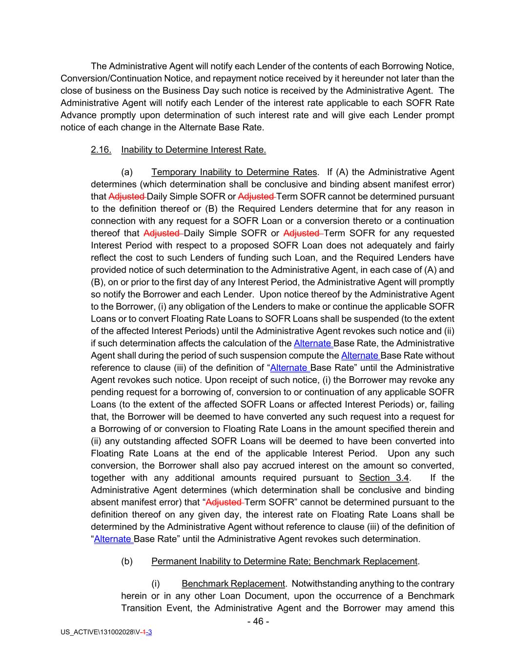 - 46 - US_ACTIVE\131002028\V-1-3 The Administrative Agent will notify each Lender of the contents of each Borrowing Notice, Conversion/Continuation Notice, and repayment notice received by it hereunder not later than the close of business on the Business Day such notice is received by the Administrative Agent. The Administrative Agent will notify each Lender of the interest rate applicable to each SOFR Rate Advance promptly upon determination of such interest rate and will give each Lender prompt notice of each change in the Alternate Base Rate. 2.16. Inability to Determine Interest Rate. (a) Temporary Inability to Determine Rates. If (A) the Administrative Agent determines (which determination shall be conclusive and binding absent manifest error) that Adjusted Daily Simple SOFR or Adjusted Term SOFR cannot be determined pursuant to the definition thereof or (B) the Required Lenders determine that for any reason in connection with any request for a SOFR Loan or a conversion thereto or a continuation thereof that Adjusted Daily Simple SOFR or Adjusted Term SOFR for any requested Interest Period with respect to a proposed SOFR Loan does not adequately and fairly reflect the cost to such Lenders of funding such Loan, and the Required Lenders have provided notice of such determination to the Administrative Agent, in each case of (A) and (B), on or prior to the first day of any Interest Period, the Administrative Agent will promptly so notify the Borrower and each Lender. Upon notice thereof by the Administrative Agent to the Borrower, (i) any obligation of the Lenders to make or continue the applicable SOFR Loans or to convert Floating Rate Loans to SOFR Loans shall be suspended (to the extent of the affected Interest Periods) until the Administrative Agent revokes such notice and (ii) if such determination affects the calculation of the Alternate Base Rate, the Administrative Agent shall during the period of such suspension compute the Alternate Base Rate without reference to clause (iii) of the definition of “Alternate Base Rate” until the Administrative Agent revokes such notice. Upon receipt of such notice, (i) the Borrower may revoke any pending request for a borrowing of, conversion to or continuation of any applicable SOFR Loans (to the extent of the affected SOFR Loans or affected Interest Periods) or, failing that, the Borrower will be deemed to have converted any such request into a request for a Borrowing of or conversion to Floating Rate Loans in the amount specified therein and (ii) any outstanding affected SOFR Loans will be deemed to have been converted into Floating Rate Loans at the end of the applicable Interest Period. Upon any such conversion, the Borrower shall also pay accrued interest on the amount so converted, together with any additional amounts required pursuant to Section 3.4. If the Administrative Agent determines (which determination shall be conclusive and binding absent manifest error) that “Adjusted Term SOFR” cannot be determined pursuant to the definition thereof on any given day, the interest rate on Floating Rate Loans shall be determined by the Administrative Agent without reference to clause (iii) of the definition of “Alternate Base Rate” until the Administrative Agent revokes such determination. (b) Permanent Inability to Determine Rate; Benchmark Replacement. (i) Benchmark Replacement. Notwithstanding anything to the contrary herein or in any other Loan Document, upon the occurrence of a Benchmark Transition Event, the Administrative Agent and the Borrower may amend this