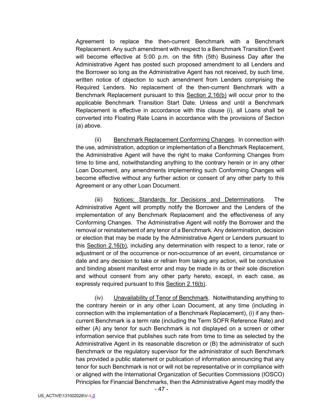 - 47 - US_ACTIVE\131002028\V-1-3 Agreement to replace the then-current Benchmark with a Benchmark Replacement. Any such amendment with respect to a Benchmark Transition Event will become effective at 5:00 p.m. on the fifth (5th) Business Day after the Administrative Agent has posted such proposed amendment to all Lenders and the Borrower so long as the Administrative Agent has not received, by such time, written notice of objection to such amendment from Lenders comprising the Required Lenders. No replacement of the then-current Benchmark with a Benchmark Replacement pursuant to this Section 2.16(b) will occur prior to the applicable Benchmark Transition Start Date. Unless and until a Benchmark Replacement is effective in accordance with this clause (i), all Loans shall be converted into Floating Rate Loans in accordance with the provisions of Section (a) above. (ii) Benchmark Replacement Conforming Changes. In connection with the use, administration, adoption or implementation of a Benchmark Replacement, the Administrative Agent will have the right to make Conforming Changes from time to time and, notwithstanding anything to the contrary herein or in any other Loan Document, any amendments implementing such Conforming Changes will become effective without any further action or consent of any other party to this Agreement or any other Loan Document. (iii) Notices; Standards for Decisions and Determinations. The Administrative Agent will promptly notify the Borrower and the Lenders of the implementation of any Benchmark Replacement and the effectiveness of any Conforming Changes. The Administrative Agent will notify the Borrower and the removal or reinstatement of any tenor of a Benchmark. Any determination, decision or election that may be made by the Administrative Agent or Lenders pursuant to this Section 2.16(b), including any determination with respect to a tenor, rate or adjustment or of the occurrence or non-occurrence of an event, circumstance or date and any decision to take or refrain from taking any action, will be conclusive and binding absent manifest error and may be made in its or their sole discretion and without consent from any other party hereto, except, in each case, as expressly required pursuant to this Section 2.16(b). (iv) Unavailability of Tenor of Benchmark. Notwithstanding anything to the contrary herein or in any other Loan Document, at any time (including in connection with the implementation of a Benchmark Replacement), (i) if any then- current Benchmark is a term rate (including the Term SOFR Reference Rate) and either (A) any tenor for such Benchmark is not displayed on a screen or other information service that publishes such rate from time to time as selected by the Administrative Agent in its reasonable discretion or (B) the administrator of such Benchmark or the regulatory supervisor for the administrator of such Benchmark has provided a public statement or publication of information announcing that any tenor for such Benchmark is not or will not be representative or in compliance with or aligned with the International Organization of Securities Commissions (IOSCO) Principles for Financial Benchmarks, then the Administrative Agent may modify the
