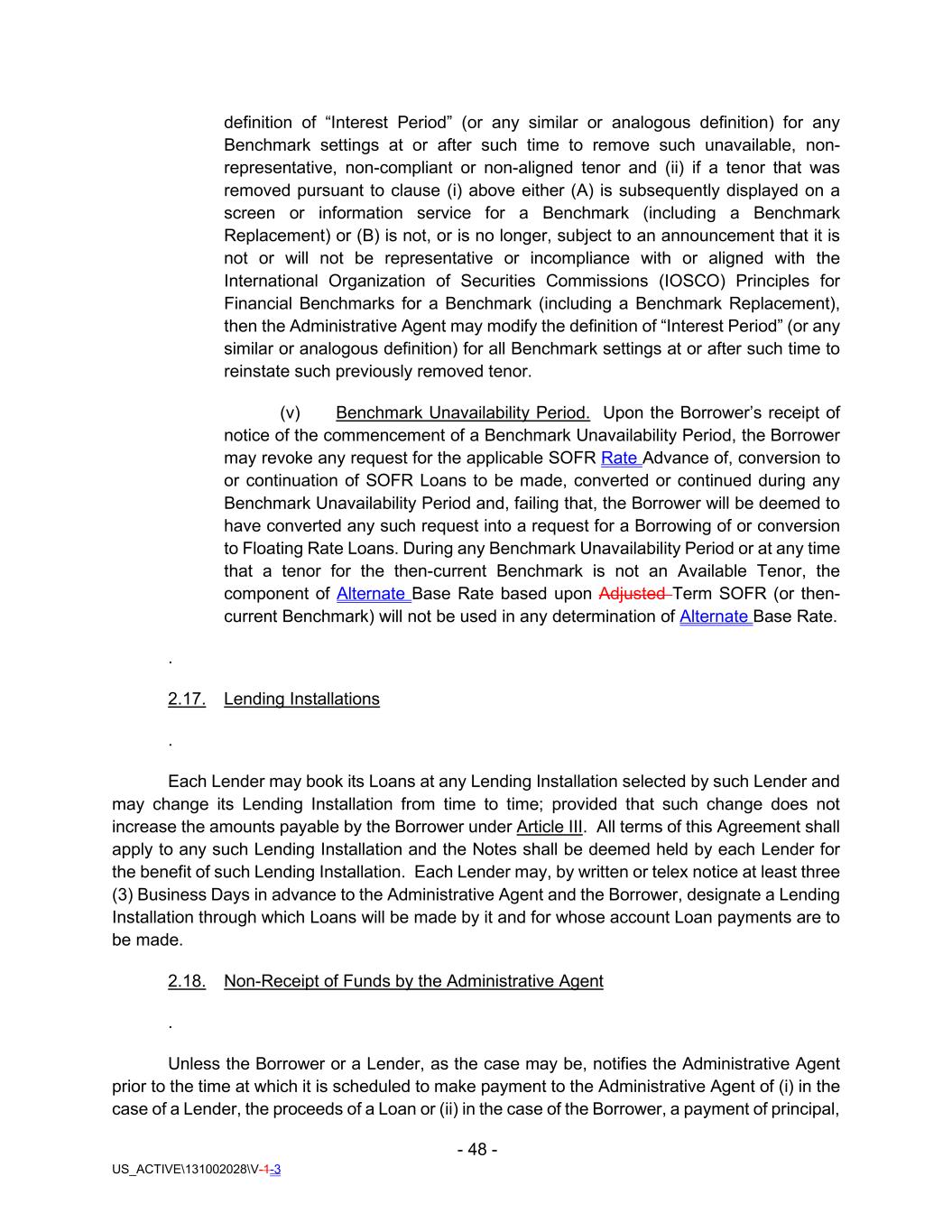 - 48 - US_ACTIVE\131002028\V-1-3 definition of “Interest Period” (or any similar or analogous definition) for any Benchmark settings at or after such time to remove such unavailable, non- representative, non-compliant or non-aligned tenor and (ii) if a tenor that was removed pursuant to clause (i) above either (A) is subsequently displayed on a screen or information service for a Benchmark (including a Benchmark Replacement) or (B) is not, or is no longer, subject to an announcement that it is not or will not be representative or incompliance with or aligned with the International Organization of Securities Commissions (IOSCO) Principles for Financial Benchmarks for a Benchmark (including a Benchmark Replacement), then the Administrative Agent may modify the definition of “Interest Period” (or any similar or analogous definition) for all Benchmark settings at or after such time to reinstate such previously removed tenor. (v) Benchmark Unavailability Period. Upon the Borrower’s receipt of notice of the commencement of a Benchmark Unavailability Period, the Borrower may revoke any request for the applicable SOFR Rate Advance of, conversion to or continuation of SOFR Loans to be made, converted or continued during any Benchmark Unavailability Period and, failing that, the Borrower will be deemed to have converted any such request into a request for a Borrowing of or conversion to Floating Rate Loans. During any Benchmark Unavailability Period or at any time that a tenor for the then-current Benchmark is not an Available Tenor, the component of Alternate Base Rate based upon Adjusted Term SOFR (or then- current Benchmark) will not be used in any determination of Alternate Base Rate. . 2.17. Lending Installations . Each Lender may book its Loans at any Lending Installation selected by such Lender and may change its Lending Installation from time to time; provided that such change does not increase the amounts payable by the Borrower under Article III. All terms of this Agreement shall apply to any such Lending Installation and the Notes shall be deemed held by each Lender for the benefit of such Lending Installation. Each Lender may, by written or telex notice at least three (3) Business Days in advance to the Administrative Agent and the Borrower, designate a Lending Installation through which Loans will be made by it and for whose account Loan payments are to be made. 2.18. Non-Receipt of Funds by the Administrative Agent . Unless the Borrower or a Lender, as the case may be, notifies the Administrative Agent prior to the time at which it is scheduled to make payment to the Administrative Agent of (i) in the case of a Lender, the proceeds of a Loan or (ii) in the case of the Borrower, a payment of principal,