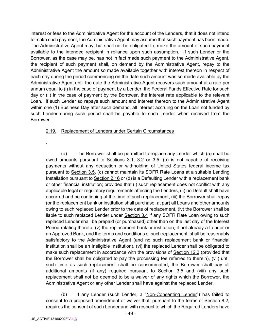- 49 - US_ACTIVE\131002028\V-1-3 interest or fees to the Administrative Agent for the account of the Lenders, that it does not intend to make such payment, the Administrative Agent may assume that such payment has been made. The Administrative Agent may, but shall not be obligated to, make the amount of such payment available to the intended recipient in reliance upon such assumption. If such Lender or the Borrower, as the case may be, has not in fact made such payment to the Administrative Agent, the recipient of such payment shall, on demand by the Administrative Agent, repay to the Administrative Agent the amount so made available together with interest thereon in respect of each day during the period commencing on the date such amount was so made available by the Administrative Agent until the date the Administrative Agent recovers such amount at a rate per annum equal to (i) in the case of payment by a Lender, the Federal Funds Effective Rate for such day or (ii) in the case of payment by the Borrower, the interest rate applicable to the relevant Loan. If such Lender so repays such amount and interest thereon to the Administrative Agent within one (1) Business Day after such demand, all interest accruing on the Loan not funded by such Lender during such period shall be payable to such Lender when received from the Borrower. 2.19. Replacement of Lenders under Certain Circumstances . (a) The Borrower shall be permitted to replace any Lender which (a) shall be owed amounts pursuant to Sections 3.1, 3.2 or 3.5, (b) is not capable of receiving payments without any deduction or withholding of United States federal income tax pursuant to Section 3.5, (c) cannot maintain its SOFR Rate Loans at a suitable Lending Installation pursuant to Section 2.16 or (d) is a Defaulting Lender with a replacement bank or other financial institution; provided that (i) such replacement does not conflict with any applicable legal or regulatory requirements affecting the Lenders, (ii) no Default shall have occurred and be continuing at the time of such replacement, (iii) the Borrower shall repay (or the replacement bank or institution shall purchase, at par) all Loans and other amounts owing to such replaced Lender prior to the date of replacement, (iv) the Borrower shall be liable to such replaced Lender under Section 3.4 if any SOFR Rate Loan owing to such replaced Lender shall be prepaid (or purchased) other than on the last day of the Interest Period relating thereto, (v) the replacement bank or institution, if not already a Lender or an Approved Bank, and the terms and conditions of such replacement, shall be reasonably satisfactory to the Administrative Agent (and no such replacement bank or financial institution shall be an Ineligible Institution), (vi) the replaced Lender shall be obligated to make such replacement in accordance with the provisions of Section 12.3 (provided that the Borrower shall be obligated to pay the processing fee referred to therein), (vii) until such time as such replacement shall be consummated, the Borrower shall pay all additional amounts (if any) required pursuant to Section 3.5 and (viii) any such replacement shall not be deemed to be a waiver of any rights which the Borrower, the Administrative Agent or any other Lender shall have against the replaced Lender. (b) If any Lender (such Lender, a “Non-Consenting Lender”) has failed to consent to a proposed amendment or waiver that, pursuant to the terms of Section 8.2, requires the consent of such Lender and with respect to which the Required Lenders have