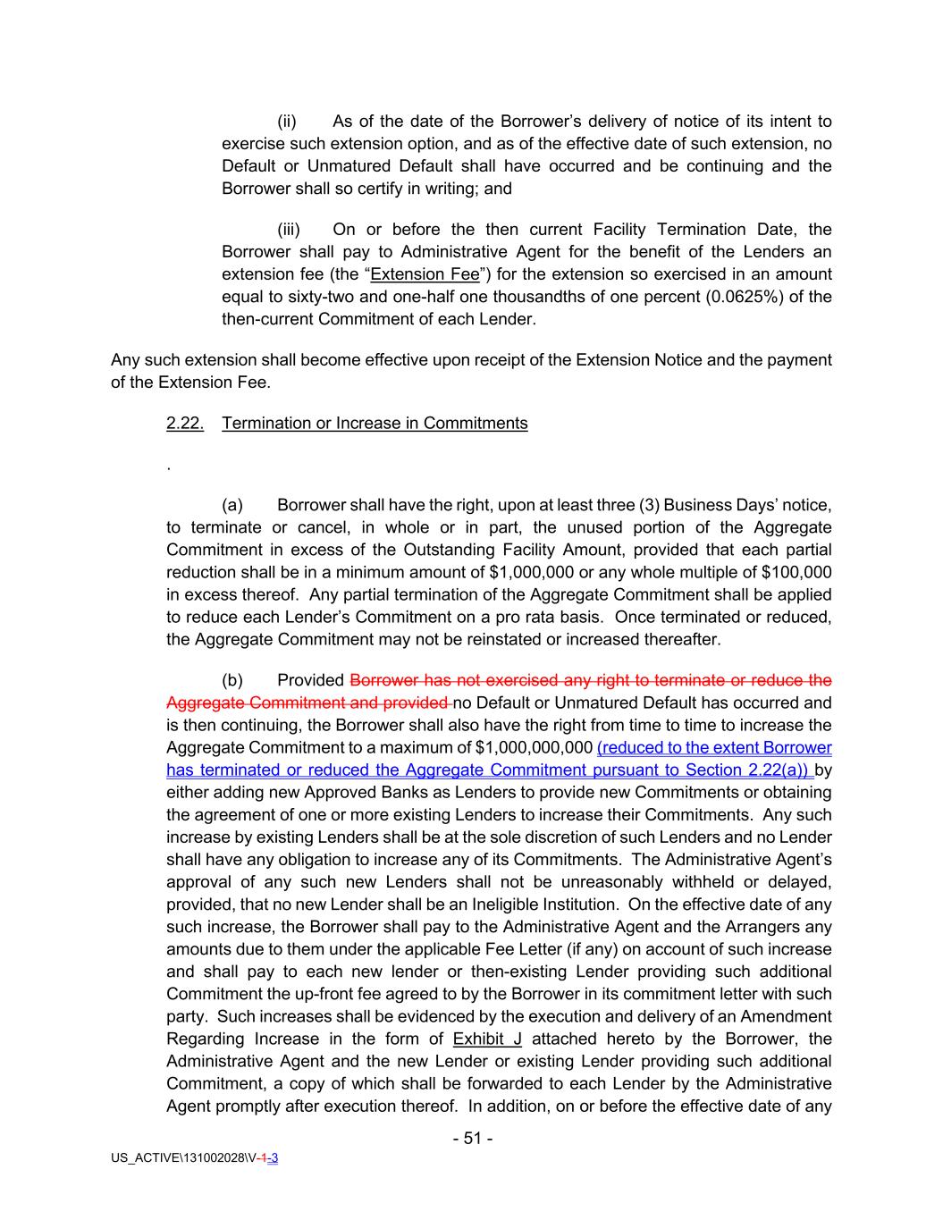 - 51 - US_ACTIVE\131002028\V-1-3 (ii) As of the date of the Borrower’s delivery of notice of its intent to exercise such extension option, and as of the effective date of such extension, no Default or Unmatured Default shall have occurred and be continuing and the Borrower shall so certify in writing; and (iii) On or before the then current Facility Termination Date, the Borrower shall pay to Administrative Agent for the benefit of the Lenders an extension fee (the “Extension Fee”) for the extension so exercised in an amount equal to sixty-two and one-half one thousandths of one percent (0.0625%) of the then-current Commitment of each Lender. Any such extension shall become effective upon receipt of the Extension Notice and the payment of the Extension Fee. 2.22. Termination or Increase in Commitments . (a) Borrower shall have the right, upon at least three (3) Business Days’ notice, to terminate or cancel, in whole or in part, the unused portion of the Aggregate Commitment in excess of the Outstanding Facility Amount, provided that each partial reduction shall be in a minimum amount of $1,000,000 or any whole multiple of $100,000 in excess thereof. Any partial termination of the Aggregate Commitment shall be applied to reduce each Lender’s Commitment on a pro rata basis. Once terminated or reduced, the Aggregate Commitment may not be reinstated or increased thereafter. (b) Provided Borrower has not exercised any right to terminate or reduce the Aggregate Commitment and provided no Default or Unmatured Default has occurred and is then continuing, the Borrower shall also have the right from time to time to increase the Aggregate Commitment to a maximum of $1,000,000,000 (reduced to the extent Borrower has terminated or reduced the Aggregate Commitment pursuant to Section 2.22(a)) by either adding new Approved Banks as Lenders to provide new Commitments or obtaining the agreement of one or more existing Lenders to increase their Commitments. Any such increase by existing Lenders shall be at the sole discretion of such Lenders and no Lender shall have any obligation to increase any of its Commitments. The Administrative Agent’s approval of any such new Lenders shall not be unreasonably withheld or delayed, provided, that no new Lender shall be an Ineligible Institution. On the effective date of any such increase, the Borrower shall pay to the Administrative Agent and the Arrangers any amounts due to them under the applicable Fee Letter (if any) on account of such increase and shall pay to each new lender or then-existing Lender providing such additional Commitment the up-front fee agreed to by the Borrower in its commitment letter with such party. Such increases shall be evidenced by the execution and delivery of an Amendment Regarding Increase in the form of Exhibit J attached hereto by the Borrower, the Administrative Agent and the new Lender or existing Lender providing such additional Commitment, a copy of which shall be forwarded to each Lender by the Administrative Agent promptly after execution thereof. In addition, on or before the effective date of any