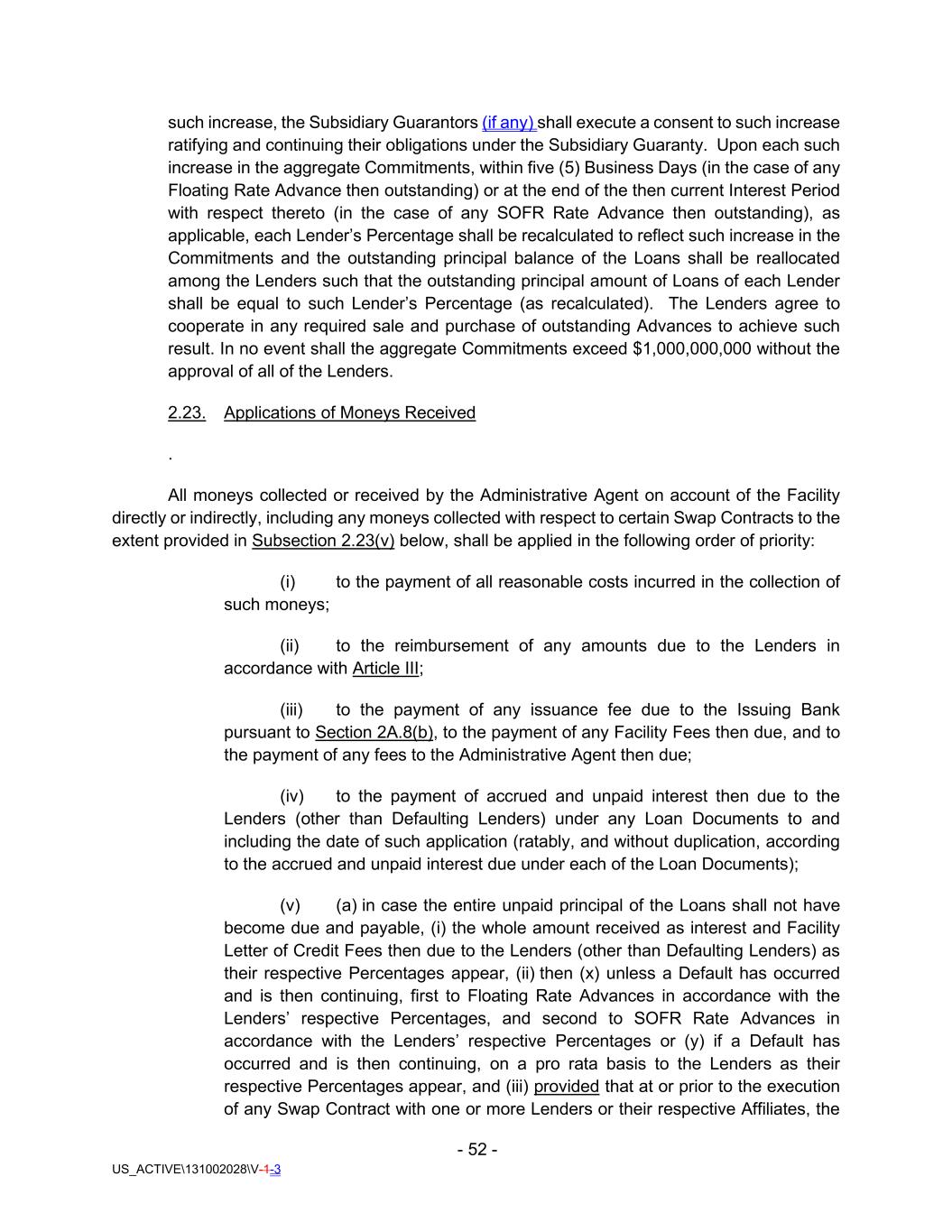 - 52 - US_ACTIVE\131002028\V-1-3 such increase, the Subsidiary Guarantors (if any) shall execute a consent to such increase ratifying and continuing their obligations under the Subsidiary Guaranty. Upon each such increase in the aggregate Commitments, within five (5) Business Days (in the case of any Floating Rate Advance then outstanding) or at the end of the then current Interest Period with respect thereto (in the case of any SOFR Rate Advance then outstanding), as applicable, each Lender’s Percentage shall be recalculated to reflect such increase in the Commitments and the outstanding principal balance of the Loans shall be reallocated among the Lenders such that the outstanding principal amount of Loans of each Lender shall be equal to such Lender’s Percentage (as recalculated). The Lenders agree to cooperate in any required sale and purchase of outstanding Advances to achieve such result. In no event shall the aggregate Commitments exceed $1,000,000,000 without the approval of all of the Lenders. 2.23. Applications of Moneys Received . All moneys collected or received by the Administrative Agent on account of the Facility directly or indirectly, including any moneys collected with respect to certain Swap Contracts to the extent provided in Subsection 2.23(v) below, shall be applied in the following order of priority: (i) to the payment of all reasonable costs incurred in the collection of such moneys; (ii) to the reimbursement of any amounts due to the Lenders in accordance with Article III; (iii) to the payment of any issuance fee due to the Issuing Bank pursuant to Section 2A.8(b), to the payment of any Facility Fees then due, and to the payment of any fees to the Administrative Agent then due; (iv) to the payment of accrued and unpaid interest then due to the Lenders (other than Defaulting Lenders) under any Loan Documents to and including the date of such application (ratably, and without duplication, according to the accrued and unpaid interest due under each of the Loan Documents); (v) (a) in case the entire unpaid principal of the Loans shall not have become due and payable, (i) the whole amount received as interest and Facility Letter of Credit Fees then due to the Lenders (other than Defaulting Lenders) as their respective Percentages appear, (ii) then (x) unless a Default has occurred and is then continuing, first to Floating Rate Advances in accordance with the Lenders’ respective Percentages, and second to SOFR Rate Advances in accordance with the Lenders’ respective Percentages or (y) if a Default has occurred and is then continuing, on a pro rata basis to the Lenders as their respective Percentages appear, and (iii) provided that at or prior to the execution of any Swap Contract with one or more Lenders or their respective Affiliates, the