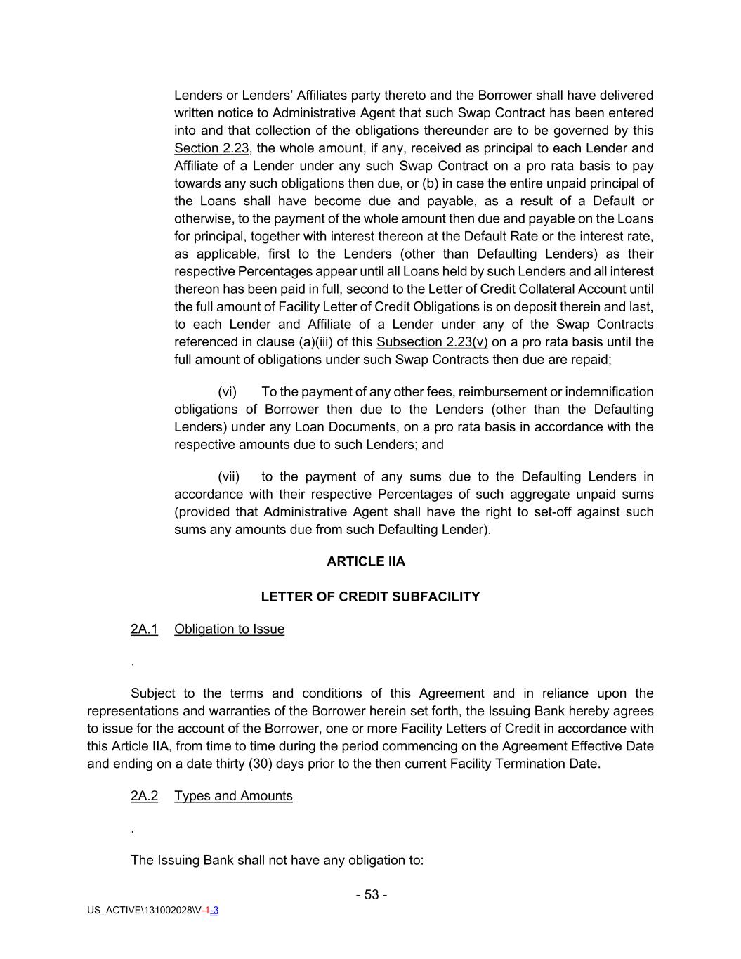 - 53 - US_ACTIVE\131002028\V-1-3 Lenders or Lenders’ Affiliates party thereto and the Borrower shall have delivered written notice to Administrative Agent that such Swap Contract has been entered into and that collection of the obligations thereunder are to be governed by this Section 2.23, the whole amount, if any, received as principal to each Lender and Affiliate of a Lender under any such Swap Contract on a pro rata basis to pay towards any such obligations then due, or (b) in case the entire unpaid principal of the Loans shall have become due and payable, as a result of a Default or otherwise, to the payment of the whole amount then due and payable on the Loans for principal, together with interest thereon at the Default Rate or the interest rate, as applicable, first to the Lenders (other than Defaulting Lenders) as their respective Percentages appear until all Loans held by such Lenders and all interest thereon has been paid in full, second to the Letter of Credit Collateral Account until the full amount of Facility Letter of Credit Obligations is on deposit therein and last, to each Lender and Affiliate of a Lender under any of the Swap Contracts referenced in clause (a)(iii) of this Subsection 2.23(v) on a pro rata basis until the full amount of obligations under such Swap Contracts then due are repaid; (vi) To the payment of any other fees, reimbursement or indemnification obligations of Borrower then due to the Lenders (other than the Defaulting Lenders) under any Loan Documents, on a pro rata basis in accordance with the respective amounts due to such Lenders; and (vii) to the payment of any sums due to the Defaulting Lenders in accordance with their respective Percentages of such aggregate unpaid sums (provided that Administrative Agent shall have the right to set-off against such sums any amounts due from such Defaulting Lender). ARTICLE IIA LETTER OF CREDIT SUBFACILITY 2A.1 Obligation to Issue . Subject to the terms and conditions of this Agreement and in reliance upon the representations and warranties of the Borrower herein set forth, the Issuing Bank hereby agrees to issue for the account of the Borrower, one or more Facility Letters of Credit in accordance with this Article IIA, from time to time during the period commencing on the Agreement Effective Date and ending on a date thirty (30) days prior to the then current Facility Termination Date. 2A.2 Types and Amounts . The Issuing Bank shall not have any obligation to: