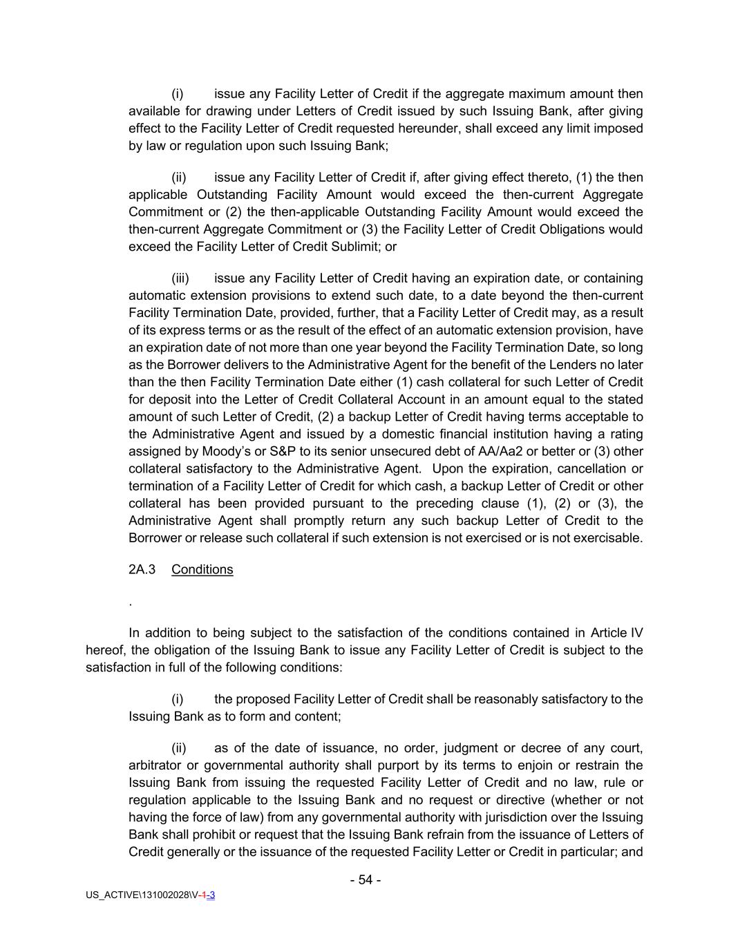 - 54 - US_ACTIVE\131002028\V-1-3 (i) issue any Facility Letter of Credit if the aggregate maximum amount then available for drawing under Letters of Credit issued by such Issuing Bank, after giving effect to the Facility Letter of Credit requested hereunder, shall exceed any limit imposed by law or regulation upon such Issuing Bank; (ii) issue any Facility Letter of Credit if, after giving effect thereto, (1) the then applicable Outstanding Facility Amount would exceed the then-current Aggregate Commitment or (2) the then-applicable Outstanding Facility Amount would exceed the then-current Aggregate Commitment or (3) the Facility Letter of Credit Obligations would exceed the Facility Letter of Credit Sublimit; or (iii) issue any Facility Letter of Credit having an expiration date, or containing automatic extension provisions to extend such date, to a date beyond the then-current Facility Termination Date, provided, further, that a Facility Letter of Credit may, as a result of its express terms or as the result of the effect of an automatic extension provision, have an expiration date of not more than one year beyond the Facility Termination Date, so long as the Borrower delivers to the Administrative Agent for the benefit of the Lenders no later than the then Facility Termination Date either (1) cash collateral for such Letter of Credit for deposit into the Letter of Credit Collateral Account in an amount equal to the stated amount of such Letter of Credit, (2) a backup Letter of Credit having terms acceptable to the Administrative Agent and issued by a domestic financial institution having a rating assigned by Moody’s or S&P to its senior unsecured debt of AA/Aa2 or better or (3) other collateral satisfactory to the Administrative Agent. Upon the expiration, cancellation or termination of a Facility Letter of Credit for which cash, a backup Letter of Credit or other collateral has been provided pursuant to the preceding clause (1), (2) or (3), the Administrative Agent shall promptly return any such backup Letter of Credit to the Borrower or release such collateral if such extension is not exercised or is not exercisable. 2A.3 Conditions . In addition to being subject to the satisfaction of the conditions contained in Article IV hereof, the obligation of the Issuing Bank to issue any Facility Letter of Credit is subject to the satisfaction in full of the following conditions: (i) the proposed Facility Letter of Credit shall be reasonably satisfactory to the Issuing Bank as to form and content; (ii) as of the date of issuance, no order, judgment or decree of any court, arbitrator or governmental authority shall purport by its terms to enjoin or restrain the Issuing Bank from issuing the requested Facility Letter of Credit and no law, rule or regulation applicable to the Issuing Bank and no request or directive (whether or not having the force of law) from any governmental authority with jurisdiction over the Issuing Bank shall prohibit or request that the Issuing Bank refrain from the issuance of Letters of Credit generally or the issuance of the requested Facility Letter or Credit in particular; and