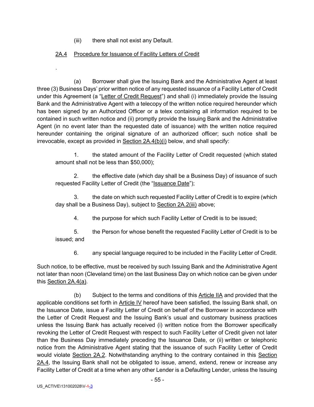 - 55 - US_ACTIVE\131002028\V-1-3 (iii) there shall not exist any Default. 2A.4 Procedure for Issuance of Facility Letters of Credit . (a) Borrower shall give the Issuing Bank and the Administrative Agent at least three (3) Business Days’ prior written notice of any requested issuance of a Facility Letter of Credit under this Agreement (a “Letter of Credit Request”) and shall (i) immediately provide the Issuing Bank and the Administrative Agent with a telecopy of the written notice required hereunder which has been signed by an Authorized Officer or a telex containing all information required to be contained in such written notice and (ii) promptly provide the Issuing Bank and the Administrative Agent (in no event later than the requested date of issuance) with the written notice required hereunder containing the original signature of an authorized officer; such notice shall be irrevocable, except as provided in Section 2A.4(b)(i) below, and shall specify: 1. the stated amount of the Facility Letter of Credit requested (which stated amount shall not be less than $50,000); 2. the effective date (which day shall be a Business Day) of issuance of such requested Facility Letter of Credit (the “Issuance Date”); 3. the date on which such requested Facility Letter of Credit is to expire (which day shall be a Business Day), subject to Section 2A.2(iii) above; 4. the purpose for which such Facility Letter of Credit is to be issued; 5. the Person for whose benefit the requested Facility Letter of Credit is to be issued; and 6. any special language required to be included in the Facility Letter of Credit. Such notice, to be effective, must be received by such Issuing Bank and the Administrative Agent not later than noon (Cleveland time) on the last Business Day on which notice can be given under this Section 2A.4(a). (b) Subject to the terms and conditions of this Article IIA and provided that the applicable conditions set forth in Article IV hereof have been satisfied, the Issuing Bank shall, on the Issuance Date, issue a Facility Letter of Credit on behalf of the Borrower in accordance with the Letter of Credit Request and the Issuing Bank’s usual and customary business practices unless the Issuing Bank has actually received (i) written notice from the Borrower specifically revoking the Letter of Credit Request with respect to such Facility Letter of Credit given not later than the Business Day immediately preceding the Issuance Date, or (ii) written or telephonic notice from the Administrative Agent stating that the issuance of such Facility Letter of Credit would violate Section 2A.2. Notwithstanding anything to the contrary contained in this Section 2A.4, the Issuing Bank shall not be obligated to issue, amend, extend, renew or increase any Facility Letter of Credit at a time when any other Lender is a Defaulting Lender, unless the Issuing