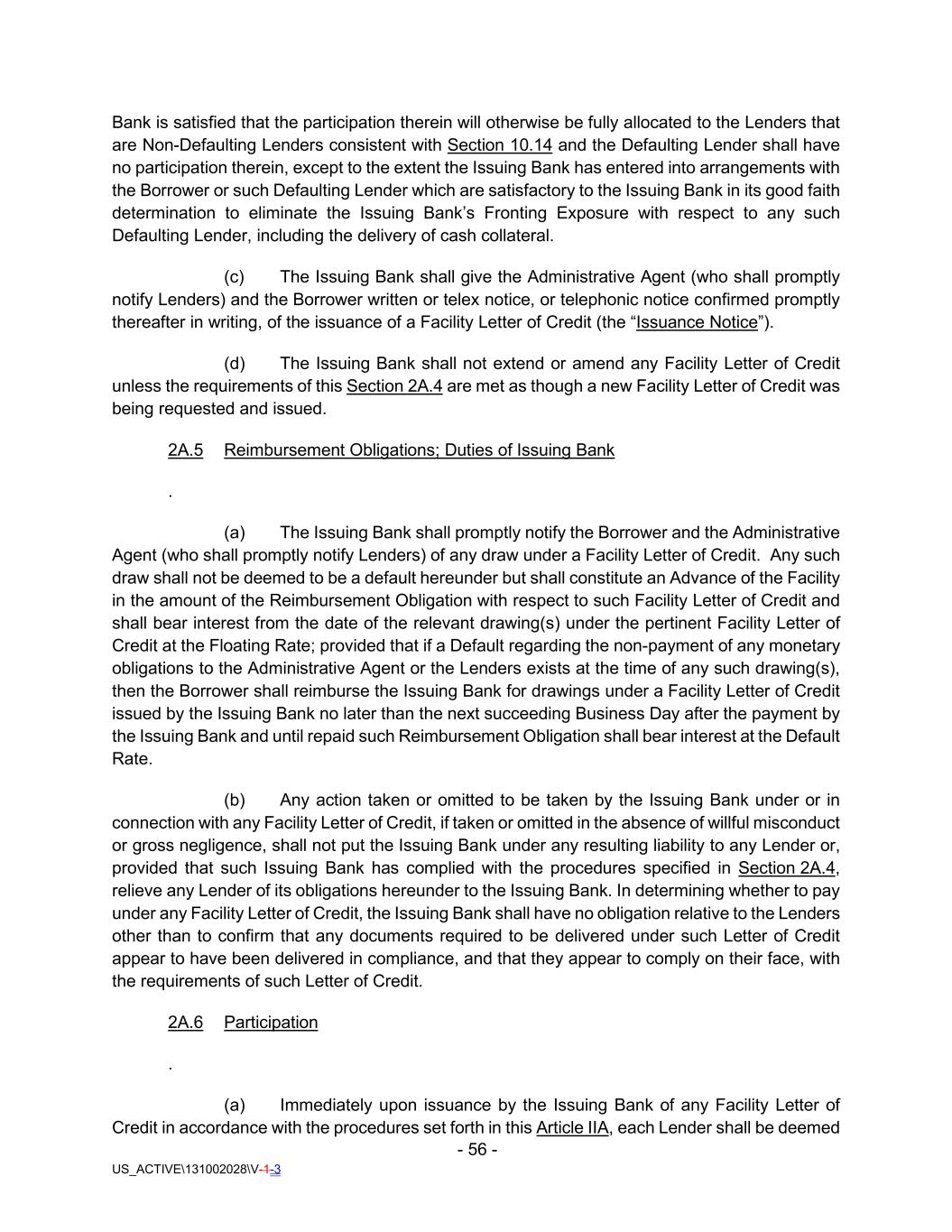 - 56 - US_ACTIVE\131002028\V-1-3 Bank is satisfied that the participation therein will otherwise be fully allocated to the Lenders that are Non-Defaulting Lenders consistent with Section 10.14 and the Defaulting Lender shall have no participation therein, except to the extent the Issuing Bank has entered into arrangements with the Borrower or such Defaulting Lender which are satisfactory to the Issuing Bank in its good faith determination to eliminate the Issuing Bank’s Fronting Exposure with respect to any such Defaulting Lender, including the delivery of cash collateral. (c) The Issuing Bank shall give the Administrative Agent (who shall promptly notify Lenders) and the Borrower written or telex notice, or telephonic notice confirmed promptly thereafter in writing, of the issuance of a Facility Letter of Credit (the “Issuance Notice”). (d) The Issuing Bank shall not extend or amend any Facility Letter of Credit unless the requirements of this Section 2A.4 are met as though a new Facility Letter of Credit was being requested and issued. 2A.5 Reimbursement Obligations; Duties of Issuing Bank . (a) The Issuing Bank shall promptly notify the Borrower and the Administrative Agent (who shall promptly notify Lenders) of any draw under a Facility Letter of Credit. Any such draw shall not be deemed to be a default hereunder but shall constitute an Advance of the Facility in the amount of the Reimbursement Obligation with respect to such Facility Letter of Credit and shall bear interest from the date of the relevant drawing(s) under the pertinent Facility Letter of Credit at the Floating Rate; provided that if a Default regarding the non-payment of any monetary obligations to the Administrative Agent or the Lenders exists at the time of any such drawing(s), then the Borrower shall reimburse the Issuing Bank for drawings under a Facility Letter of Credit issued by the Issuing Bank no later than the next succeeding Business Day after the payment by the Issuing Bank and until repaid such Reimbursement Obligation shall bear interest at the Default Rate. (b) Any action taken or omitted to be taken by the Issuing Bank under or in connection with any Facility Letter of Credit, if taken or omitted in the absence of willful misconduct or gross negligence, shall not put the Issuing Bank under any resulting liability to any Lender or, provided that such Issuing Bank has complied with the procedures specified in Section 2A.4, relieve any Lender of its obligations hereunder to the Issuing Bank. In determining whether to pay under any Facility Letter of Credit, the Issuing Bank shall have no obligation relative to the Lenders other than to confirm that any documents required to be delivered under such Letter of Credit appear to have been delivered in compliance, and that they appear to comply on their face, with the requirements of such Letter of Credit. 2A.6 Participation . (a) Immediately upon issuance by the Issuing Bank of any Facility Letter of Credit in accordance with the procedures set forth in this Article IIA, each Lender shall be deemed