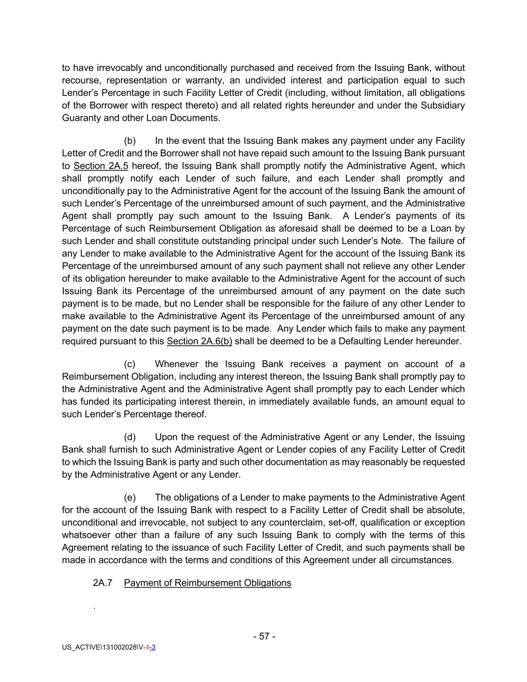 - 57 - US_ACTIVE\131002028\V-1-3 to have irrevocably and unconditionally purchased and received from the Issuing Bank, without recourse, representation or warranty, an undivided interest and participation equal to such Lender’s Percentage in such Facility Letter of Credit (including, without limitation, all obligations of the Borrower with respect thereto) and all related rights hereunder and under the Subsidiary Guaranty and other Loan Documents. (b) In the event that the Issuing Bank makes any payment under any Facility Letter of Credit and the Borrower shall not have repaid such amount to the Issuing Bank pursuant to Section 2A.5 hereof, the Issuing Bank shall promptly notify the Administrative Agent, which shall promptly notify each Lender of such failure, and each Lender shall promptly and unconditionally pay to the Administrative Agent for the account of the Issuing Bank the amount of such Lender’s Percentage of the unreimbursed amount of such payment, and the Administrative Agent shall promptly pay such amount to the Issuing Bank. A Lender’s payments of its Percentage of such Reimbursement Obligation as aforesaid shall be deemed to be a Loan by such Lender and shall constitute outstanding principal under such Lender’s Note. The failure of any Lender to make available to the Administrative Agent for the account of the Issuing Bank its Percentage of the unreimbursed amount of any such payment shall not relieve any other Lender of its obligation hereunder to make available to the Administrative Agent for the account of such Issuing Bank its Percentage of the unreimbursed amount of any payment on the date such payment is to be made, but no Lender shall be responsible for the failure of any other Lender to make available to the Administrative Agent its Percentage of the unreimbursed amount of any payment on the date such payment is to be made. Any Lender which fails to make any payment required pursuant to this Section 2A.6(b) shall be deemed to be a Defaulting Lender hereunder. (c) Whenever the Issuing Bank receives a payment on account of a Reimbursement Obligation, including any interest thereon, the Issuing Bank shall promptly pay to the Administrative Agent and the Administrative Agent shall promptly pay to each Lender which has funded its participating interest therein, in immediately available funds, an amount equal to such Lender’s Percentage thereof. (d) Upon the request of the Administrative Agent or any Lender, the Issuing Bank shall furnish to such Administrative Agent or Lender copies of any Facility Letter of Credit to which the Issuing Bank is party and such other documentation as may reasonably be requested by the Administrative Agent or any Lender. (e) The obligations of a Lender to make payments to the Administrative Agent for the account of the Issuing Bank with respect to a Facility Letter of Credit shall be absolute, unconditional and irrevocable, not subject to any counterclaim, set-off, qualification or exception whatsoever other than a failure of any such Issuing Bank to comply with the terms of this Agreement relating to the issuance of such Facility Letter of Credit, and such payments shall be made in accordance with the terms and conditions of this Agreement under all circumstances. 2A.7 Payment of Reimbursement Obligations .